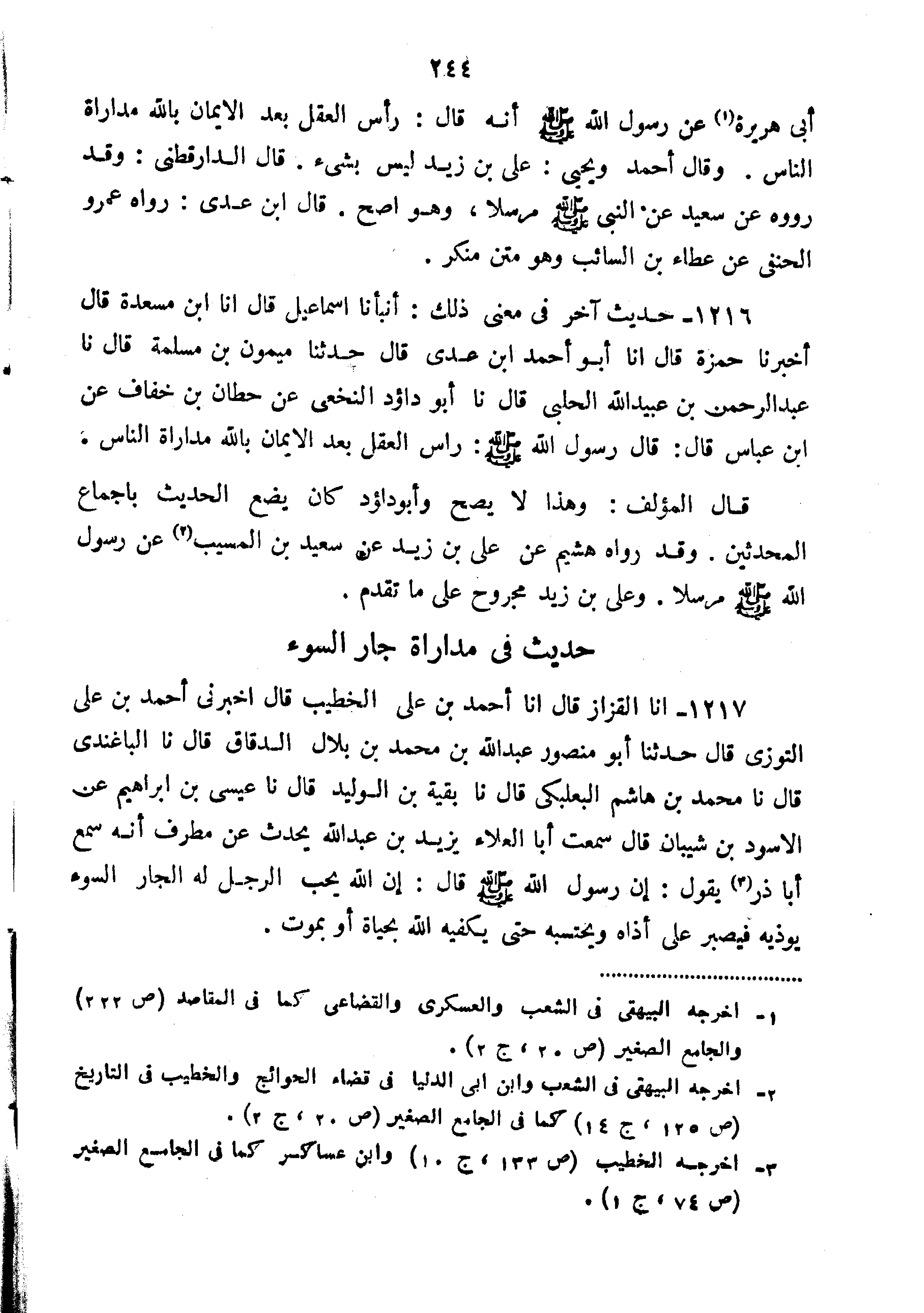 أَبِي هُرَيْرَةَ عَنْ رَسُولِ اللَّهِ صَلَّى اللَّهُ عَلَيْهِ وَسَلَّمَ أَنَّهُ قال "رَأْسُ الْعَقْلِ بَعْدَ الإِيمَانِ بِاللَّهِ مُدَارَاةُ النَّاسِ" وقال أَحْمَد: "ويحيى علي بْن زَيْد ليس بشيء قال الدارقطني وقد رووه عن سَعِيد عن النَّبِيّ صَلَّى اللَّهُ عَلَيْهِ وَسَلَّمَ مرسلًا وهو اصح".