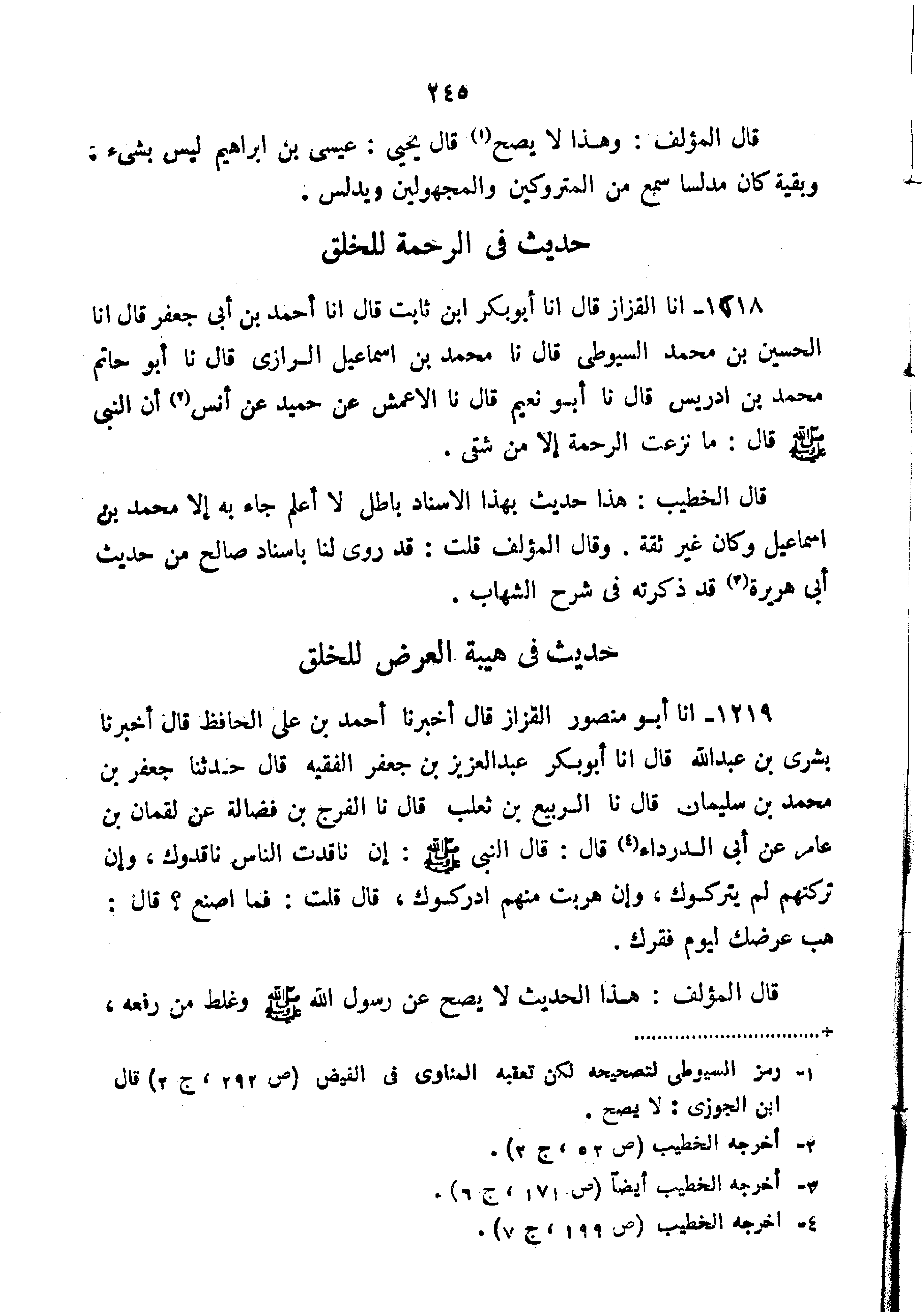 قَالَ الْمُؤَلِّفُ: "وَهَذَا لا يَصِحُّ قال يَحْيَى عِيسَى بْن إِبْرَاهِيم ليس بشيء وبقية كان مدلسًا سمع من المتروكين والمجهولين ويدلس".