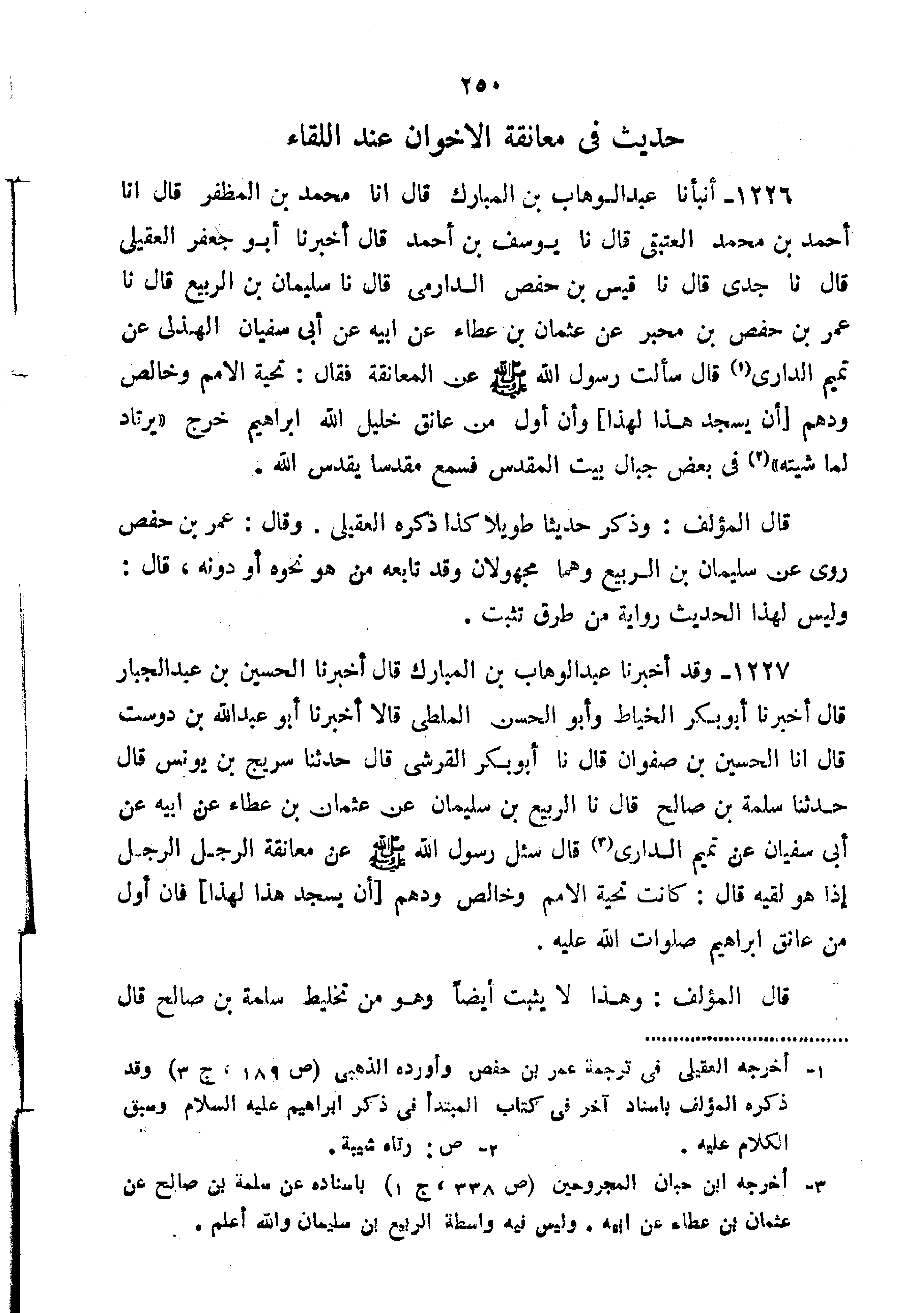 قال المؤلف: "وذكر حديثًا طويلًا كذا ذكره العقيلي وقال عُمَر بْن حَفْص رُوِيَ عن سُلَيْمَان بْن الرَّبِيع وهما مجهولان وقد تابعه من هُوَ نحوه أو دونه قال وليس لهذا الحديث رواية من طرق تثبت. 1227-وَقَدْ أَخْبَرَنَا عَبْدُ الْوَهَّابِ بْنُ الْمُبَارَكِ قَالَ أَخْبَرَنَا الْحُسَيْنُ بْنُ عَبْدِ الْجَبَّارِ قَالَ أَخْبَرَنَا أَبُو بَكْرٍ الْخَيَّاطُ وَأَبُو الْحَسَنِ الْمَلْطِيُّ قَالا أَخْبَرَنَا أَبُو عَبْدِ اللَّهِ ابن دُوسْتَ قَالَ أَنَا الْحُسَيْنُ بْنُ صَفْوَانَ قَالَ نا أَبُو بَكْرِ القرشي قال حدثنا سريج ابن يُونُسَ قَالَ حَدَّثَنَا سَلَمَةُ بْنُ صَالِحٍ قَالَ نا الرَّبِيعُ بْنُ سُلَيْمَانَ عَنْ عُثْمَانَ بْنِ عَطَاءٍ عَنْ أَبِيهِ عَنْ أَبِي سُفْيَانَ عَنْ تَمِيمٍ الدَّارِيِّ قَالَ سُئِلَ رَسُولِ اللَّهِ صَلَّى اللَّهُ عَلَيْهِ وَسَلَّمَ عَنْ مُعَانَقَةِ الرَّجُلِ الرَّجُلَ إِذَا هُوَ لَقِيَهُ قَالَ "كَانَتْ تَحِيَّةُ الأُمَمِ وَخَالِصُ وُدِّهِمْ أَنْ يَسْجُدَ هَذَا لِهَذَا فَإِنَّ أَوَّلَ مَنْ عَانَقَ إِبْرَاهِيمُ صَلَوَاتُ اللَّهِ عَلَيْهِ".