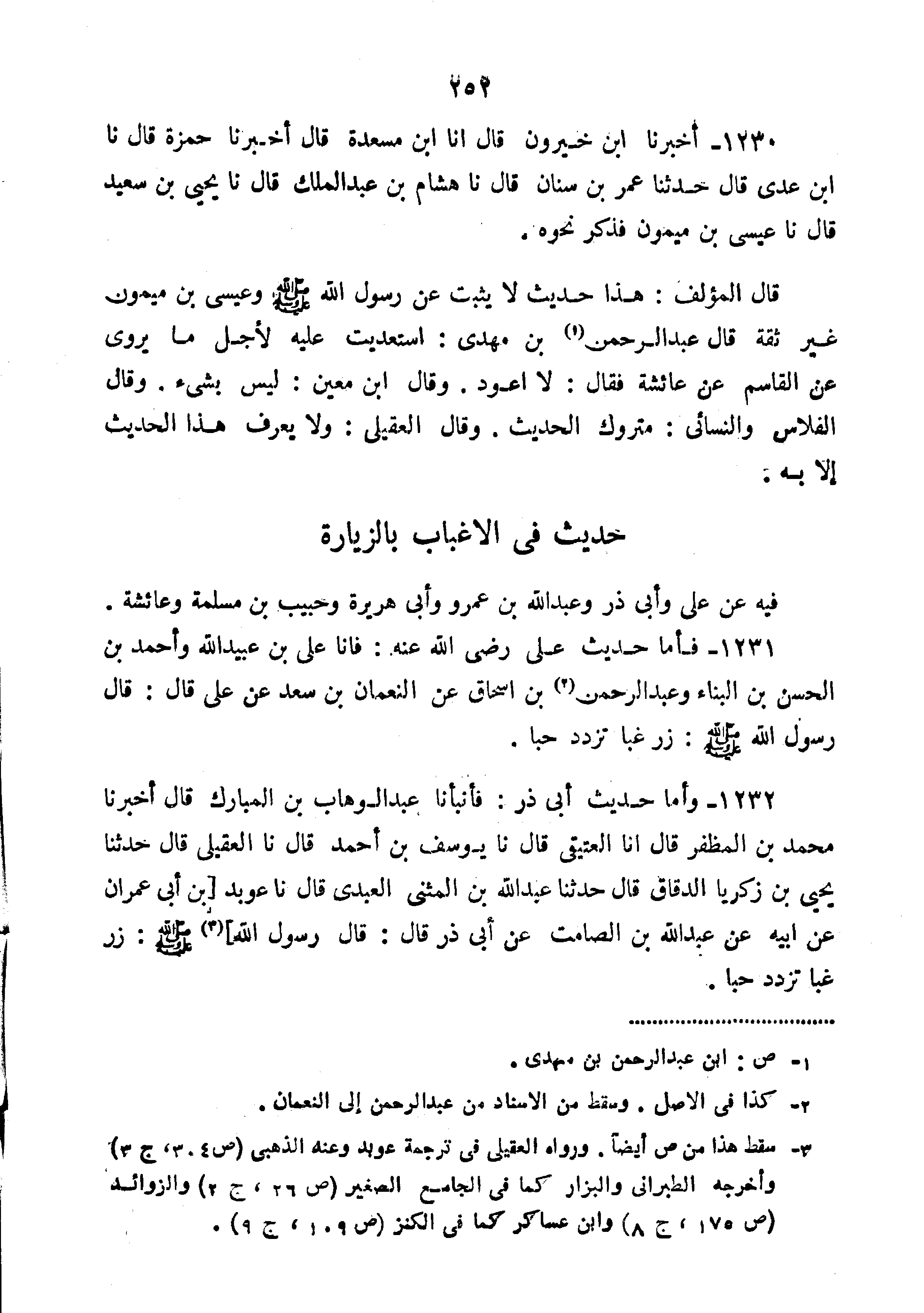 1231-فَأَمَّا حَدِيثُ عَلِيٍّ رَضِيَ اللَّهُ عَنْهُ فَأَنَا عَلِيُّ بْنُ عُبَيْدِ اللَّهِ وَأَحْمَدُ بْنُ الْحَسَنِ بْنِ الْبَنَّاءِ وَعَبْدُ الرَّحْمَنِ بْنُ إِسْحَاقَ عَنِ النُّعْمَانِ بْنِ سَعْدٍ عَنْ عَلِيٍّ قَالَ: قَالَ رَسُولُ اللَّهِ صَلَّى اللَّهُ عَلَيْهِ وَسَلَّمَ: "زُرْ غِبًّا تَزْدَدْ حُبًّا".