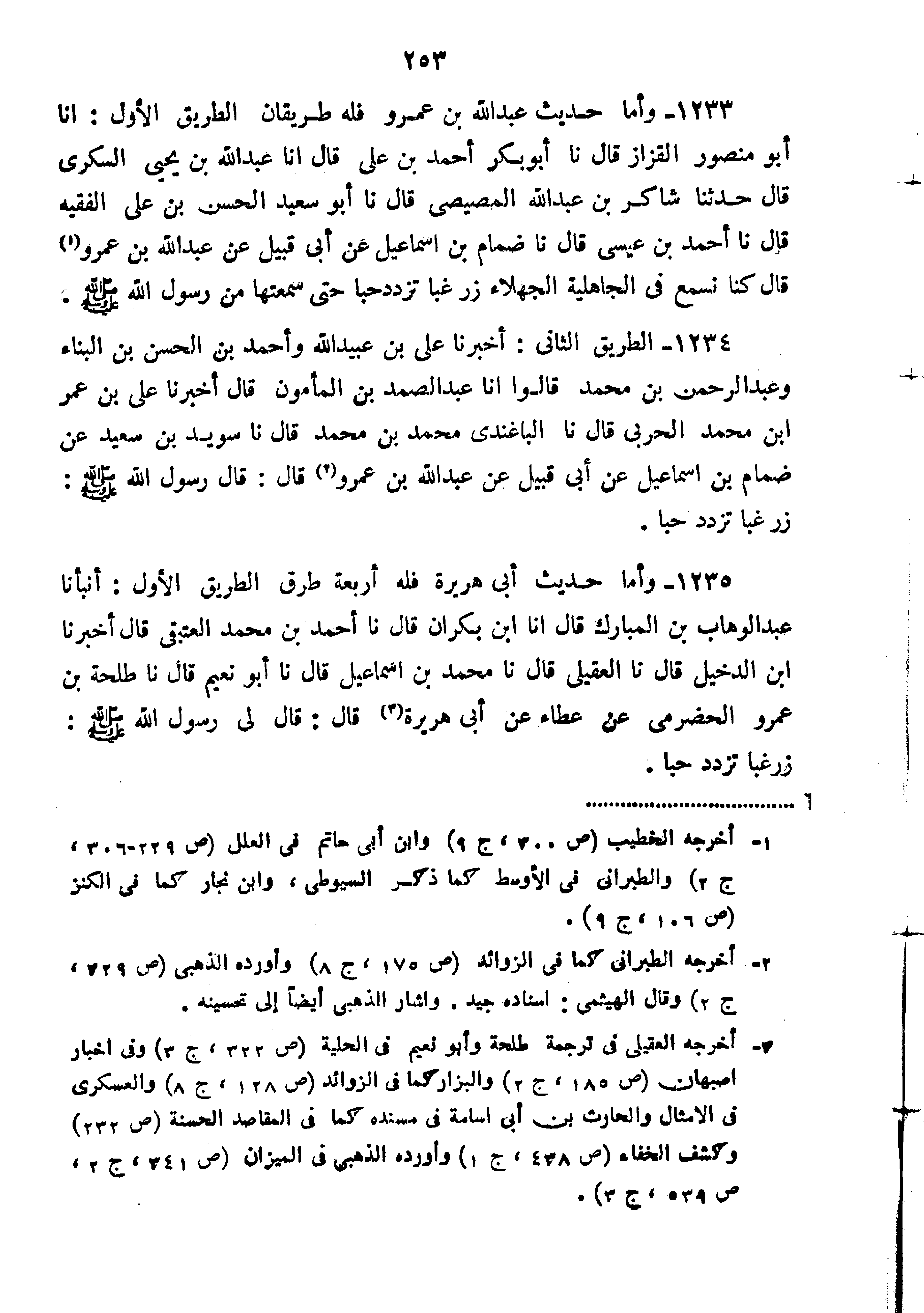 1233-وَأَمَّا حَدِيثُ عَبْدِ اللَّهِ بْنِ عَمْرٍو فَلَهُ طَرِيقَانِ الطَّرِيقُ الأَوَّلُ أَنَا أَبُو مَنْصُورٍ الْقَزَّازُ قَالَ نا أَبُو بَكْرٍ أَحْمَدُ بْنُ عَلِيٍّ قَالَ أَنَا عَبْدُ اللَّهِ بْنُ يَحْيَى السُّكَّرِيُّ قَالَ حَدَّثَنَا شَاكِرُ بْنُ عَبْدِ اللَّهِ الْمَصِيصِيُّ قَالَ نا أَبُو سَعِيدٍ الْحَسَنُ بْنُ عَلِيٍّ الْفَقِيهُ قَالَ نا أَحْمَدُ بْنُ عِيسَى قَالَ نا ضِمَامُ بْنُ إِسْمَاعِيلَ عَنْ أَبِي قبيل عن عبد الله ابن عَمْرٍو قَالَ كُنَّا نَسْمَعُ فِي الْجَاهِلِيَّةِ الْجُهَلاءَ زُرْ غِبًّا تَزْدَدْ حُبًّا حَتَّى سَمِعْتُهَا مِنْ رَسُولِ اللَّهِ صَلَّى اللَّهُ عَلَيْهِ وَسَلَّمَ".