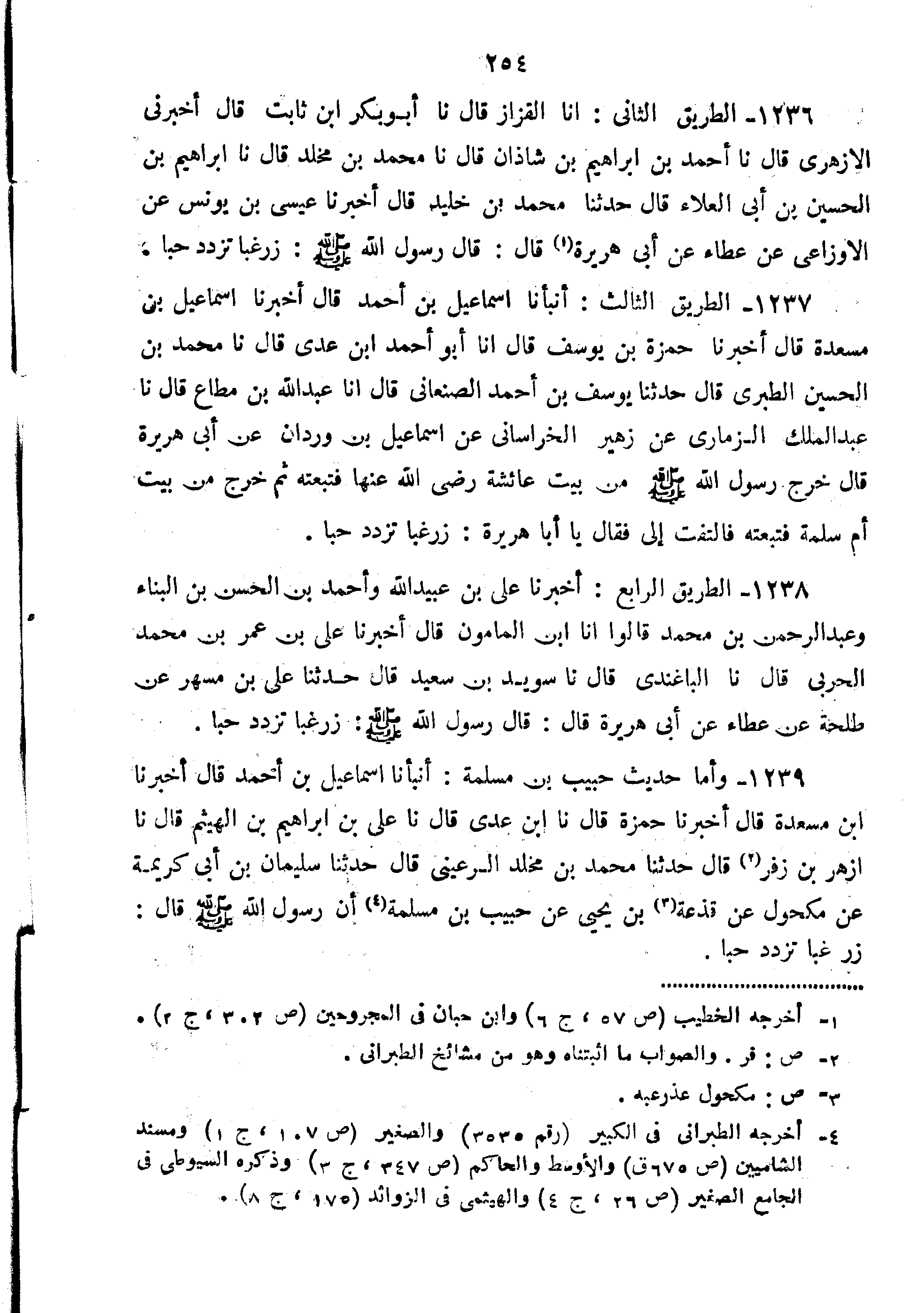 1239-وَأَمَّا حَدِيثُ حَبِيبِ بْنِ مُسْلِمَةَ أَنْبَأَنَا إِسْمَاعِيلُ بْنُ أَحْمَدَ قَالَ أَخْبَرَنَا ابْنُ مَسْعَدَةَ قَالَ أَخْبَرَنَا حَمْزَةُ قَالَ نا ابْنُ عَدِيٍّ قَالَ نا عَلِيُّ بْنُ إِبْرَاهِيمَ بْنِ الْهَيْثَمِ قَالَ نا أَزْهَرُ بْنُ زُفَرَ قَالَ حَدَّثَنَا مُحَمَّدُ بْنُ مَخْلَدٍ الرَّعِينِيُّ قَالَ حَدَّثَنَا سليمان ابن أَبِي كَرِيمَةَ عَنْ مَكْحُولٍ عَنْ وتدعه بْنِ يَحْيَى عَنْ حَبِيبِ بْنِ مَسْلَمَةَ أَنّ رَسُولَ اللَّهِ صَلَّى اللَّهُ عَلَيْهِ وَسَلَّمَ قَالَ "زُرْ غِبًّا تَزْدَدْ حُبًّا".