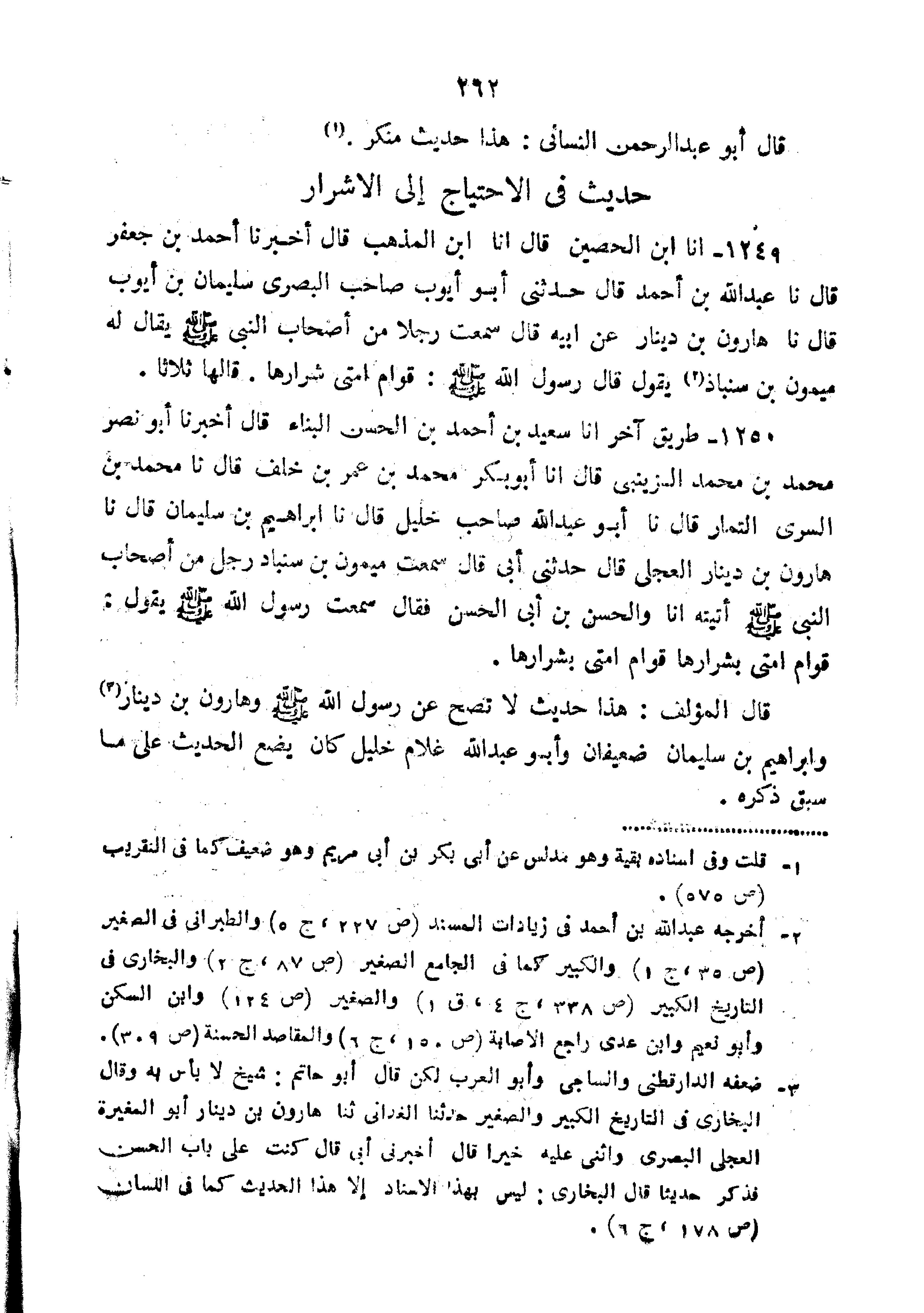 1250-طَرِيقٌ آخَرُ أَنَا سَعِيدُ بْنُ أَحْمَدَ بْنِ الْحَسَنِ الْبَنَّاءُ قَالَ أَخْبَرَنَا أَبُو نَصْرٍ مُحَمَّدُ بْنُ مُحَمَّدٍ الزَّيْنَبِيُّ قَالَ أَنَا أَبُو بَكْرٍ مُحَمَّدُ بْنُ عُمَرَ بْنِ خَلَفٍ قَالَ نا مُحَمَّدُ بْنُ السَّرِيِّ التَّمَّارُ قَالَ نا أَبُو عَبْدِ اللَّهِ صَاحِبُ خَلِيلٍ قَالَ نا إِبْرَاهِيمُ بْنُ سُلَيْمَانَ قَالَ نا هَارُونُ بْنُ دِينَارٍ الْعِجْلِيُّ قَالَ حَدَّثَنِي أَبِي قَالَ سَمِعْتُ مَيْمُونَ بْنَ سِنْبَادٍ رَجُلٌ مِنْ أَصْحَابِ النَّبِيَّ صَلَّى اللَّهُ عَلَيْهِ وَسَلَّمَ أَتَيْتُهُ أَنَا وَالْحَسَنُ بْنُ أَبِي الْحَسَنِ فَقَالَ سَمِعْتُ رَسُولَ اللَّه صَلَّى اللَّهُ عَلَيْهِ وَسَلَّمَ يَقُولُ "قِوَامُ أُمَّتِي بِشِرَارِهَا قِوَامُ أُمَّتِي بِشِرَارِهَا".