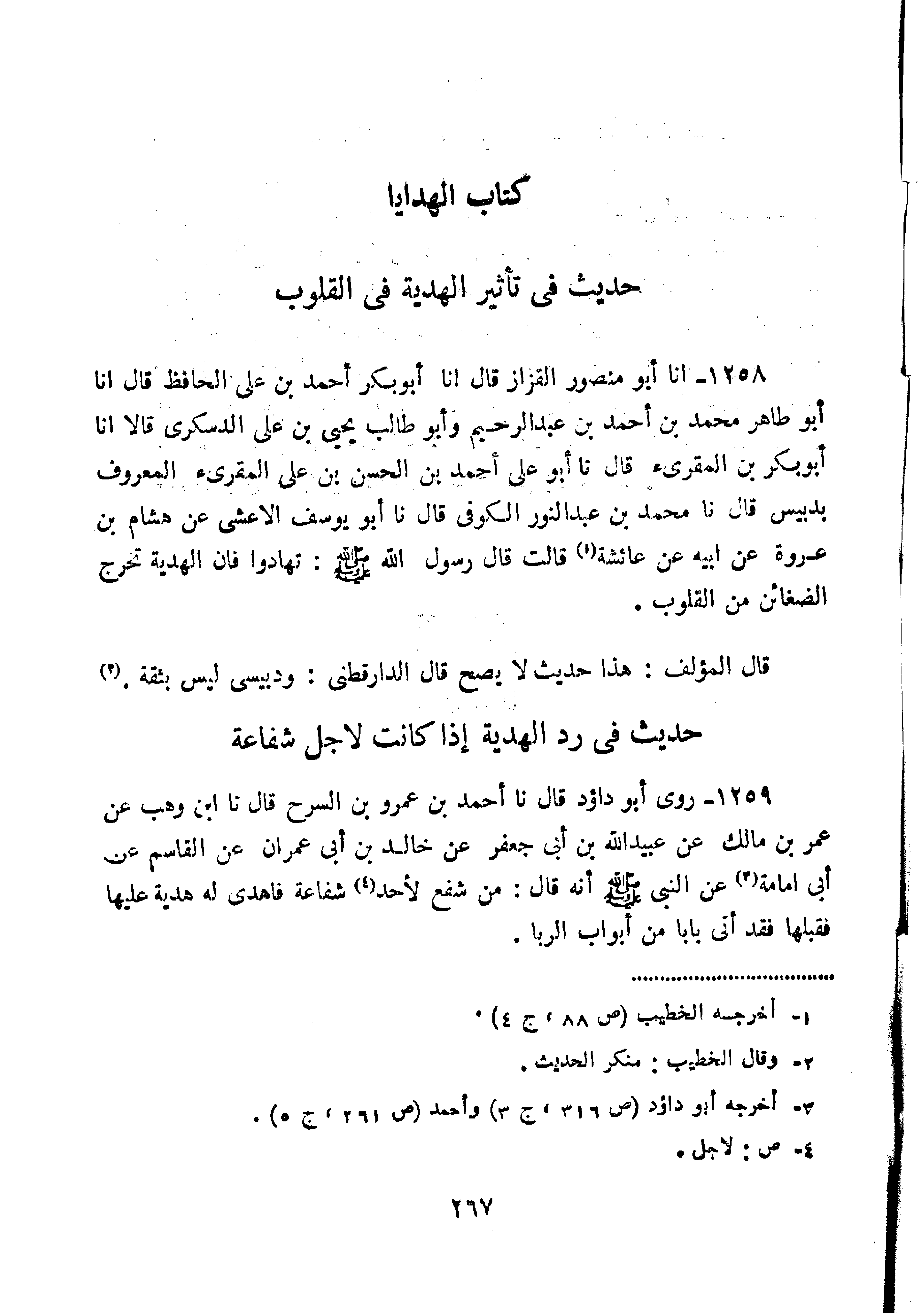 1259-رَوَى أَبُو دَاؤُدَ قَالَ نا أَحْمَدُ بْنُ عَمْرِو بْنِ السَّرْحِ قَالَ نا ابْنُ وَهْبٍ عَنْ عُمَرَ بْنِ مَالِكٍ عَنْ عُبَيْدِ اللَّهِ بْنِ أَبِي جَعْفَرٍ عَنْ خَالِدِ بْنِ أَبِي عِمْرَانَ عَنِ الْقَاسِمِ عَنْ أَبِي أُمَامَةَ عَنِ النَّبِيِّ صَلَّى اللَّهُ عَلَيْهِ وَسَلَّمَ أَنَّهُ قَالَ " مَنْ شَفَعَ لأَحَدٍ شَفَاعَةً فَأُهْدِيَ لَهُ هَدِيَّةٌ عَلَيْهَا فَقَبِلَهَا فَقَدْ أَتَى بَابًا مِنْ أَبْوَابِ الرِّبَا".