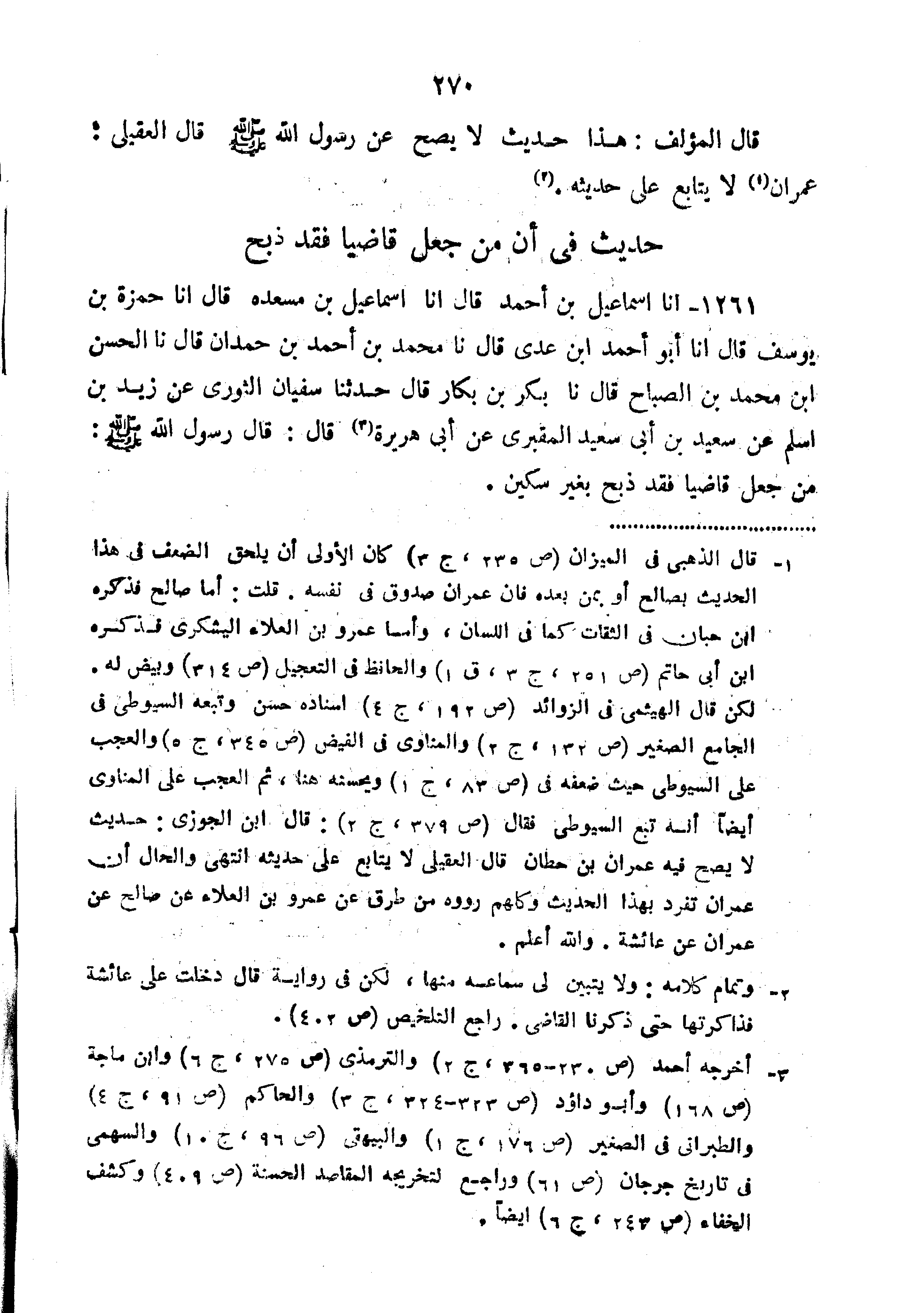 قَالَ الْعَقِيلِيُّ: "عِمْرَانَ لا يتابع على حديثه".