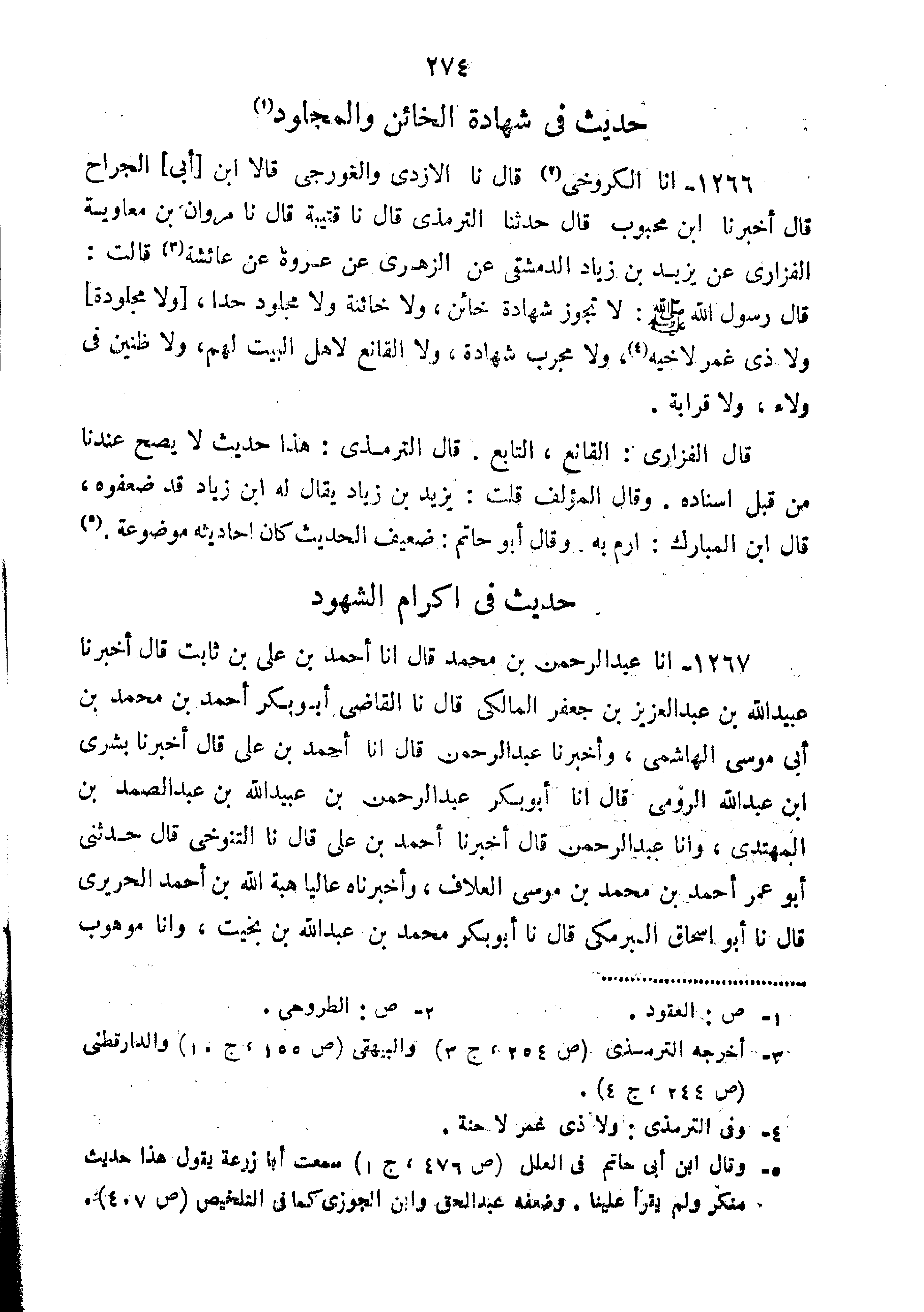 1266-أَنَا الْكَرُوخِيُّ قَالَ نا الْأَزْدِيُّ وَالْغُورَجِيُّ قَالا ابْنُ أَبِي الْجَرَّاحِ قَالَ أَخْبَرَنَا ابْنُ مَحْبُوبٍ قَالَ حَدَّثَنَا التِّرْمِذِيُّ قَالَ نا قُتَيْبَةَ قَالَ نا مَرْوَانُ بْنُ مُعَاوِيَةَ الْفَزَارِيُّ عَنْ يَزِيدَ بْنِ زِيَادٍ الدِّمَشْقِيِّ عَنِ الزُّهْرِيِّ عَنْ عُرْوَةَ عَنْ عَائِشَةَ قَالَتْ قَالَ رَسُولُ اللَّهِ صَلَّى اللَّهُ عَلَيْهِ وَسَلَّمَ: "لا تَجُوزُ شَهَادَةُ خَائِنٍ وَلا خَائِنَةٍ وَلا مَجْلُودٍ حَدًّا وَلا مجلودة ولا ذي غمر لأَخِيهِ وَلا مُجَرِّبِ شَهَادَةٍ وَلا الْقَانِعِ لأَهْلِ الْبَيْتِ لَهُمْ وَلا ظَنِينٍ فِي وَلاءٍ وَلا قَرَابَةٍ".