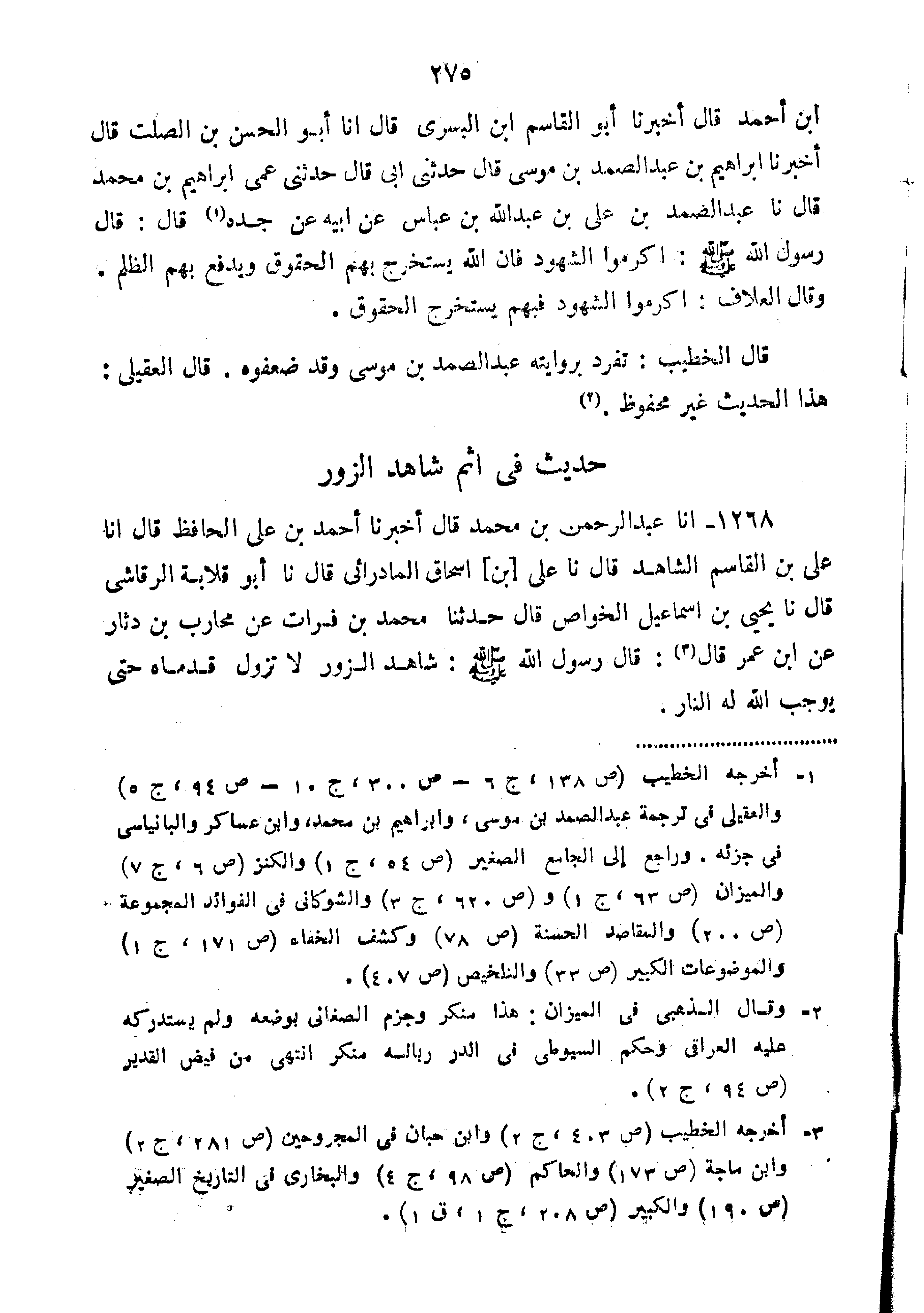 1268-أنا عَبْدُ الرَّحْمَنِ بْنُ مُحَمَّدٍ قَالَ أَخْبَرَنَا أَحْمَدُ بْنُ عَلِيٍّ الْحَافِظُ قَالَ أَنَا عَلِيُّ بْنُ الْقَاسِمِ الشَّاهِدُ قَالَ نا علي بن إسحاق الماد رائي قَالَ نا أَبُو قِلابَةَ الرَّقَاشِيُّ قَالَ نا يَحْيَى بْنُ إِسْمَاعِيلَ الْخَوَّاصُ قَالَ حَدَّثَنَا مُحَمَّدُ بْنُ فُرَاتٍ عَنْ مُحَارِبِ بْنِ دِثَارٍ عَنِ ابْنِ عُمَرَ قَالَ: قَالَ رَسُولِ اللَّهِ صَلَّى اللَّهُ عَلَيْهِ وسلم: "شاهد الزور لا ينعقد قَدَمَاهُ حَتَّى يُوجِبَ اللَّهُ لَهُ النَّارَ".