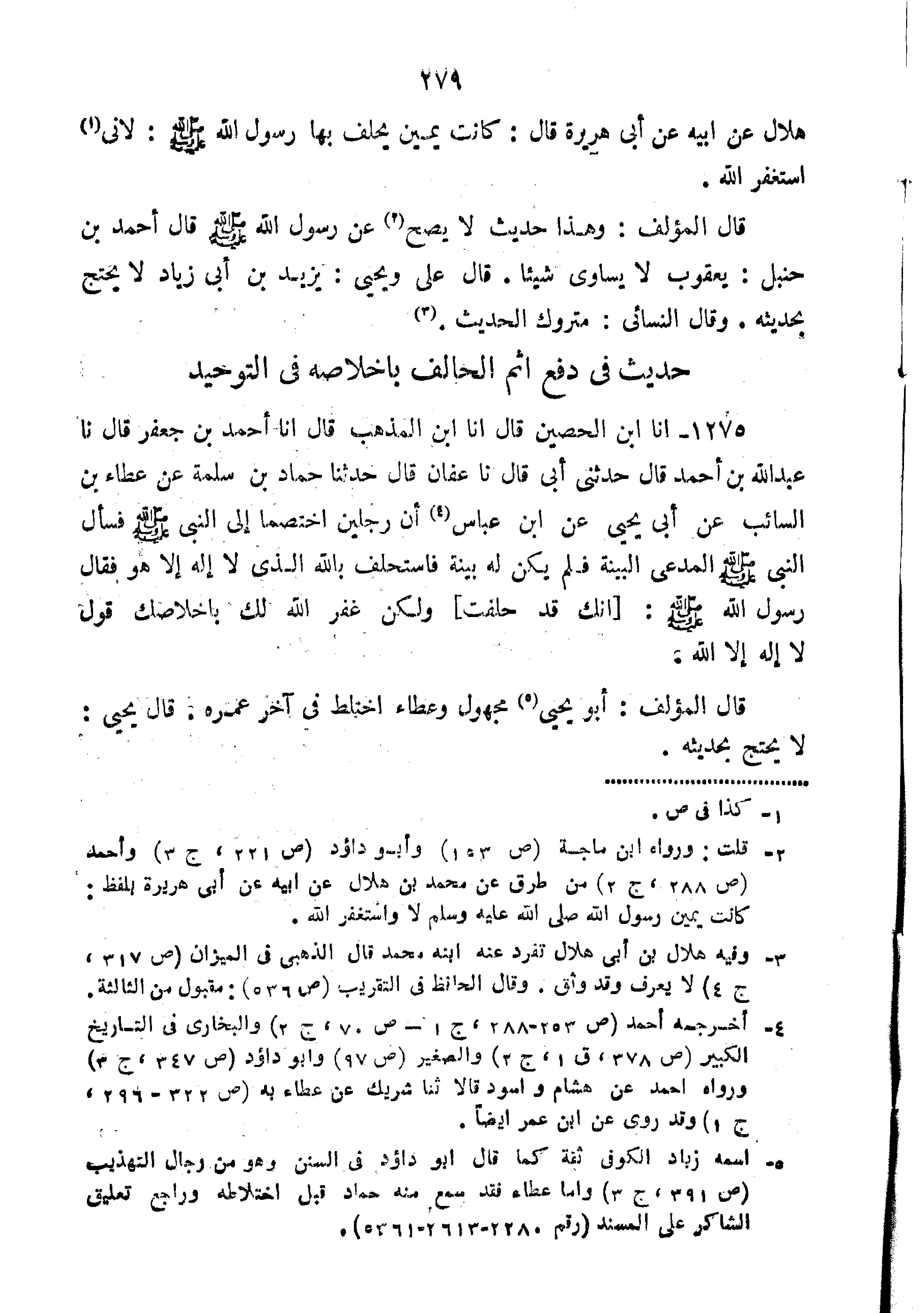 1275-أنا ابْنُ الْحُصَيْنِ قَالَ أَنَا ابْنُ الْمُذْهِبِ قَالَ أَنَا أَحْمَدُ بْنُ جَعْفَرٍ قَالَ نا عَبْدُ اللَّهِ بْنُ أَحْمَدَ قَالَ حَدَّثَنِي أَبِي قَالَ نا عَفَّانُ قَالَ حَدَّثَنَا حَمَّادُ بْنُ سَلَمَةَ عَنْ عَطَاءِ بْنِ السَّائِبِ عَنْ أَبِي يَحْيَى عَنِ بن عَبَّاسٍ أَنَّ رَجُلَيْنِ اخْتَصَمَا إِلَى النَّبِيَّ صَلَّى اللَّهُ عَلَيْهِ وَسَلَّمَ فَسَأَلَ النَّبِيُّ صَلَّى اللَّهُ عَلَيْهِ وَسَلَّمَ الْمُدَّعِيَ الْبَيِّنَةَ فَلَمْ يَكُنْ لَهُ بَيِّنَةٌ فَاسْتَحْلَفَ بِاللَّهِ الَّذِي لا إِلَهَ إِلا هُوَ فَقَالَ رَسُولِ اللَّهِ صَلَّى اللَّهُ عَلَيْهِ وَسَلَّمَ: "إِنَّكَ قَدْ حَلَفْتَ وَلَكِنْ غَفَرَ اللَّهُ لَكَ بِإِخْلاصِكَ قَوْلَ لا إِلَهَ إلا اللَّهُ".