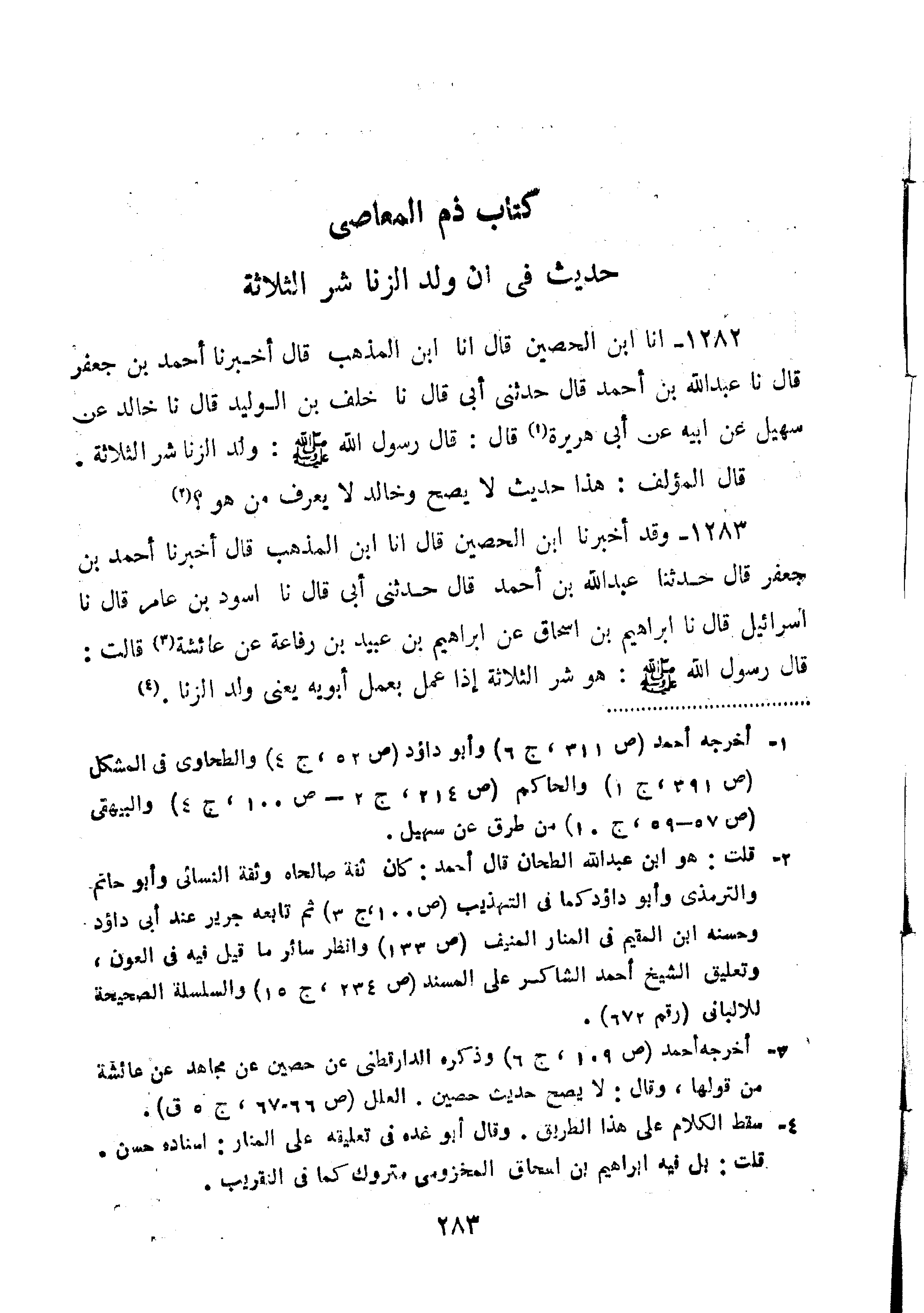 1282-أَنَا ابْنُ الْحُصَيْنِ قَالَ أَنَا ابْنُ الْمُذْهِبِ قَالَ أَخْبَرَنَا أَحْمَدُ بْنُ جَعْفَرٍ قَالَ نا عَبْدُ اللَّهِ بْنُ أَحْمَدَ قَالَ حَدَّثَنِي أَبِي قَالَ نا خَلَفُ بْنُ الْوَلِيدِ قَالَ نا خَالِدٌ عَنْ سُهَيْلٍ عَنْ أَبِيهِ عَنْ أَبِي هُرَيْرَةَ قَالَ: قَالَ رَسُولِ اللَّهِ صَلَّى اللَّهُ عَلَيْهِ وَسَلَّمَ: "وَلَدُ الزِّنَا شَرُّ الثَّلاثَةِ".