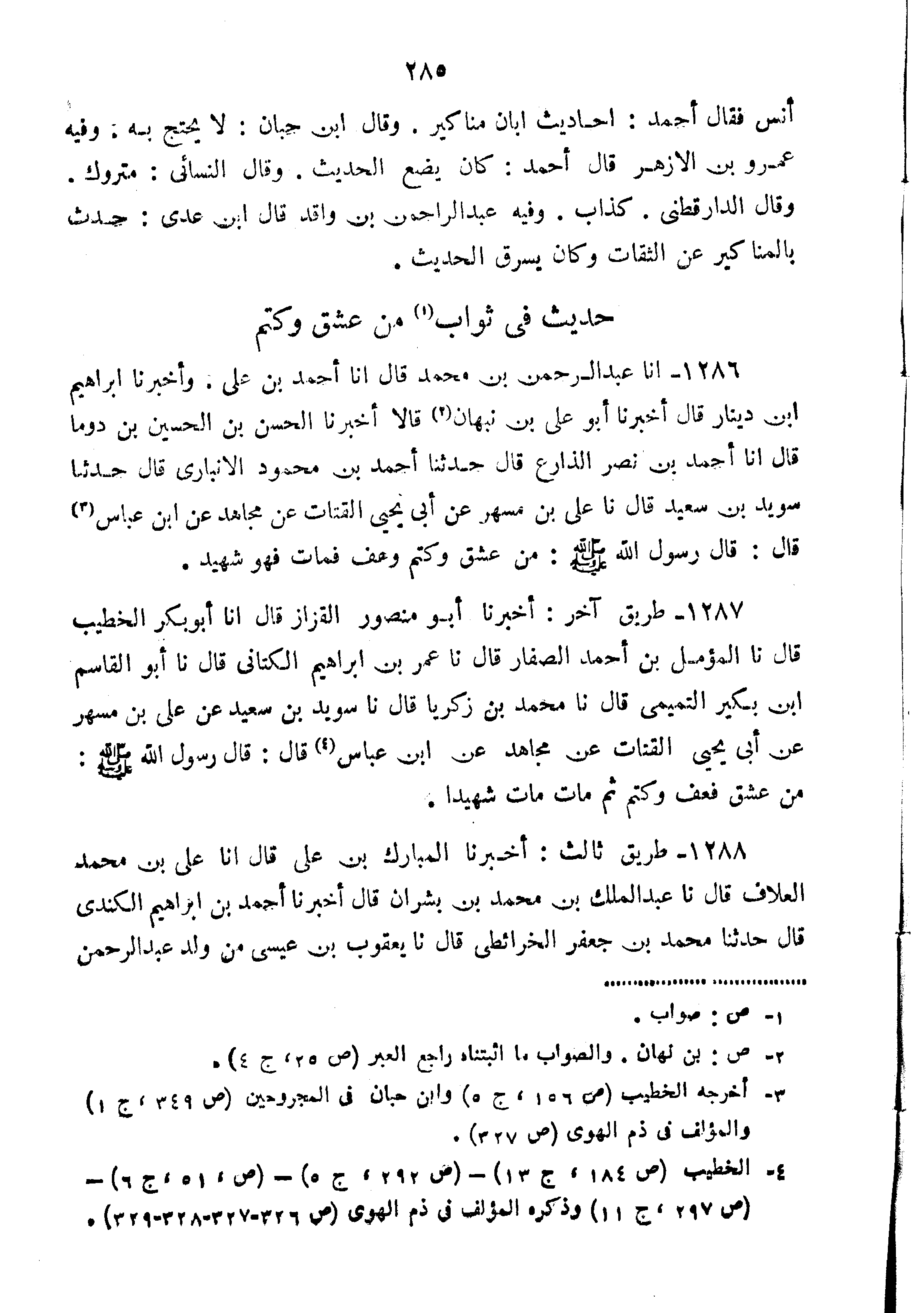 1286-أَنَا عَبْدُ الرَّحْمَنِ بْنُ مُحَمَّدٍ قَالَ أَنَا أَحْمَدُ بْنُ عَلِيِّ وأخبرنا إبراهيم ابن دينار قال اخبرانا أبو علي بن نبهان قالا أَخْبَرَنَا الْحَسَنُ بْنُ الْحُسَيْنِ بْنِ دُومَا قَالَ أَنَا أَحْمَدُ بْنُ نَصْرٍ الذَّارِعُ قَالَ حَدَّثَنَا أَحْمَدُ بْنُ مَحْمُودٍ الأَنْبَارِيُّ قَالَ حَدَّثَنَا سُوَيْدُ بْنُ سَعِيدٍ قَالَ نا عَلِيُّ بْنُ مِسْهَرٍ عَنْ أَبِي يَحْيَى الْقَتَّاتِ عَنْ مُجَاهِدٍ عَنِ ابْنِ عَبَّاسٍ قَالَ: قَالَ رَسُولُ اللَّهِ صَلَّى اللَّهُ عَلَيْهِ وَسَلَّمَ: "مَنْ عَشَقَ وَكَتَمَ وَعَفَّ فَمَاتَ فَهُوَ شَهِيدٌ".