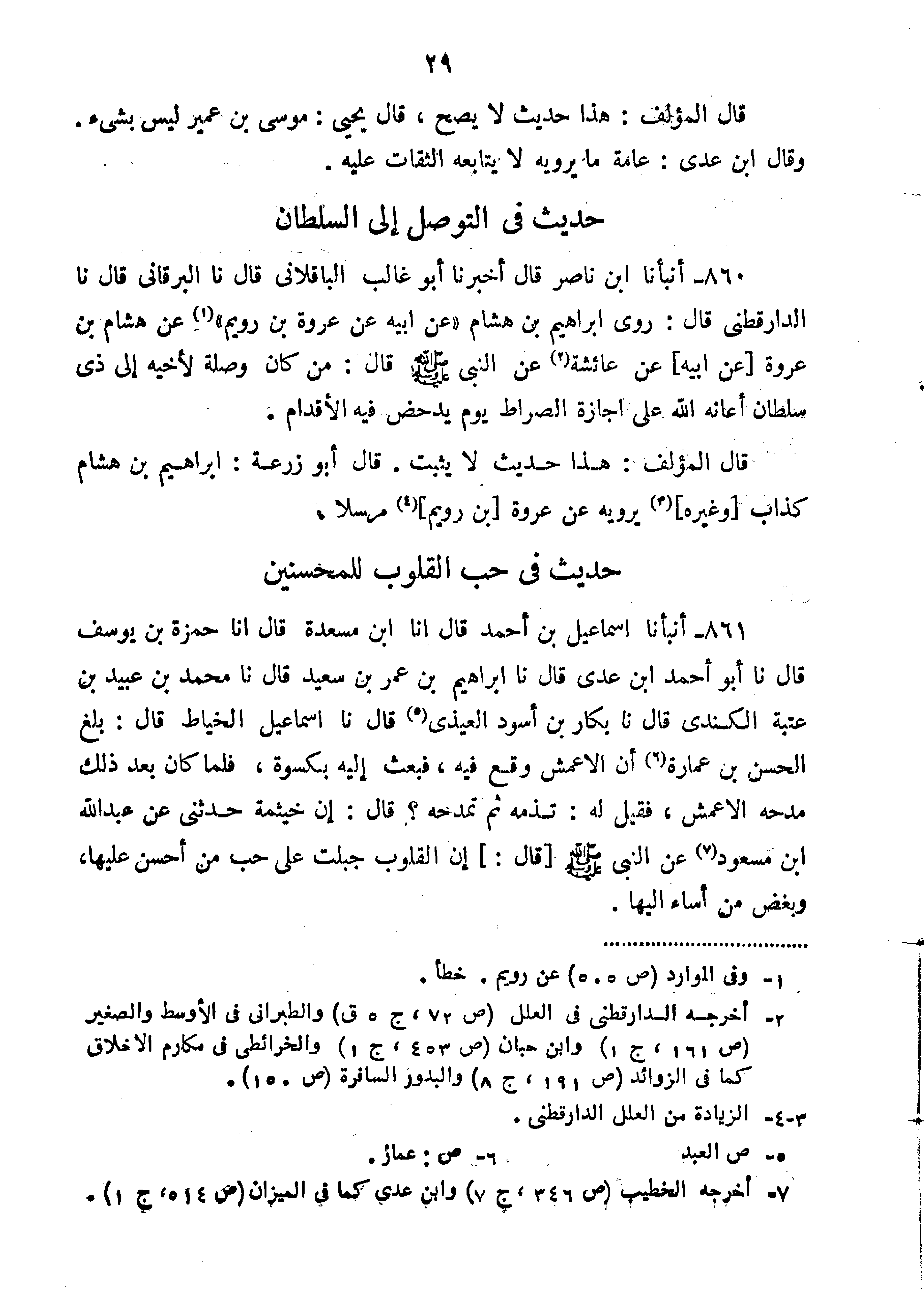 860-أَنْبَأَنَا ابْنُ نَاصِرٍ قَالَ أَخْبَرَنَا أَبُو غَالِبٍ الْبَاقِلَّانِيُّ قَالَ نا الْبَرْقَانِيُّ قَالَ نا الدارقطني قَالَ رَوَى إِبْرَاهِيمُ بْنُ هِشَامٍ عَنْ أَبِيهِ عَنْ عُرْوَةَ بْنِ رُوَيْمٍ عَنْ هِشَامِ بْنِ عُرْوَةَ عَنْ أَبِيهِ عَنْ عَائِشَةَ عَنْ النَّبِيَّ صَلَّى اللَّهُ عَلَيْهِ وَسَلَّمَ قَالَ "مَنْ كَانَ وَصْلَةً لأَخِيهِ إِلَى ذِي سُلْطَانٍ أَعَانَهُ اللَّهُ عَلَى إِجَازَةِ الصِّرَاطِ يَوْمَ يُدْحَضُ فِيهِ الأَقْدَامُ".