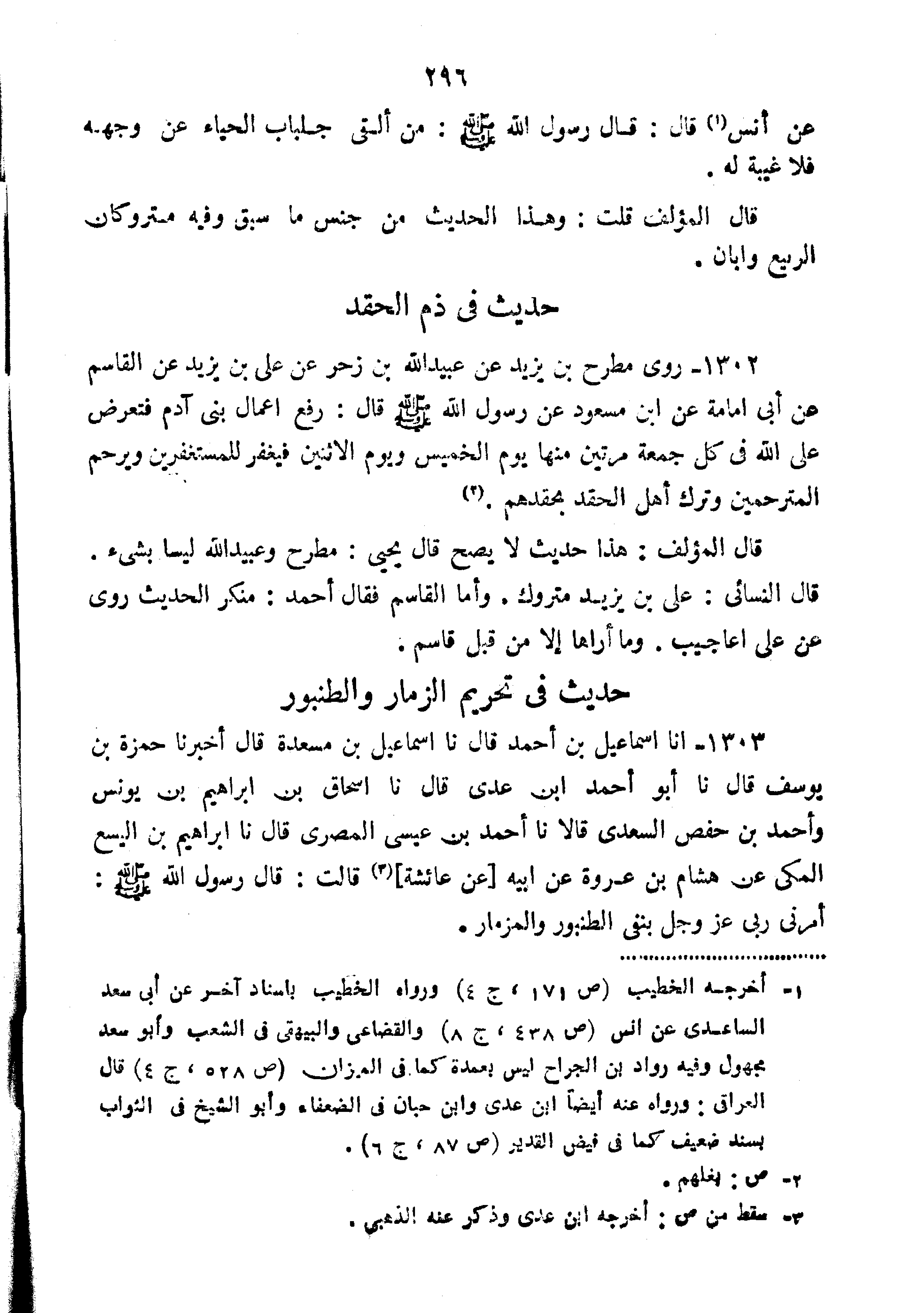 1302-رَوَى مُطَّرِحُ بْنُ يَزِيدَ عَنْ عُبَيْدِ اللَّهِ بْنِ زَحْرٍ عَنْ عَلِيِّ بْنِ يَزِيدَ عَنِ الْقَاسِمِ عَنْ أَبِي أُمَامَةَ عَنِ ابْنِ مَسْعُودٍ عَنْ رَسُولِ اللَّهِ صَلَّى اللَّهُ عَلَيْهِ وَسَلَّمَ قَالَ "رُفِعَ أعمال آدَمَ فَتُعْرَضُ عَلَى اللَّهِ فِي كُلِّ جُمُعَةٍ مَرَّتَيْنِ مِنْهَا يَوْمُ الْخَمِيسِ وَيَوْمُ الاثْنَيْنِ فَيَغْفِرُ لِلْمُسْتَغْفِرِينَ وَيَرْحَمُ الْمُتَرَحِّمِينَ وَتَرَكَ أَهْلَ الْحِقْدِ بِحِقْدِهِمْ".