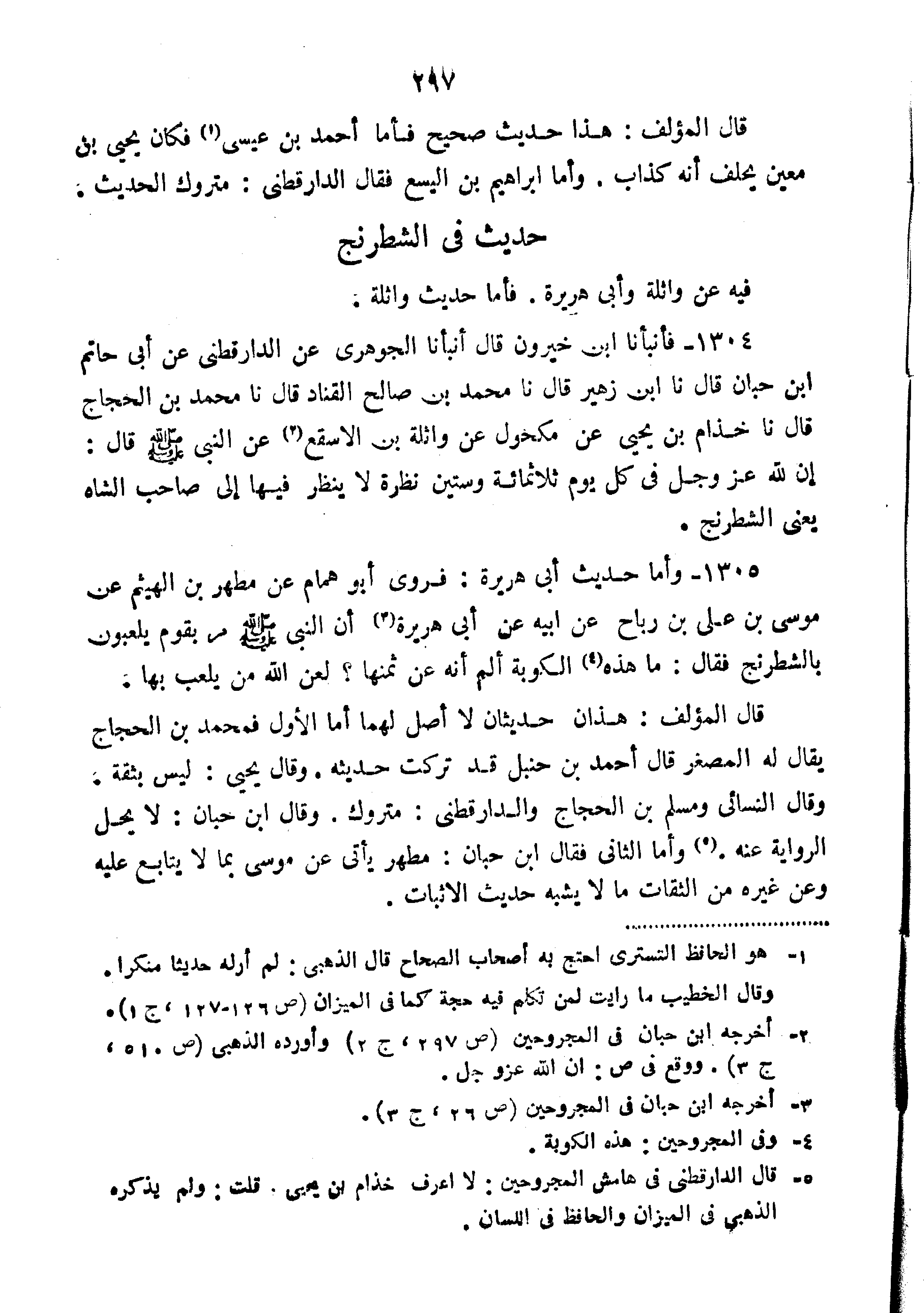 1304-فَأَنْبَأَنَا ابْنُ خَيْرُونَ قَالَ أَنْبَأَنَا الْجَوْهَرِيُّ عَنِ الدَّارَقُطْنِيِّ عَنْ أَبِي حَاتِمِ بْنِ حَبَّانَ قَالَ نا ابْنُ زُهَيْرٍ قَالَ نا مُحَمَّدُ بْنُ صَالِحٍ الْقَنَّادُ قَالَ نا مُحَمَّدُ بْنُ الْحَجَّاجِ قَالَ نا خِذَامُ بْنُ يَحْيَى عَنْ مَكْحُولٍ عَنْ وَاثِلَةَ بْنِ الأَسْقَعِ عَنِ النَّبِيِّ صَلَّى اللَّهُ عَلَيْهِ وَسَلَّمَ قَالَ "إن لِلَّهِ عَزَّ وَجَلَّ فِي كُلِّ يَوْمٍ ثَلاثُمِائَةٍ وَسِتِّينَ نَظْرَةً لا يَنْظُرُ فِيهَا إِلَى صَاحِبِ الشَّاهِ يَعْنِي الشِّطْرَنْجَ".