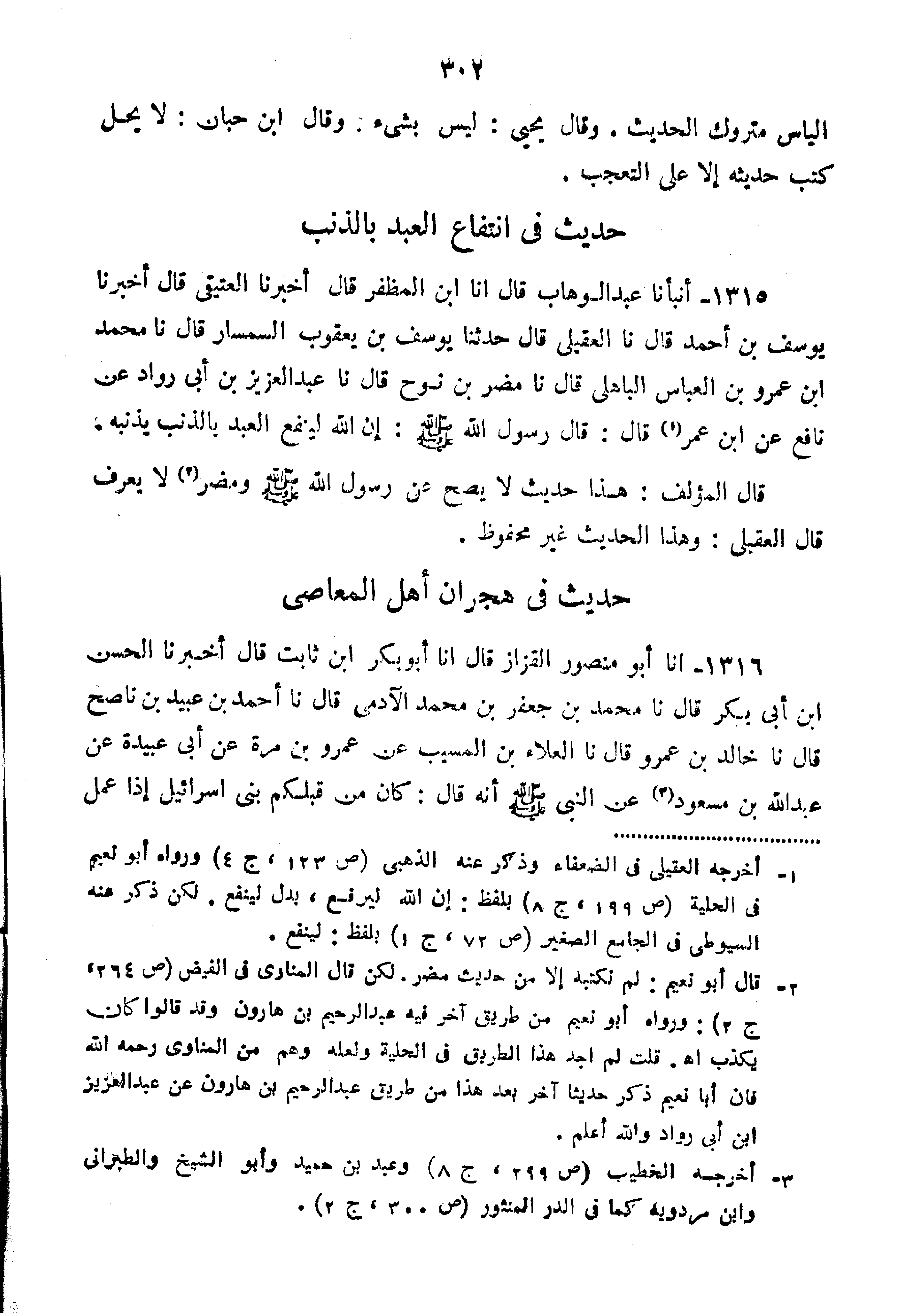 1315-أَنْبَأَنَا عَبْدُ الْوَهَّابِ قَالَ أَنَا ابْنُ الْمُظَفَّرِ قَالَ أَخْبَرَنَا الْعَتِيقِيُّ قَالَ أْخَبَرَنَا يُوسُفُ بْنُ أَحْمَدَ قَالَ نا الْعَقِيلِيُّ قَالَ حَدَّثَنَا يُوسُفُ بْنُ يَعْقُوبَ السِّمْسَارُ قَالَ نا مُحَمَّدُ بْنُ عَمْرِو بْنِ الْعَبَّاسِ الْبَاهِلِيُّ قَالَ نا مُضَرُ بْنُ نُوحٍ قَالَ نا عَبْدُ الْعَزِيزِ بْنُ أَبِي دواد عَنْ نَافِعٍ عَنِ ابْنِ عُمَرَ قَالَ: قَالَ رَسُولُ اللَّهِ صَلَّى اللَّهُ عَلَيْهِ وَسَلَّمَ: "إِنَّ اللَّهَ لَيَنْفَعُ الْعَبْدَ بِالذَّنْبِ يُذْنِبُهُ".