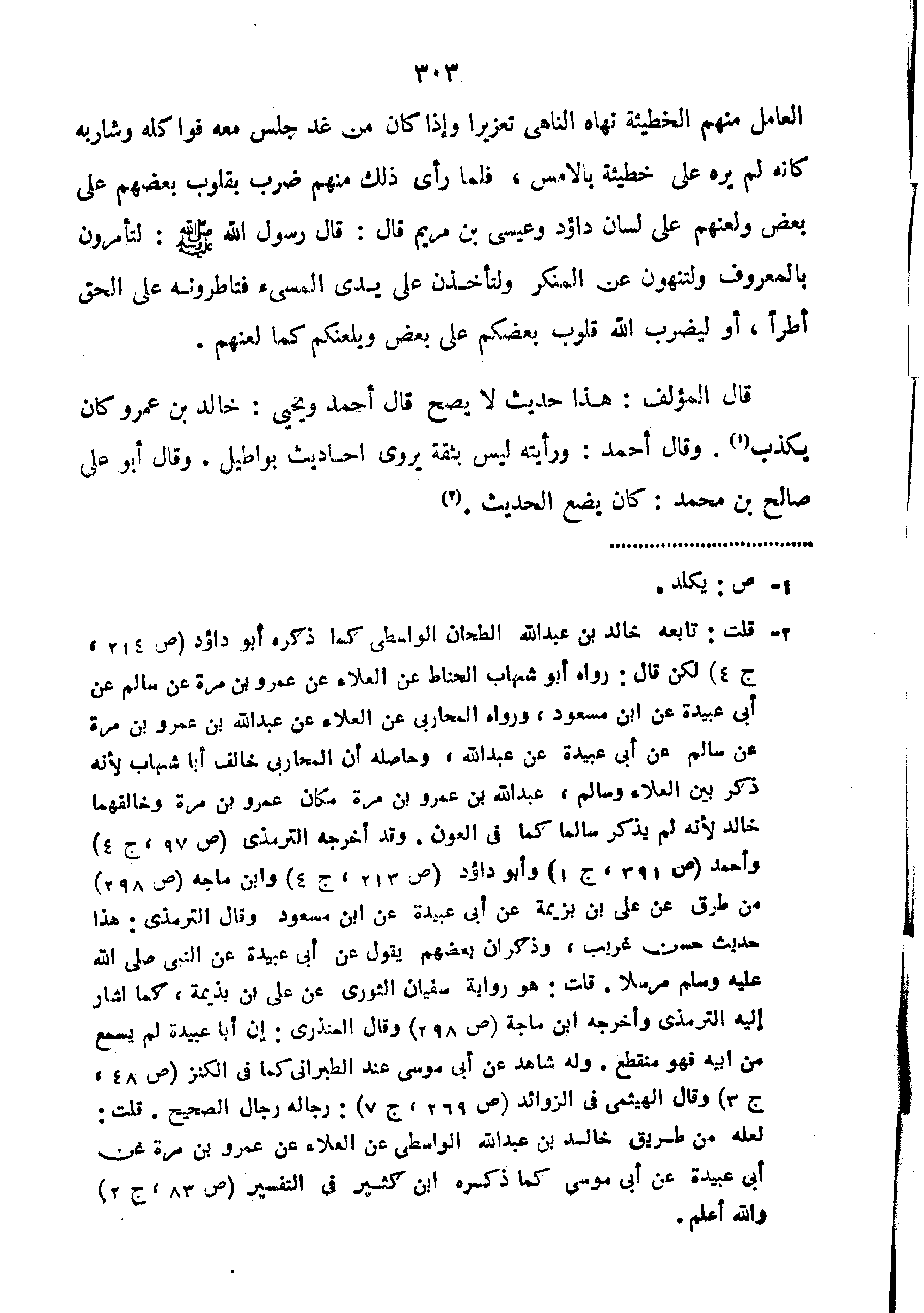 العامل منهم الخطيئة نهاه الناهي تعزيرا وإذا كان من غد جلس معه فواكله وشاربه كأنه لم يره على خطيئة بالأمس فلما رأى ذلك منهم ضرب بقلوب بعضهم على بعض ولعنهم على لسان داؤد ونصف ابن مريم قَالَ: قَالَ رَسُولُ اللَّهِ صَلَّى الله عليه وسلم: "لَتَأْمُرُنَّ بِالْمَعْرُوفِ وَلَتَنْهَوُنَّ عَنِ الْمُنْكَرِ وَلَتَأْخُذُنَّ عَلَى يَدَيِ الْمُسِيئِ فَتَأْطُرُونَهُ عَلَى الْحَقِّ أَطْرًا أَوْ لَيَضْرِبُ اللَّهُ قُلُوبَ بَعْضِكُمْ عَلَى بَعْضٍ وَيَلْعَنُكُمْ كَمَا لَعَنَهُمْ".