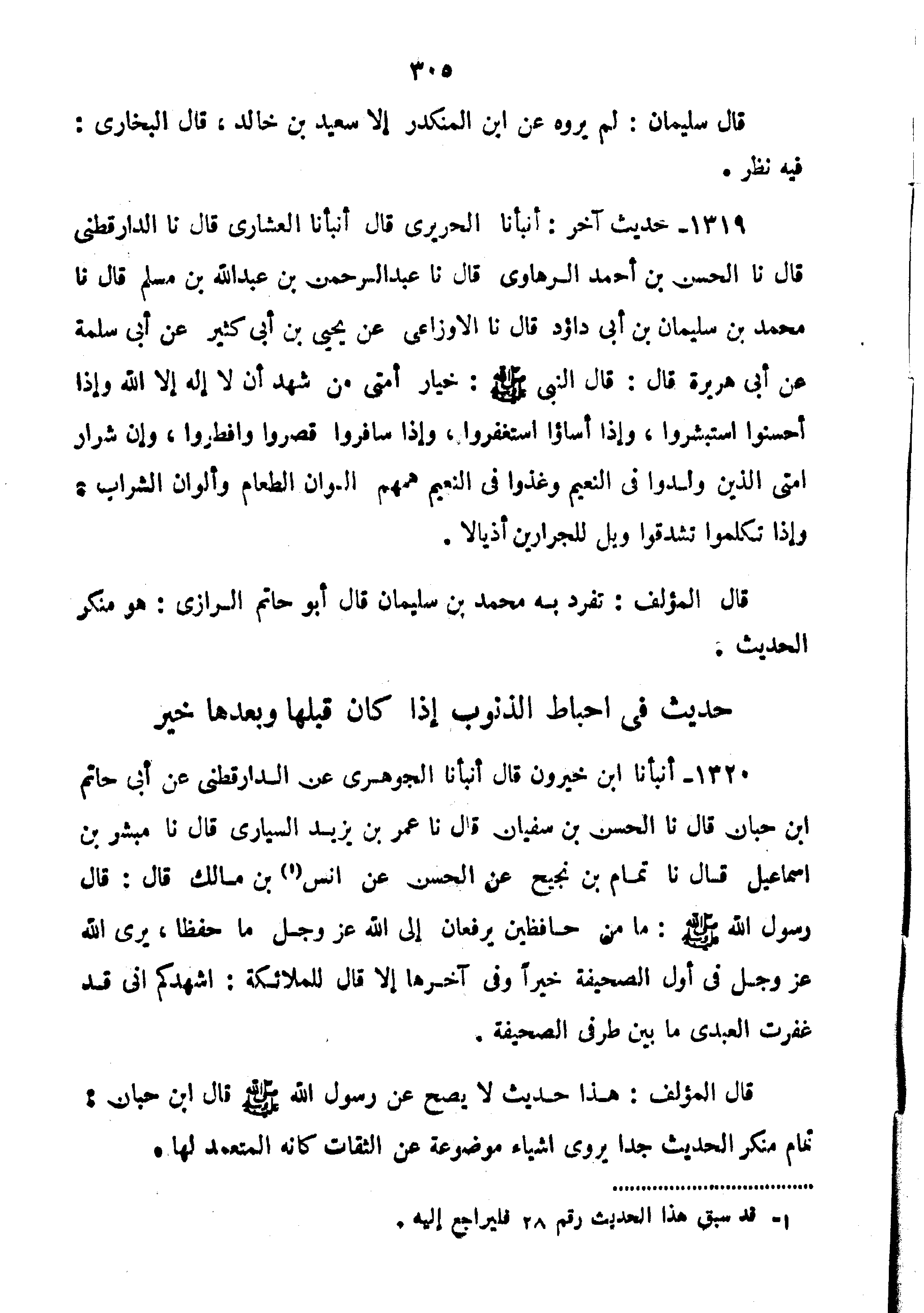 1320-أَنْبَأَنَا ابن خيرون قال أنبأنا الجر هري عَنِ الدَّارَقُطْنِيِّ عَنْ أَبِي حَاتِمِ بْنِ حَبَّانَ قَالَ نا الْحَسَنُ بْنُ سُفْيَانَ قَالَ نا عُمَرُ بْنُ يَزِيدَ السَّيَّارِيُّ قَالَ نا مبشر ابن إِسْمَاعِيلَ قَالَ نا تَمَّامُ بْنُ نُجَيْحٍ عَنِ الْحَسَنِ عَنْ أَنَسٍ بْنِ مَالِكٍ قَالَ: قَالَ رَسُولُ اللَّهِ صَلَّى اللَّهُ عَلَيْهِ وَسَلَّمَ: "مَا مِنْ حَافِظَيْنِ يَرْفَعَانِ إِلَى اللَّهِ عَزَّ وَجَلَّ مَا حَفِظَا يَرَى اللَّهُ عَزَّ وَجَلَّ فِي أَوَّلِ الصَّحِيفَةِ خَيْرًا وَفِي آخِرِهَا إِلا قَالَ لِلْمَلائِكَةِ أُشْهِدُكُمْ إِنِّي قَدْ غَفَرْتُ لِعَبْدِي مَا بَيْنَ طَرَفَيِ الصَّحِيفَةِ".
