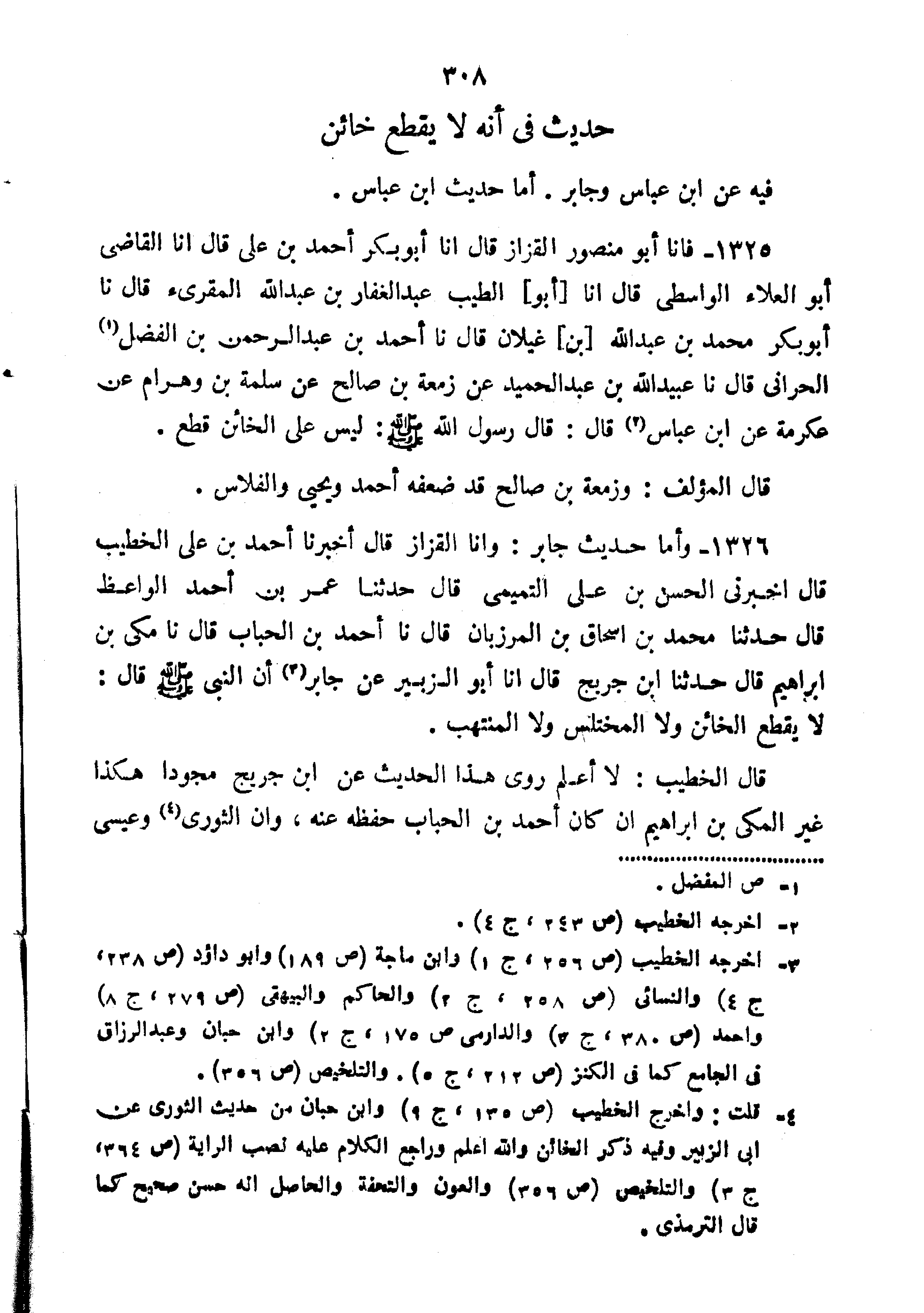 1326-وَأَمَّا حَدِيثُ جَابِرٍ وَأَنَا الْقَزَّازُ قَالَ أَخْبَرَنَا أَحْمَدُ بْنُ عَلِيٍّ الْخَطِيبُ قَالَ أَخْبَرَنِي الْحَسَنُ بْنُ عَلِيٍّ التَّمِيمِيُّ قَالَ حَدَّثَنَا عُمَرُ بْنُ أَحْمَدَ الْوَاعِظُ قَالَ حَدَّثَنَا مُحَمَّدُ بْن إِسْحَاق بْن المرزبان قال نا أَحْمَدُ بْنُ الْحُبَابِ قَالَ نا مَكِّيُّ بْنُ إِبْرَاهِيمَ قَالَ حَدَّثَنَا ابْنُ جُرَيْجٍ قَالَ نا أَبُو الزُّبَيْرِ عَنْ جَابِرٍ أَنّ النَّبِيَّ صَلَّى اللَّهُ عَلَيْهِ وَسَلَّمَ قَالَ "لا يَقْطَعُ الْخَائِنُ وَلا الْمُخْتَلِسُ وَلا الْمُنْتَهِبُ".