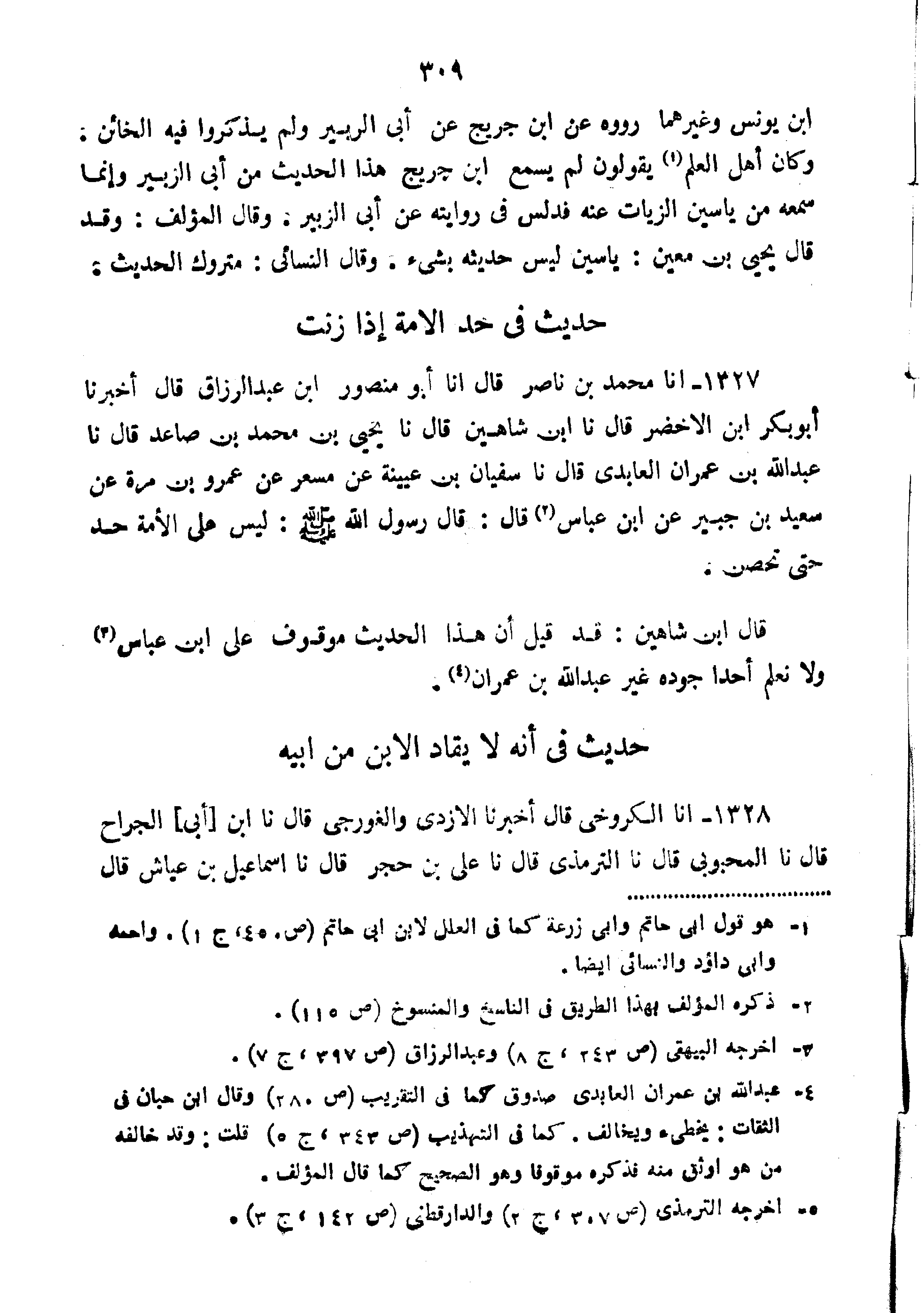 1327-أَنَا محمد بن ناصر قال أَبُو مَنْصُورِ بْنُ عَبْدِ الرَّزَّاقِ قَالَ أَخْبَرَنَا أَبُو بَكْرِ بْنُ الأَخْضَرِ قَالَ نا ابْنُ شَاهِينَ قَالَ نا يَحْيَى بْنُ مُحَمَّدِ بْنُ صَاعِدٍ قَالَ نا عَبْدُ اللَّهِ بْنُ عِمْرَانَ الْعَابِدِيُّ قَالَ نا سُفْيَانُ بْنُ عُيَيْنَةَ عَنْ مِسْعَرٍ عَنْ عَمْرِو بْنِ مُرَّةَ عَنْ سَعِيدِ بْنِ جُبَيْرٍ عَنِ ابْنِ عَبَّاسٍ قَالَ: قَالَ رَسُولُ اللَّهِ صَلَّى اللَّهُ عَلَيْهِ وَسَلَّمَ: "لَيْسَ عَلَى الأَمَةِ حَدٌّ حَتَّى تُحَصَّنَ".