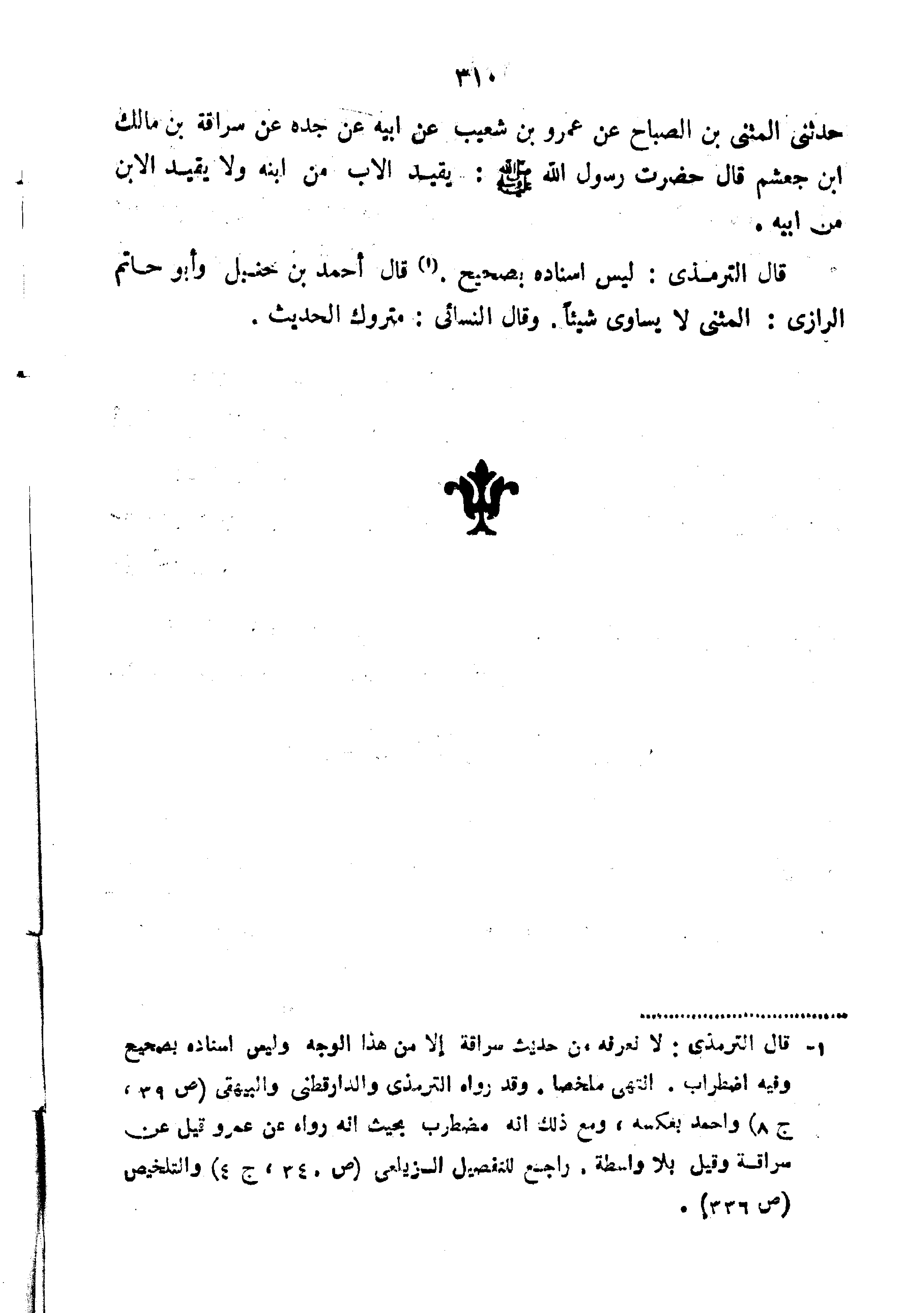حدثني المثنى عَنْ عَمْرِو بْنِ شُعَيْبٍ عَنْ أَبِيهِ عَنْ جَدِّهِ عَنْ سُرَاقَةَ بْنِ مَالِكِ بْنِ جَعْشَمٍ قَالَ عملا رَسُولِ اللَّهِ صَلَّى اللَّهُ عَلَيْهِ وَسَلَّمَ يُقِيدُ الأَبُ مِنَ ابْنِهِ وَلا يُقِيدُ الابْنُ مِنْ أَبِيهِ".