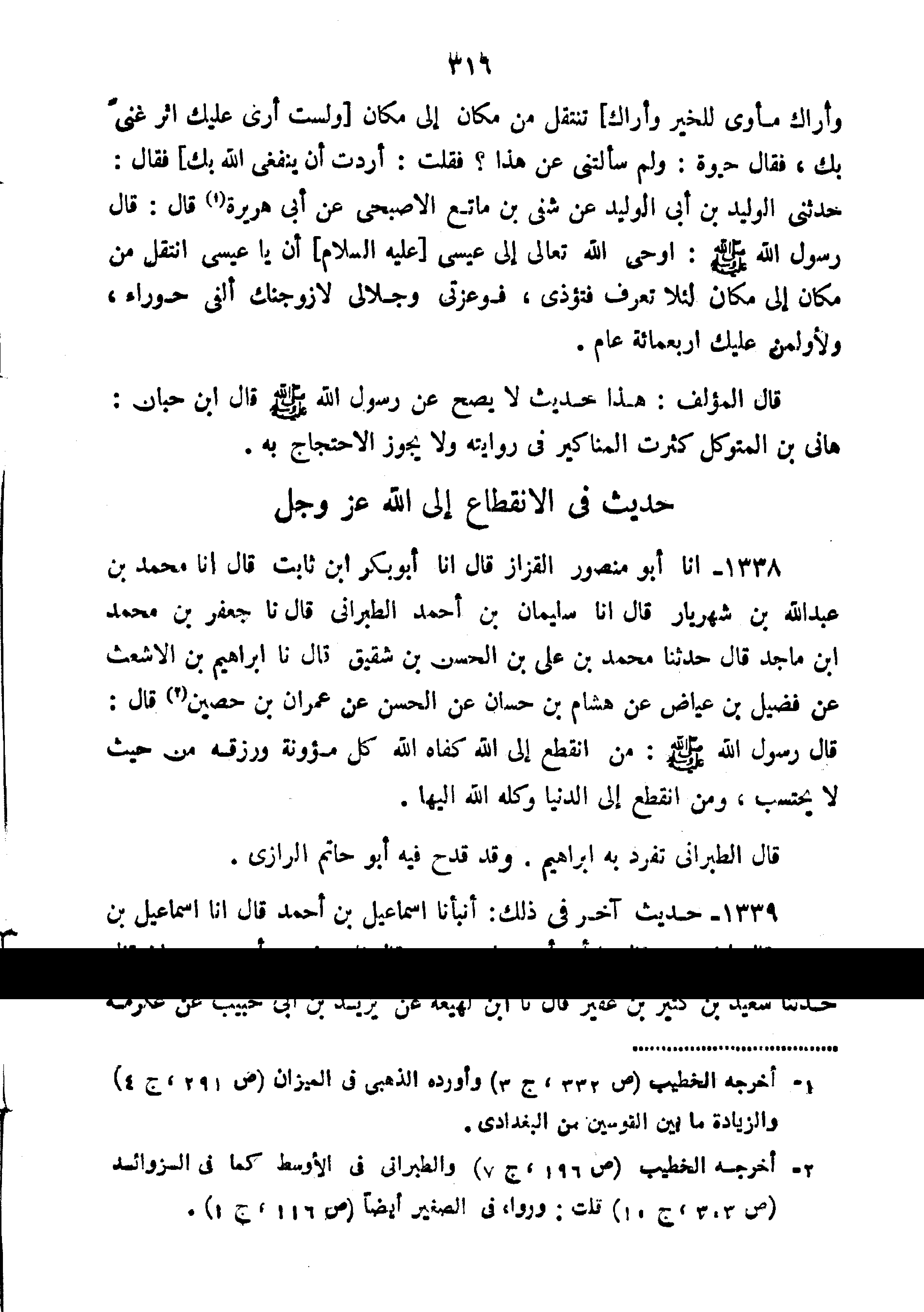 1338-أَنَا أَبُو مَنْصُورٍ الْقَزَّازُ قَالَ أَنَا أَبُو بَكْرِ بْنُ ثَابِتٍ قَالَ أَنَا مُحَمَّدُ بْنُ عَبْدِ اللَّهِ بْنِ شَهْرَيَارَ قَالَ أَنَا سُلَيْمَانُ بْنُ أَحْمَدَ الطَّبَرَانِيُّ قَالَ نا جَعْفَرُ بْنُ مُحَمَّدِ بْنِ مَاجِدٍ قَالَ حَدَّثَنَا مُحَمَّدُ بْنُ عَلِيِّ بْنِ الْحَسَنِ بْنِ شَقِيقٍ قَالَ نا إِبْرَاهِيمُ بْنُ الأَشْعَثِ عَنْ فُضَيْلِ بْنِ عِيَاضٍ عَنْ هِشَامِ بْنِ حَسَّانَ عَنِ الْحَسَنِ عَنْ عِمْرَانَ بْنِ حُصَيْنٍ قَالَ: قَالَ رَسُولِ اللَّهِ صَلَّى اللَّهُ عَلَيْهِ وَسَلَّمَ: "مَنِ انْقَطَعَ إِلَى اللَّهِ كفاه الله كل مؤونة وَرَزَقَهُ مِنْ حَيْثُ لا يَحْتَسِبُ وَمَنِ انْقَطَعَ إِلَى الدُّنْيَا وَكَلَهُ اللَّهُ إِلَيْهَا".
