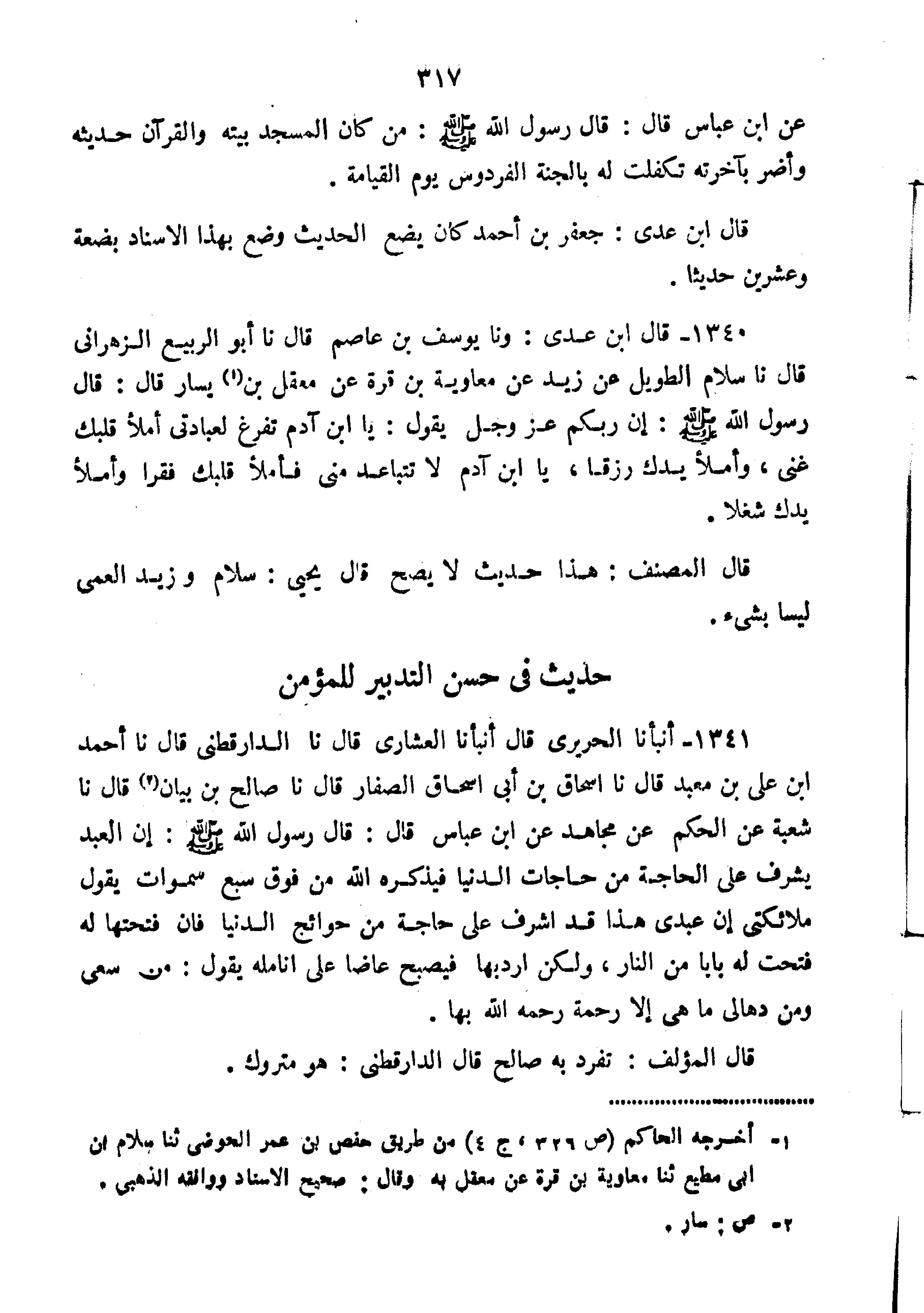 1340-قَالَ ابْنُ عَدِيٍّ: "وَنا يُوسُفُ بْنُ عَاصِمٍ قَالَ نا أَبُو الرَّبِيعِ الزُّهْرَانِيُّ قَالَ نا سَلامٌ الطَّوِيلُ عَنْ زَيْدٍ عَنْ مُعَاوِيَةَ بْنِ قُرَّةَ عَنْ مَعْقِلِ بْنِ يَسَارٍ قَالَ: قَالَ رَسُولُ اللَّهِ صَلَّى اللَّهُ عَلَيْهِ وَسَلَّمَ: "إِنَّ ربكم عز وجل يقول يَا ابْنَ آدَمَ تَفَرَّغْ لِعِبَادَتِي أَمْلأْ قَلْبَكَ غِنًى وَأَمْلأْ يَدَكَ رِزْقًا يَا ابْنَ آدَمَ لا تَتَبَاعَدْ مِنِّي فَأَمْلأَ قَلْبَكَ فَقْرًا وأملأ يدك شغلا".