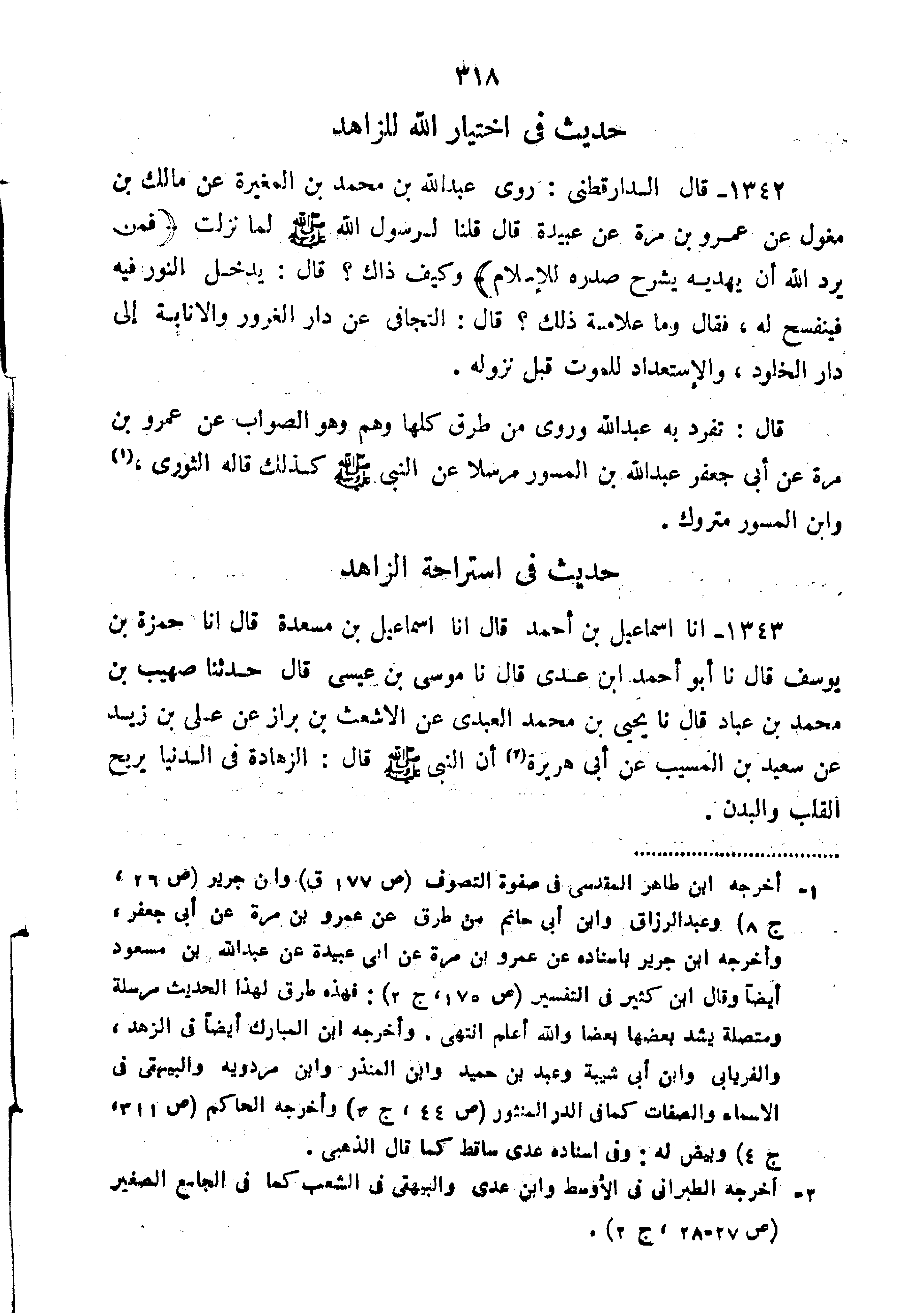1342-قَالَ الدَّارَقُطْنِيُّ رَوَى عَبْدُ اللَّهِ بْنُ مُحَمَّدِ بْنِ الْمُغِيرَةَ عَنْ مَالِكِ بْنِ مِغْوَلٍ عَنْ عَمْرِو بْنِ مُرَّةَ عَنْ عُبَيْدَةَ قَالَ قُلْنَا لِرَسُولِ اللَّهِ صَلَّى اللَّهُ عَلَيْهِ وَسَلَّمَ لَمَّا نَزَلَتْ (فَمَنْ يُرِدِ اللَّهُ أَنْ يَهْدِيَهُ يَشْرَحْ صدره للإسلام) وَكَيْفَ ذَاكَ قَالَ "يَدْخُلُ النُّورُ فِيهِ فَيَنْفَسِخُ لَهُ فَقَالَ وَمَا عَلامَةُ ذَلِكَ قَالَ التَّجَافِي عَنْ دَارِ الْغُرُورِ وَالإِنَابَةُ إِلَى دَارِ الْخُلُودِ وَالاسْتِعْدَادُ لِلْمَوْتِ قَبْلَ نُزُولِهِ".