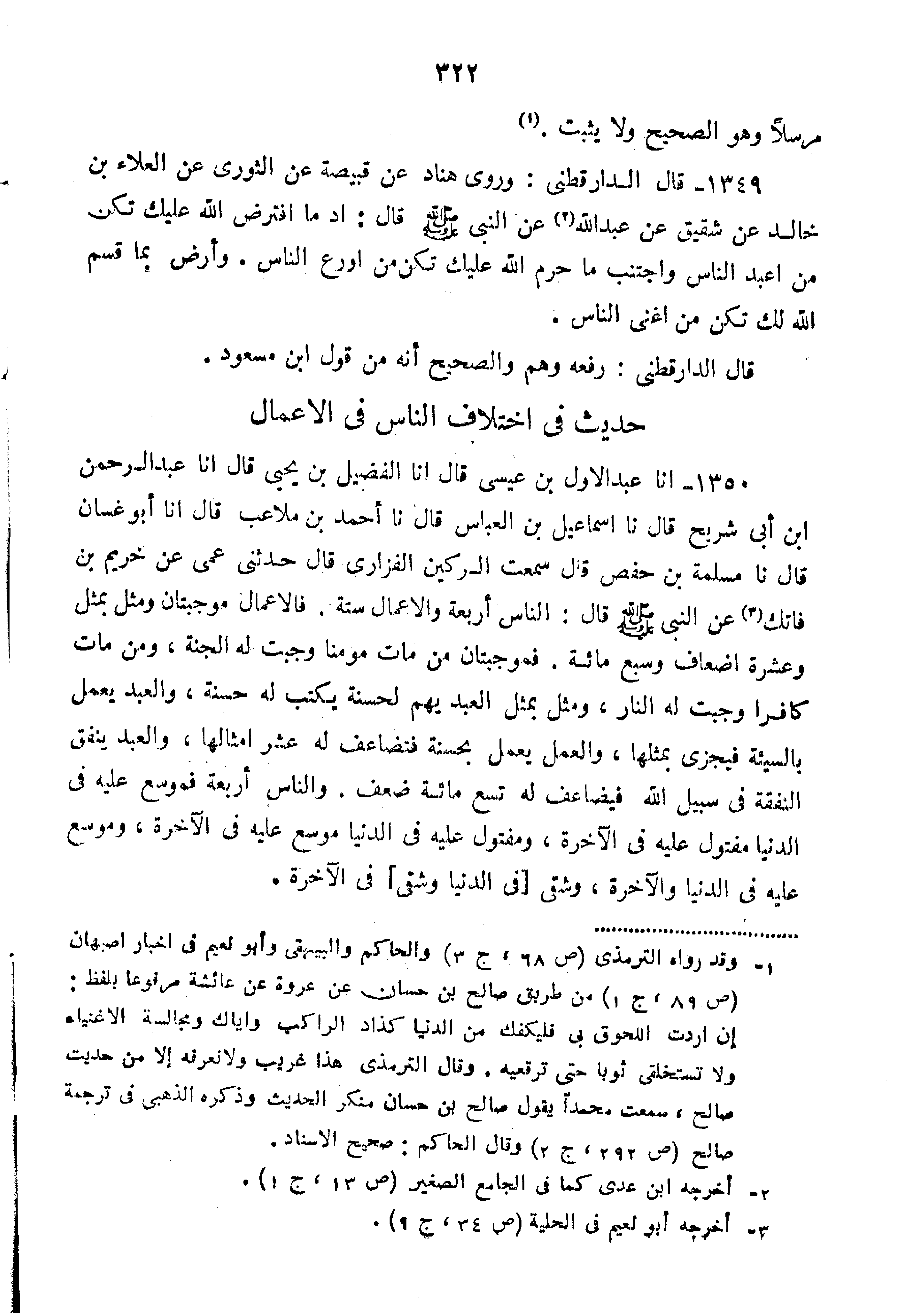 1349-قَالَ الدَّارَقُطْنِيُّ وَرَوَى هَنَّادٌ عَنْ قَبِيصَةَ عَنِ الثَّوْرِيِّ عَنِ الْعَلاءِ بْنِ خَالِدٍ عَنْ شَقِيقٍ عَنْ عَبْدِ اللَّهِ عَنِ النَّبِيِّ صَلَّى اللَّهُ عليه وسلم قال "د مَا افْتَرَضَ اللَّهُ عَلَيْكَ تَكُنْ مِنْ أَعْبَدِ النَّاسِ وَاجْتَنِبْ مَا حرم الله عليك من تكن أَوْرَعِ النَّاسِ وَارْضَ بِمَا قَسَمَ اللَّهُ لَكَ تَكُنْ مِنْ أَغْنَى النَّاسِ".