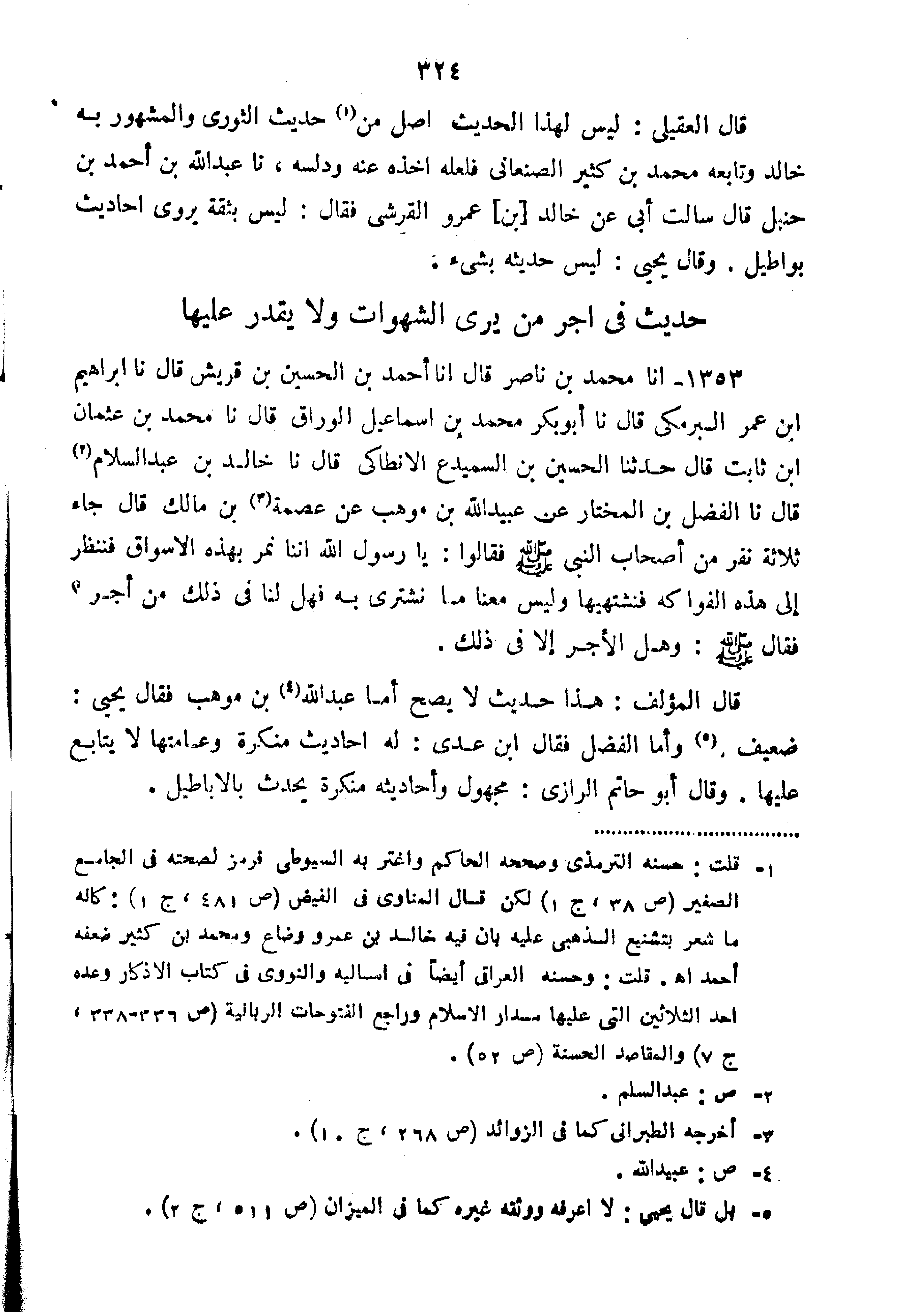 1353-أَنَا مُحَمَّدُ بْنُ نَاصِرٍ قَالَ أَنَا أَحْمَدُ بْنُ الْحُسَيْنِ بْنِ قُرَيْشٍ قَالَ نا إِبْرَاهِيمُ بْنُ عمر البر مكي قَالَ نا أَبُو بَكْرٍ مُحَمَّدُ بْنُ إِسْمَاعِيلَ الْوَرَّاقُ قَالَ نا مُحَمَّدُ بْنُ عُثْمَانَ بْنِ ثَابِتٍ قَالَ حَدَّثَنَا الْحُسَيْنُ بْنُ السَّمَيْدَعِ الأَنْطَاكِيُّ قَالَ نا خَالِدُ بْنُ عَبْدِ السَّلامِ قَالَ نا الْفَضْلُ بْنُ الْمُخْتَارِ عَنْ عُبَيْدِ اللَّهِ بْنُ مَوْهِبٍ عَنْ عِصْمَةَ بْنِ مَالِكٍ قَالَ جَاءَ ثَلاثَةُ نَفَرٍ مِنْ أَصْحَابِ النَّبِيِّ صَلَّى اللَّهُ عَلَيْهِ وَسَلَّمَ فَقَالُوا يَا رَسُولَ اللَّهِ إِنَّنَا نَمُرُّ بِهَذِهِ الأَسْوَاقِ فَنَنْظُرُ إِلَى هَذِهِ الْفَوَاكِهِ فَنَشْتَهِيهَا مَا نَشْتَرِي بِهِ فَهَلْ لَنَا فِي ذَلِكَ مِنْ أَجْرٍ فَقَالَ صَلَّى اللَّهُ عَلَيْهِ وَسَلَّمَ" وَهَلِ الأَجْرُ إِلا فِي ذَلِكَ".