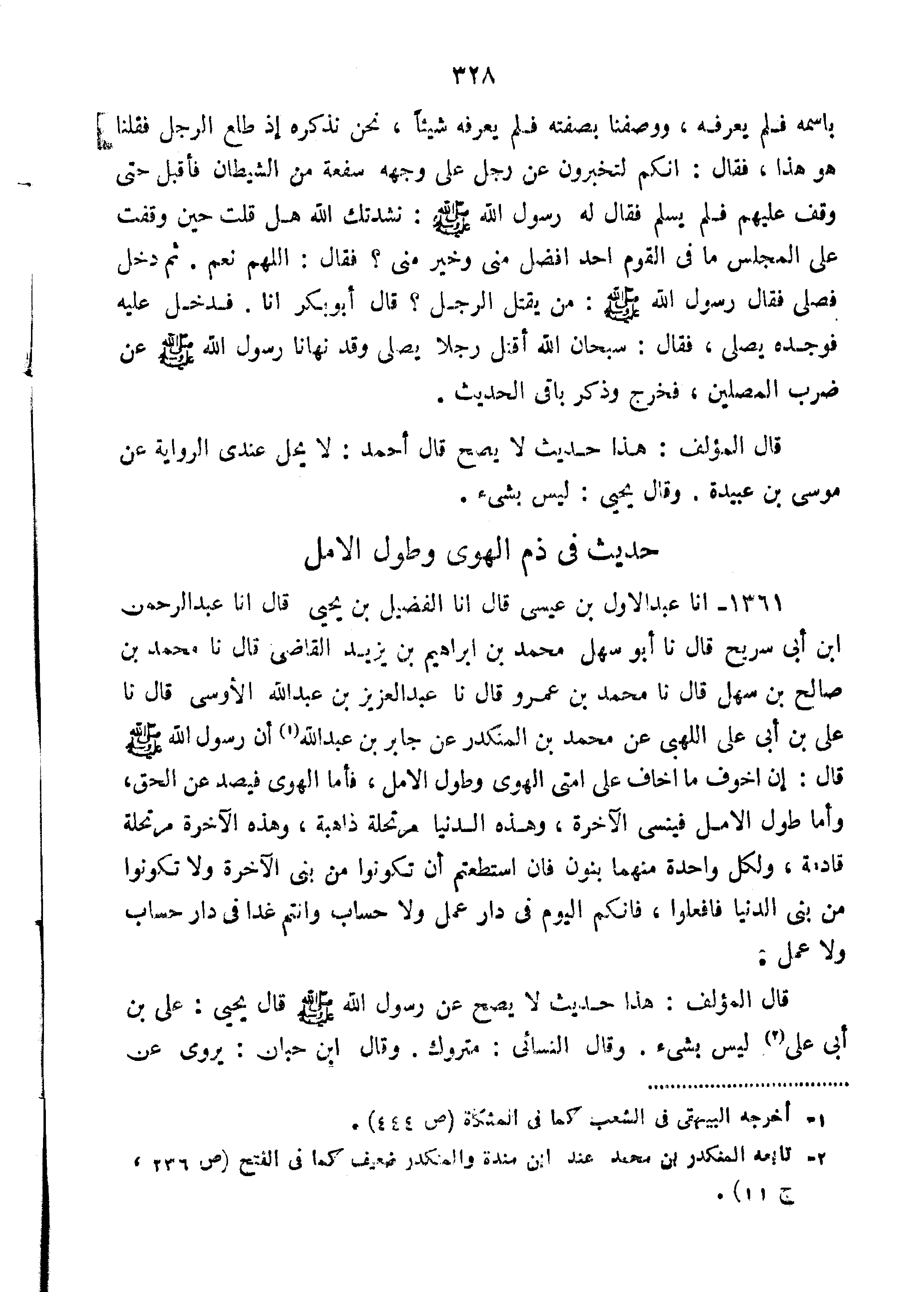 1361-أَنَا عَبْدُ الأَوَّلِ بْنُ عِيسَى قَالَ أَنَا الْفُضَيْلُ بْنُ يَحْيَى قَالَ أَنَا عَبْدُ الرَّحْمَنِ بْنُ أَبِي سُرَيْحٍ قَالَ نا أَبُو سَهْلٍ مُحَمَّدُ بْنُ إِبْرَاهِيمَ بْنِ يَزِيدَ الْقَاضِي قَالَ نا مُحَمَّدُ بْنُ صَالِحِ بْنِ سَهْلٍ قَالَ نا مُحَمَّدُ بْنُ عَمْرٍو قَالَ نَا عَبْدُ الْعَزِيزِ بْنِ عَبْدِ اللَّهِ الأَوْسِيُّ قَالَ نا عَلِيُّ بْنُ أَبِي عَلِيٍّ اللَّهْبِيُّ عَنْ مُحَمَّدُ بْنُ الْمُنْكَدِرِ عَنْ جَابِرٍ بْنِ عَبْدِ اللَّهِ أَنّ رَسُولَ اللَّهِ صَلَّى اللَّهُ عَلَيْهِ وَسَلَّمَ قَالَ "إِنَّ أَخْوَفُ مَا أَخَافُ عَلَى أُمَّتِي الْهَوَى وَطُولُ الأَمَلِ فَأَمَّا الْهَوَى فَيَصُدُّ عَنِ الْحَقِّ وَأَمَّا طُولُ الأَمَلِ فَيُنْسِي الآخِرَةَ وَهَذِهِ الدُّنْيَا مُرْتَحِلَةٌ ذَاهِبَةٌ وَهَذِهِ الآخِرَةُ مُرْتَحِلَةٌ قَادِمَةٌ وَلِكُلِّ وَاحِدَةٍ مِنْهُمَا بَنُونَ فَإِنِ اسْتَطَعْتُمْ أَنْ تَكُونُوا مِنْ بَنِي الآخِرَةِ وَلا تَكُونُوا مِنْ بَنِي الدُّنْيَا فَافْعَلُوا فَإِنَّكُمُ الْيَوْمَ فِي دَارِ عَمَلٍ وَلا حِسَابٍ وَأَنْتُمْ غَدًا فِي دَارِ حِسَابٍ وَلا عَمَلٍ".