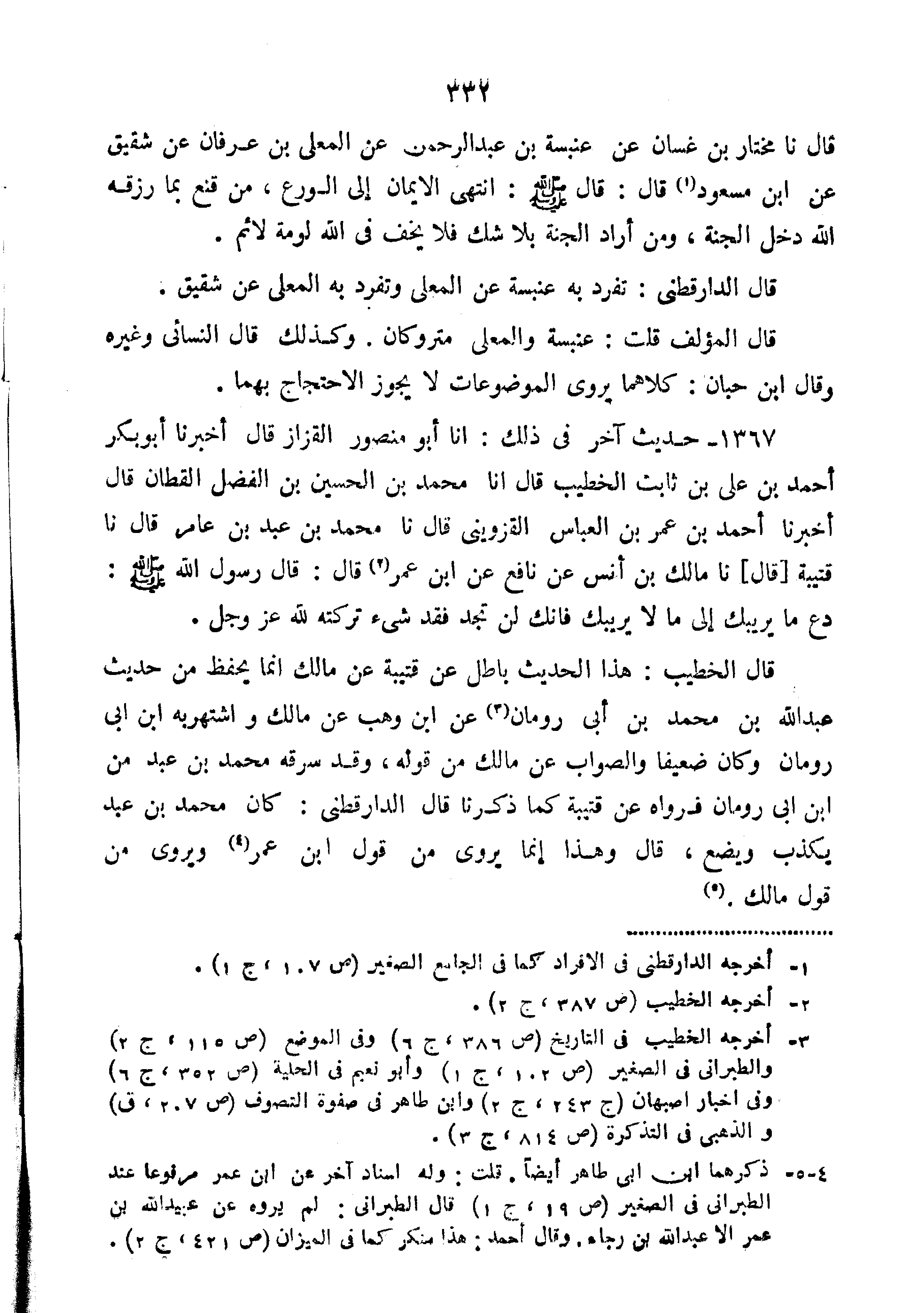 1367-حَدِيثٌ آخَرُ فِي ذَلِكَ أَنَا أَبُو مَنْصُورٍ الْقَزَّازُ قَالَ أَخْبَرَنَا أَبُو بكر أحمد بن علي ثَابِتٍ الْخَطِيبُ قَالَ أَنَا مُحَمَّدُ بْنُ الْحُسَيْنِ بْنِ الْفَضْلِ الْقَطَّانُ قَالَ أَخْبَرَنَا أَحْمَدُ بْنُ عُمَرَ بن العباس القز ويني قَالَ نا مُحَمَّدُ بْنُ عَبْدِ بْنِ عَامِرٍ قَالَ نا قُتَيْبَةُ قَالَ نا مَالِكُ بْنُ أَنَسٍ عَنْ نَافِعٍ عَنِ ابْنِ عُمَرَ قَالَ: قَالَ رَسُولُ اللَّهِ صَلَّى اللَّهُ عَلَيْهِ وَسَلَّمَ: "دَعْ مَا يَرِيبُكَ إِلَى مَا لا يَرِيبُكُ فَإِنَّكَ لَنْ تَجِدَ فَقْدَ شَيْءٍ تَرَكْتَهُ لِلَّهِ عَزَّ وَجَلَّ".
