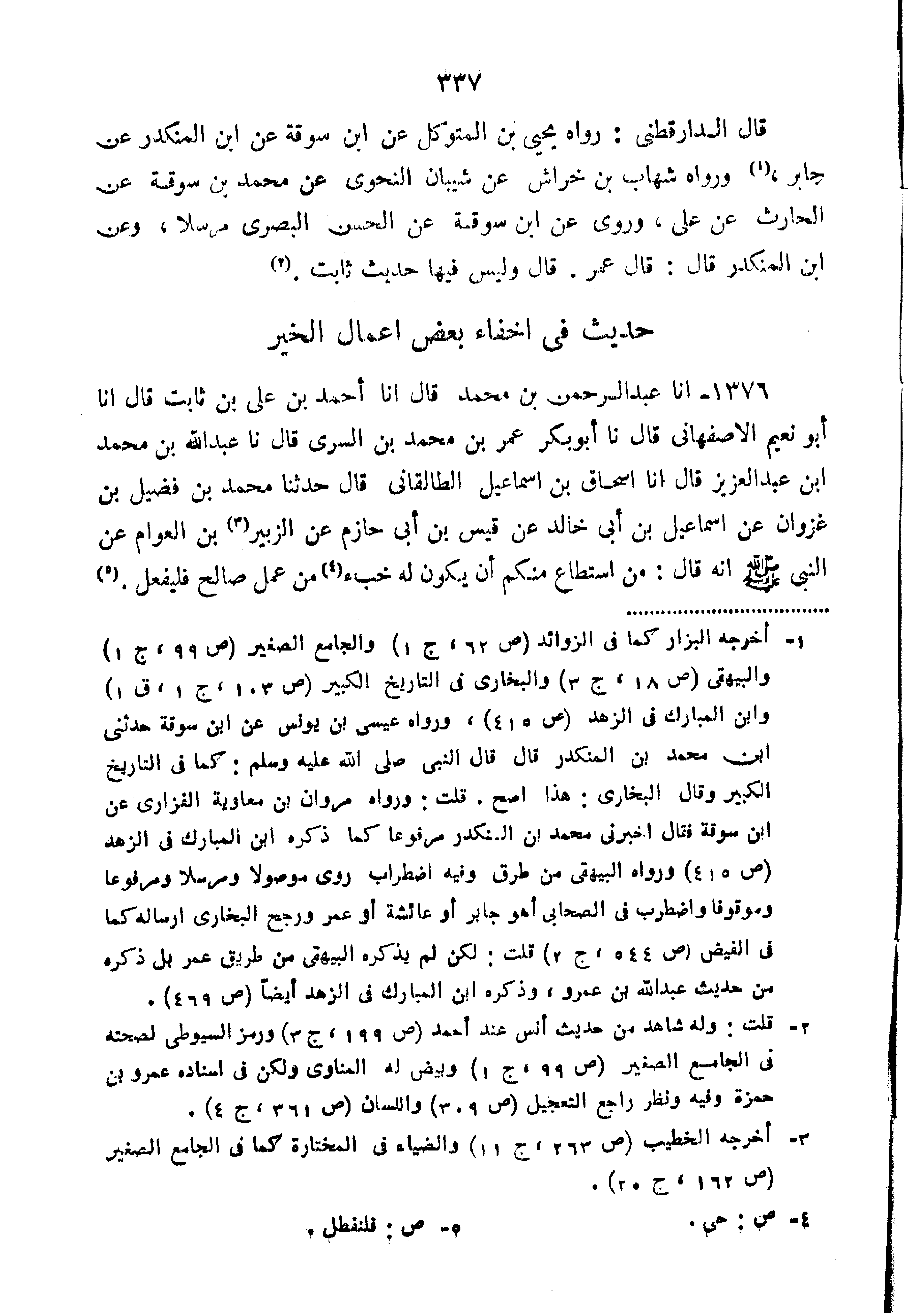 1376-أَنَا عَبْدُ الرَّحْمَنِ بْنُ مُحَمَّدٍ قَالَ أَنَا أَحْمَدُ بْنُ عَليِّ بْنِ ثَابِتٍ قَالَ أَنَا أَبُو نُعَيْمٍ الأَصْفَهَانِيُّ قَالَ نا أَبُو بَكْرٍ عُمَرُ بْنُ مُحَمَّدِ بْنِ السُّرِّيِّ قَالَ نا عَبْدُ اللَّهِ بْنُ مُحَمَّدِ ابن عَبْدِ الْعَزِيزِ قَالَ أَنَا إِسْحَاقُ بْنُ إِسْمَاعِيلَ الطَّالْقَانِيُّ قَالَ حَدَّثَنَا مُحَمَّدُ بْنُ فُضَيْلِ بْنِ غَزْوَانَ عَنْ إِسْمَاعِيلَ بْنِ أَبِي خَالِدٍ عَنْ قَيْسِ بْنِ أَبِي حَازِمٍ عَنِ الزُّبَيْرِ بْنِ الْعَوَّامِ عَنِ النَّبِيَّ صَلَّى اللَّهُ عَلَيْهِ وَسَلَّمَ أَنَّهُ قَالَ "مَنِ اسْتَطَاعَ مِنْكُمْ أَنْ يَكُونَ لَهُ خَبَأٌ مِنْ عمل صالح فليفعل".