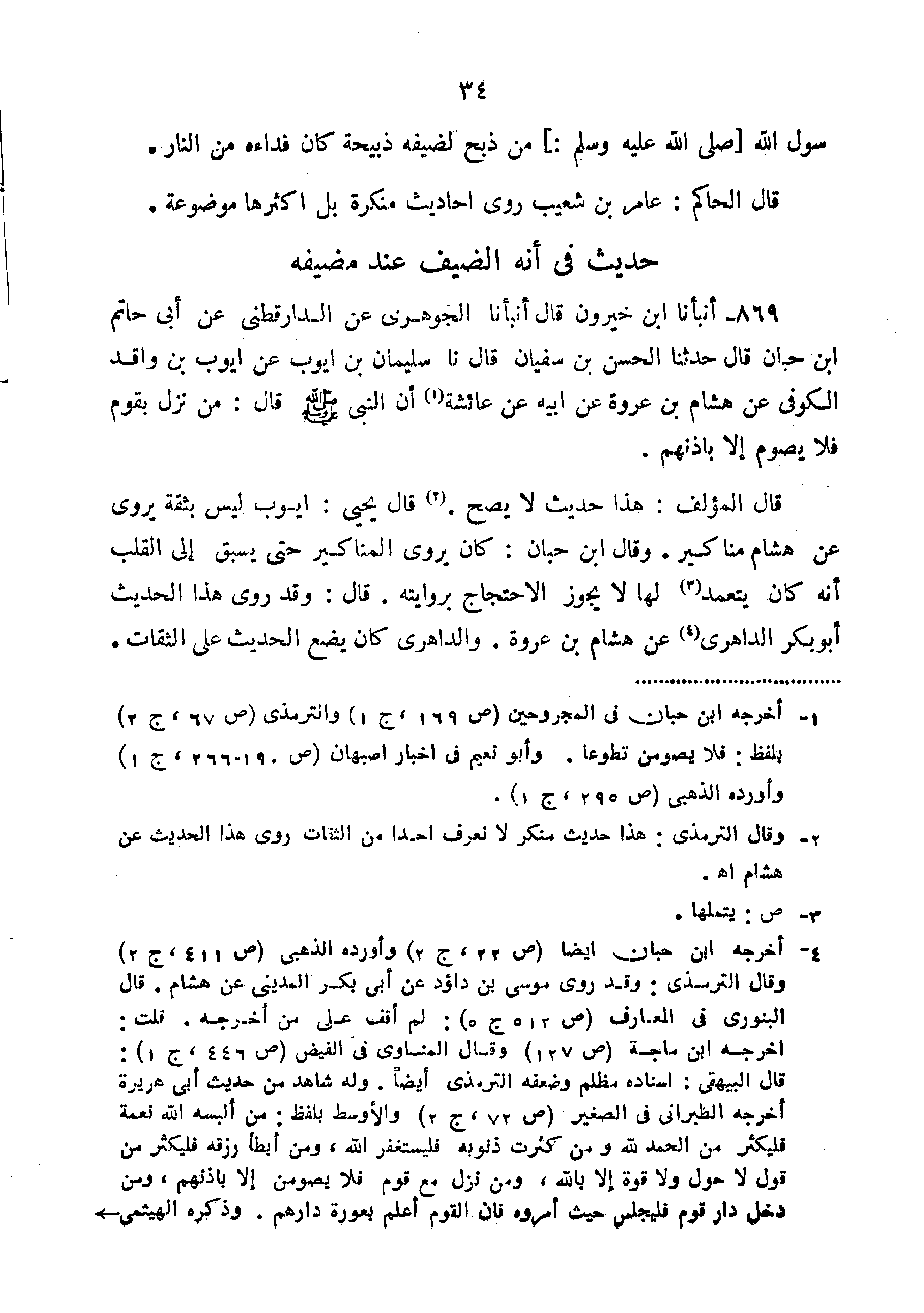 869-أَنْبَأَنَا ابْنُ خَيْرُونَ قَالَ أَنْبَأَنَا الْجَوْهَرِيُّ عَنِ الدَّارَقُطْنِيِّ عَنْ أبي حاتم ابن حِبَّانَ قَالَ حَدَّثَنَا الْحَسَنُ بْنُ سُفْيَانَ قَالَ نا سُلَيْمَانُ بْنُ أَيُّوبَ عَنْ أَيُّوبَ بْنِ وَاقِدٍ الْكُوفِيِّ عَنْ هِشَامِ بْنِ عُرْوَةَ عَنْ أَبِيهِ عَنْ عَائِشَةَ أَنّ النَّبِيَّ صَلَّى اللَّهُ عَلَيْهِ وَسَلَّمَ قَالَ " مَنْ نَزَلَ بِقَوْمٍ فَلا يصوم إِلا بِإِذْنِهِمْ".