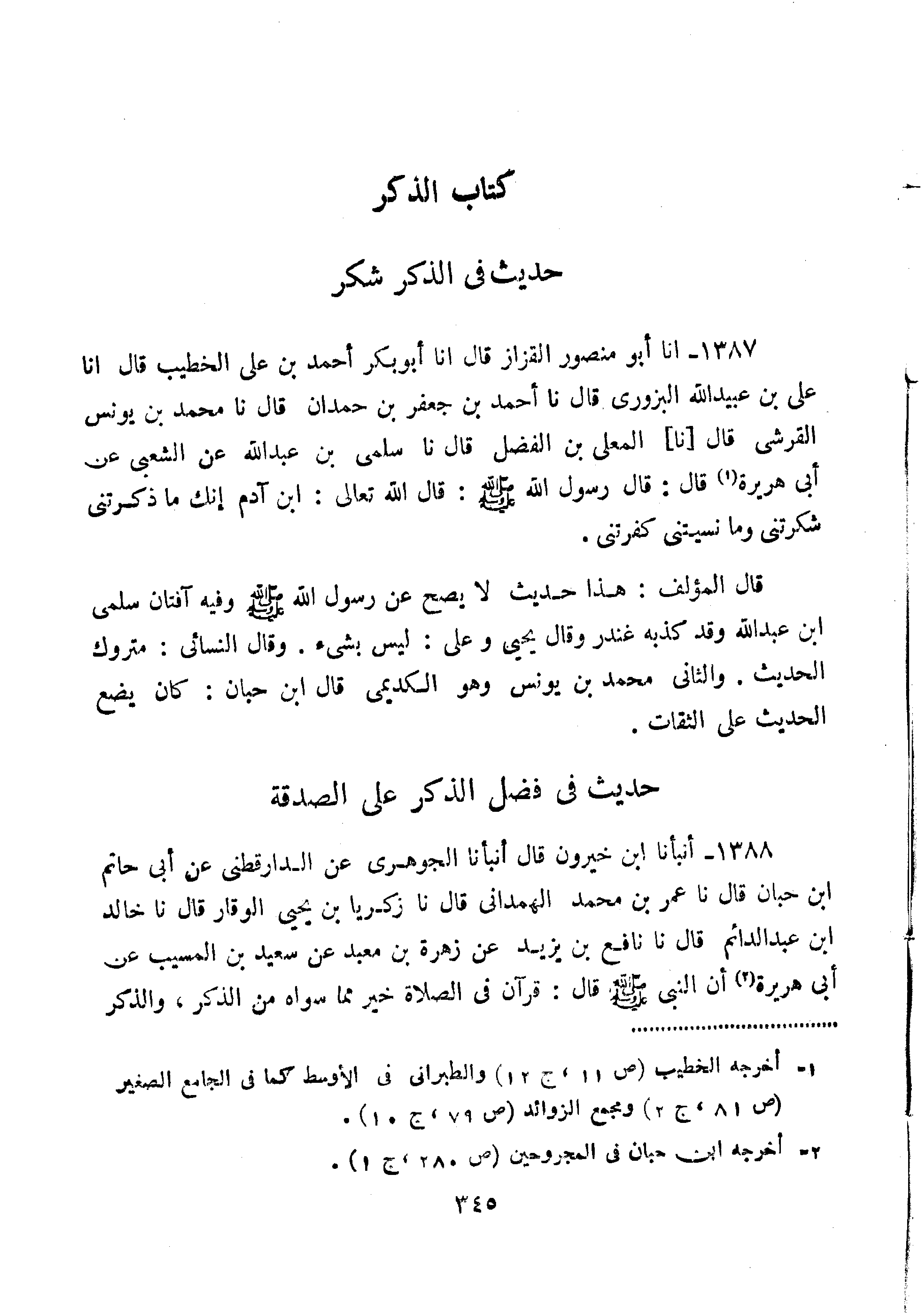1387-أَنَا أَبُو مَنْصُورِ الْقَزَّازُ قَالَ نا أَبُو بَكْرٍ أَحْمَدُ بْنُ عَلِيٍّ الْخَطِيبُ قَالَ أَنَا عَلِيُّ بْنُ عُبَيْدِ اللَّهِ الْبَزُورِيُّ قَالَ نا أَحْمَدُ بْنُ جَعْفَرٍ بْنِ حَمْدَانَ قَالَ نا مُحَمَّدُ بْنُ يُونُسَ الْقُرَشِيُّ قَالَ نا الْمُعَلَّى بْنُ الْفَضْلِ قَالَ نا سَلْمَى بْنُ عَبْدِ اللَّهِ عَنِ الشَّعْبِيِّ عَنْ أَبِي هُرَيْرَةَ قَالَ: قَالَ رَسُولُ اللَّهِ صَلَّى اللَّهُ عَلَيْهِ وَسَلَّمَ: "قَالَ اللَّهُ تَعَالَى ابْنَ آدَمَ إِنَّكَ مَا ذَكَرْتَنِي شَكَرْتَنِي وَمَا نَسِيتَنِي كَفَرْتَنِي".