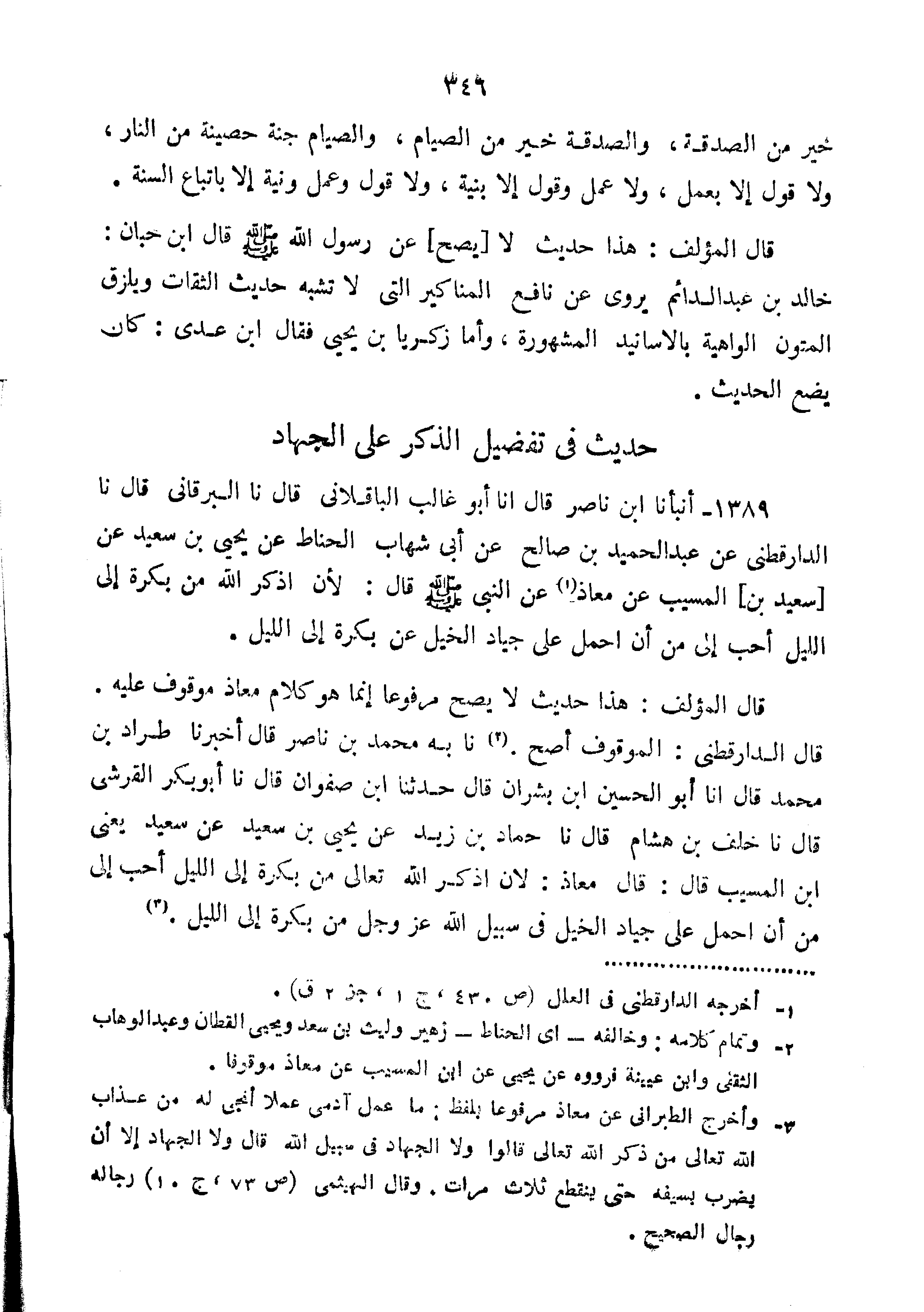1389-أَنْبَأَنَا ابْنُ نَاصِرٍ قَالَ نا أَبُو غَالِبٍ الْبَاقِلَّانِيُّ قَالَ نا الْبَرْقَانِيُّ قَالَ نا الدَّارَقُطْنِيُّ عَنْ عَبْدُ الْحَمِيدِ بْنُ صَالِحٍ عَنْ أَبِي شِهَابٍ الْحَنَّاطِ عَنْ يَحْيَى بْنُ سَعِيدٍ عَنْ سَعِيدِ بْنِ الْمُسَيِّبِ عَنْ مُعَاذٍ عَنِ النَّبِيِّ ص قَالَ "لأَنْ أَذَكُرَ اللَّهَ مِنْ بَكْرَةٍ إِلَى اللَّيْلِ أَحَبُّ إِلَيَّ مِنْ أَنْ أَحْمِلَ عَلَى جِيَادِ الخيل عن بَكْرَةٍ إِلَى اللَّيْلِ".