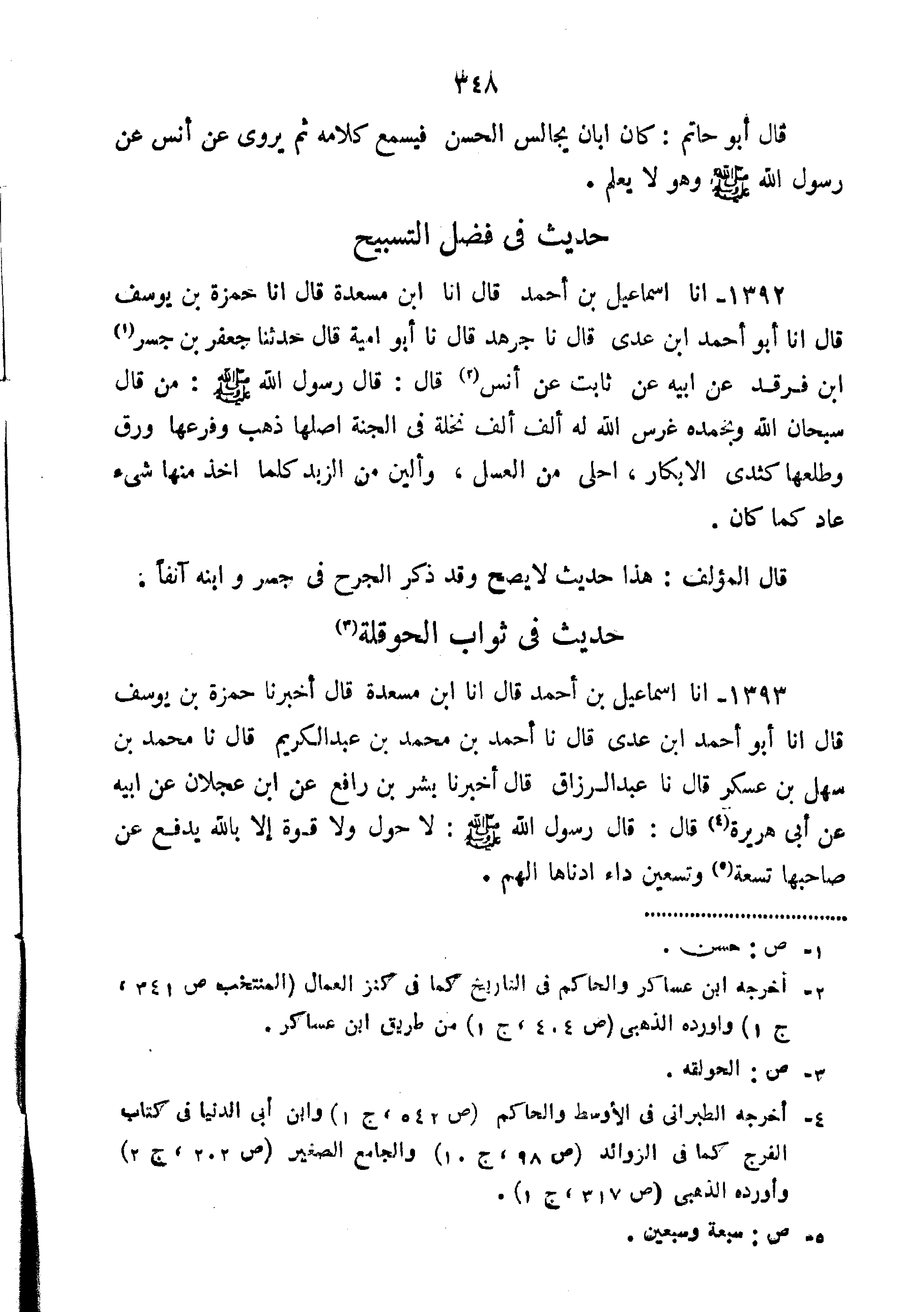 1392-أَنَا إِسْمَاعِيلُ بْنُ أَحْمَدَ قَالَ أَنَا ابْنُ مَسْعَدَةَ قَالَ أَنَا حَمْزَةُ بْنُ يُوسُفَ قَالَ أَنَا أَبُو أَحْمَدَ بْنُ عَدِيٍّ قَالَ نا جَرْهَدٌ قَالَ نا أَبُو أُمَيَّةَ قَالَ حَدَّثَنَا جَعْفَرُ بْنُ جِسْرِ بْنِ فَرْقَدٍ عَنْ أَبِيهِ عَنْ ثَابِتٍ عَنْ أَنَسٍ قَالَ: قَالَ رَسُولُ اللَّهِ صَلَّى اللَّهُ عَلَيْهِ وَسَلَّمَ: "مَنْ قَالَ سُبْحَانَ اللَّهِ وَبِحَمْدِهِ غَرَسَ اللَّهُ لَهُ أَلْفَ نَخْلَةٍ فِي الجنة أصلها ذهب وفرعها ينوي طَلْعُهَا كَثَدْيِ الأَبْكَارِ أَحْلَى مِنَ الْعَسَلِ وَأَلْيَنَ مِنَ الزُّبْدِ كُلَّمَا أُخِذَ مِنْهَا شَيْءٌ عَادَ كَمَا كَانَ".