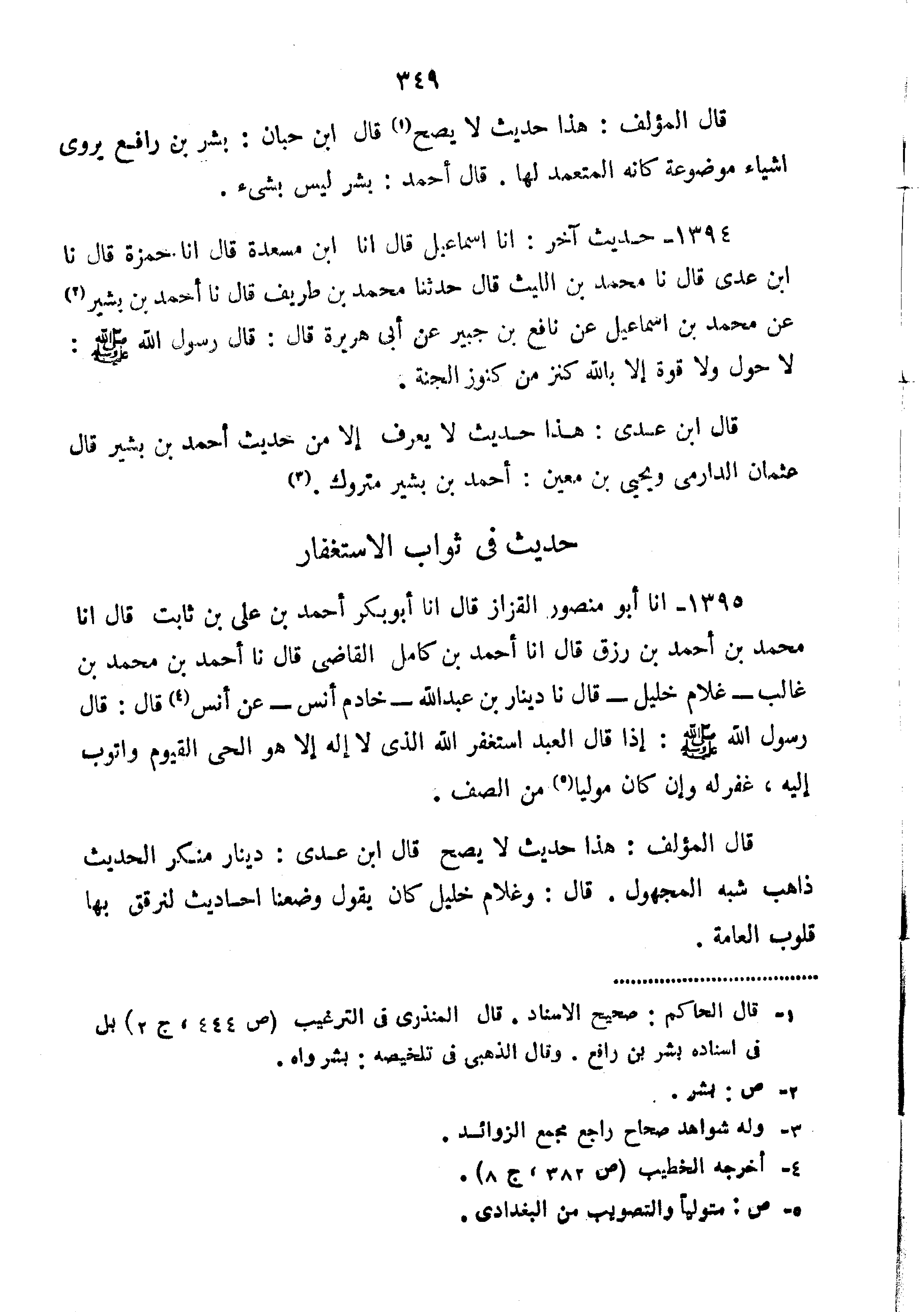 قال المؤلف: "هَذَا حديث لا يَصِحُّ".قَالَ ابْنُ حَبَّانَ: "بشر بْن رافع يروي أشياء موضوعة كأنه المتعمد لها".قال احمد: "بشر ليس بشيء".