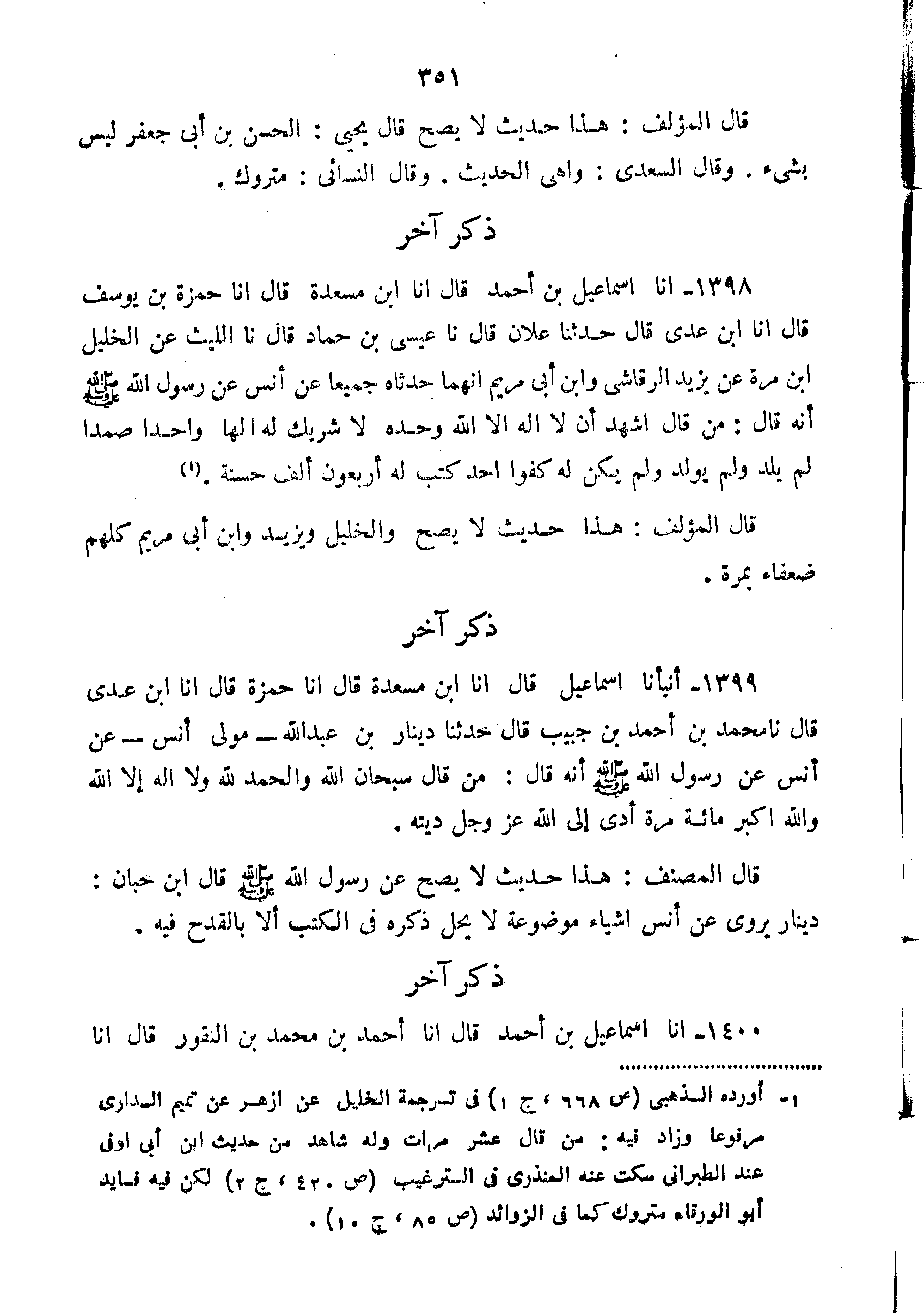 1399-أَنْبَأَنَا إِسْمَاعِيلُ قَالَ أَنَا ابْنُ مَسْعَدَةَ قَالَ أَنَا حَمْزَةُ قَالَ أَنَا ابْنُ عَدِيٍّ قَالَ نا مُحَمَّدُ بْنُ أَحْمَدَ بْنِ حَبِيبٍ قَالَ حَدَّثَنَا دِينَارُ بْنُ عَبْدِ الله مولى يروي عن أَنَس عن رسول اللَّهِ صَلَّى اللَّهُ عَلَيْهِ وَسَلَّمَ أَنَّهُ قَالَ "مَنْ قَالَ سُبْحَانَ اللَّهِ وَالْحَمْدُ لِلَّهِ وَلا إِلَهَ إِلا اللَّهُ وَاللَّهُ أَكْبَرُ مِائَةَ مَرَّةٍ أَدَّى إِلَى اللَّهِ عَزَّ وجل ديته".