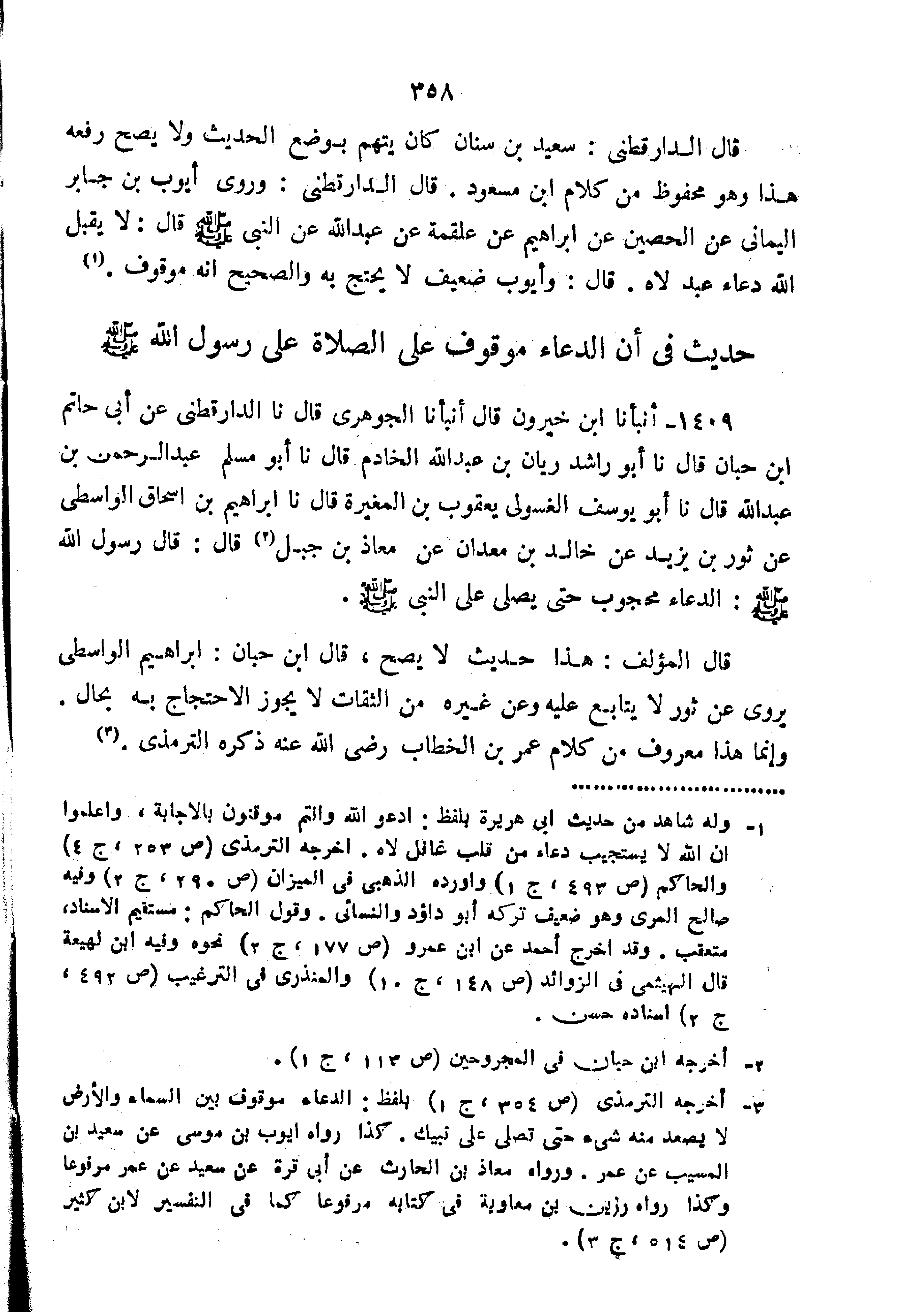 1409-أَنْبَأَنَا ابْنُ خَيْرُونَ قَالَ أنبأنا الجوهري قال نا الدراقطني عَنْ أَبِي حَاتِمِ بْنِ حَبّانَ قَالَ نا أَبُو رَاشِدٍ رَيَّانُ بْنُ عَبْدِ اللَّهِ الْخَادِمُ قَالَ نا أَبُو مُسْلِمٍ عَبْدُ الرَّحْمَنِ بْنُ عَبْدِ اللَّهِ قَالَ نا أَبُو يُوسُفَ الْغَسُولِيُّ يَعْقُوبُ بْنُ المغيرة قال نا إبراهيم ابن إسحاق الو اسطي عَنْ ثَوْرِ بْنِ يَزِيدَ عَنْ خَالِدِ بْنِ مَعْدَانَ عَنْ مُعَاذِ بْنِ جَبَلٍ قَالَ: قَالَ رَسُولُ اللَّهِ صَلَّى اللَّهُ عَلَيْهِ وَسَلَّمَ: "الدُّعَاءُ مَحْجُوبٌ حَتَّى يُصَلَّى عَلَى النَّبِيَّ صَلَّى اللَّهُ عَلَيْهِ وَسَلَّمَ".