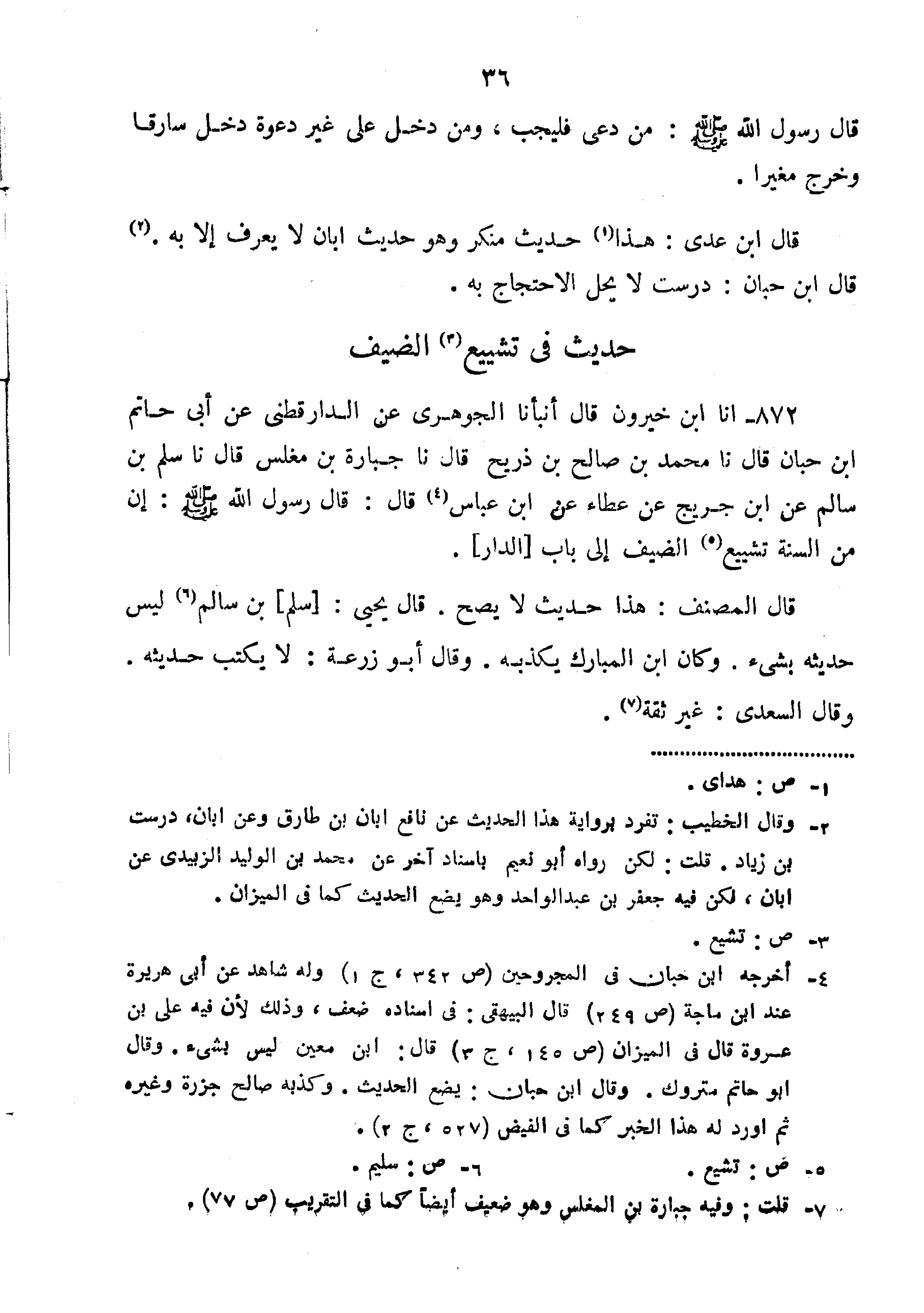 872-أَنَا ابْنُ خَيْرُونَ قَالَ أَنْبَأَنَا الْجَوْهَرِيُّ عَنِ الدَّارَقُطْنِيِّ عَنْ أَبِي حَاتِمِ ابن حَبَّانَ قَالَ نا مُحَمَّدُ بْنُ صَالِحِ بْنِ ذَرِيحٍ قَالَ نا جِبَارَةُ بْنُ مُغَلِّسٍ قَالَ نا سَلَمُ بْنُ سَالِمٍ عَنِ ابْنِ جُرَيْجٍ عَنْ عَطَاءٍ عَنِ ابْنِ عَبَّاسٍ قَالَ: قَالَ رَسُولُ اللَّهِ صَلَّى اللَّهُ عَلَيْهِ وَسَلَّمَ: "إِنَّ مِنَ السُّنَّةِ تَشْيِيعَ الضَّيْفِ إِلَى باب الدار".