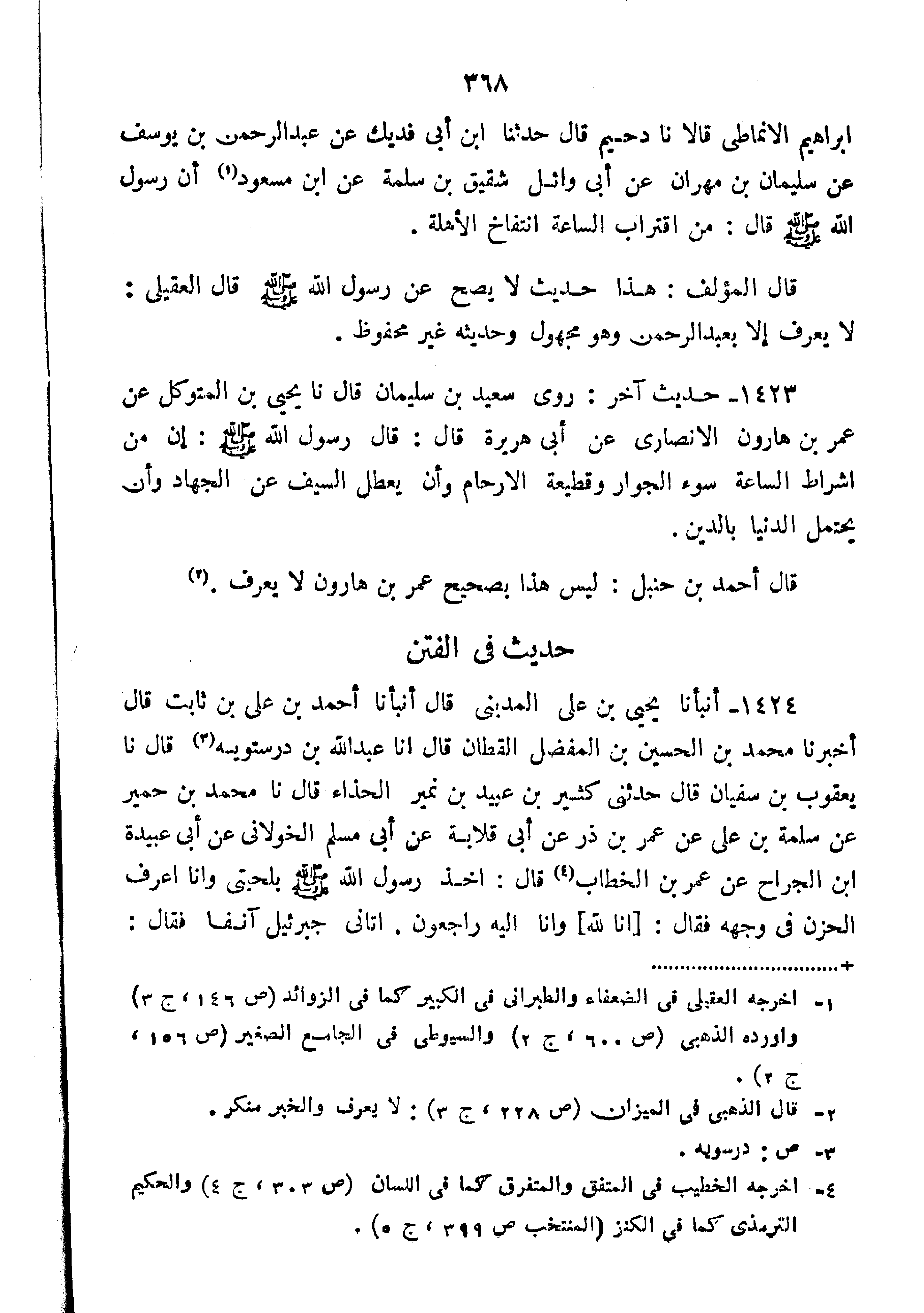 قَالَ أَحْمَدُ بْنُ حَنْبَلٍ لَيْسَ هَذَا بصحيح عُمَر بْن هارون لا يعرف".