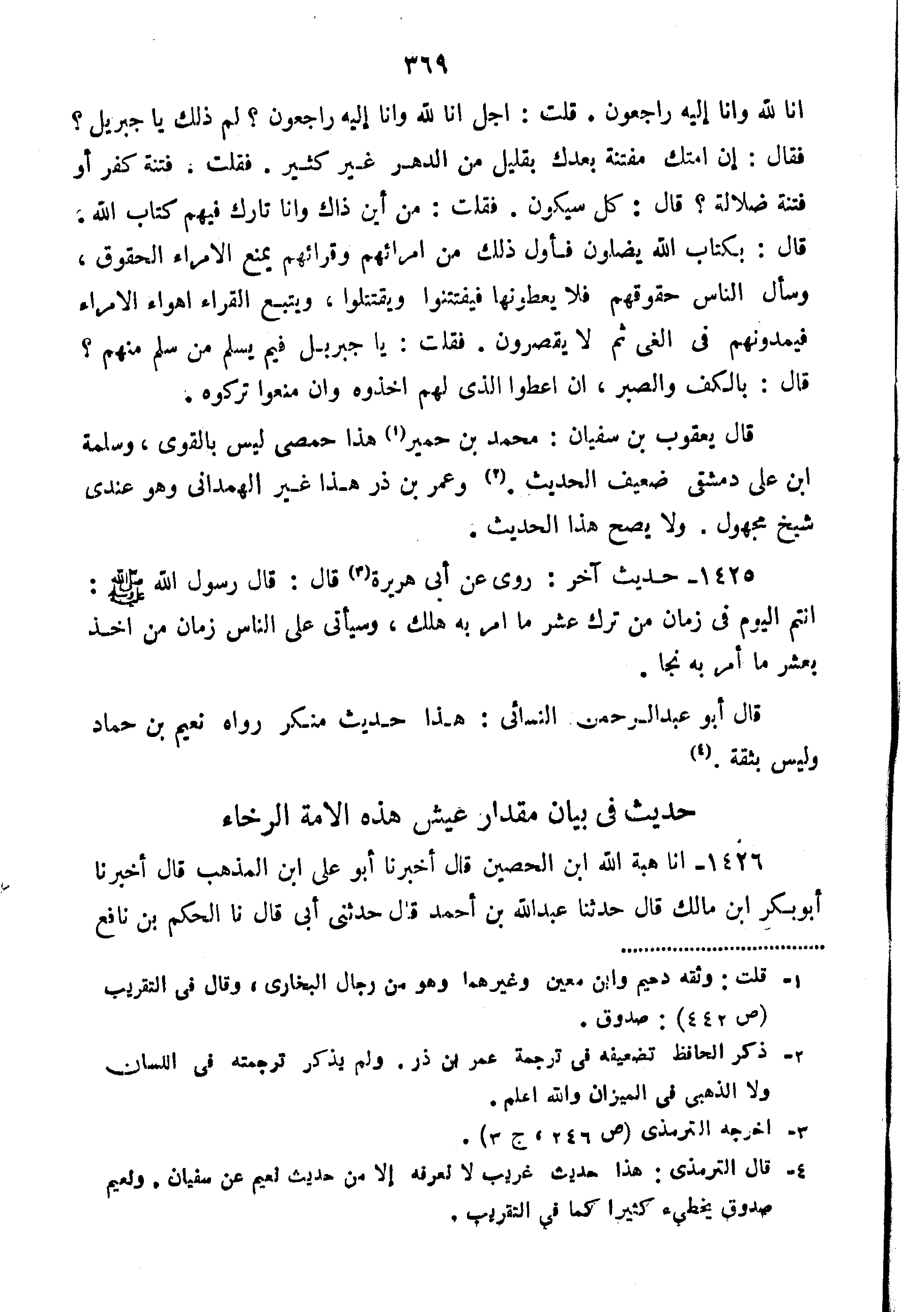 إِنَّا لِلَّهِ وَإِنَّا إِلَيْهِ رَاجِعُونَ قُلْتُ: أَجَلْ إِنَّا لِلَّهِ وَإِنَّا إِلَيْهِ رَاجِعُونَ؟ لِمَ ذَلِكَ يَا جِبْرِيلُ؟ فَقَالَ إِنَّ أُمَّتَكَ مُفْتَنَةٌ بعدك قليل من كَثِيرٍ فَقُلْتُ فِتْنَةُ كُفْرٍ أَوْ فِتْنَةٌ ضَلالَةٍ قَالَ كُلٌّ سَيَكُونُ فَقُلْتُ مِنْ أَيْنَ ذَاكَ وَأَنَا تَارِكٌ فِيهِمْ كِتَابَ اللَّهِ قَالَ بِكِتَابِ اللَّهِ يَضِلُّونَ فَأَوَّلُ ذَلِكَ مِنْ أُمَرَائِهِمْ وَقُرَّائِهِمْ يَمْنَعُ الأُمَرَاءُ الْحُقُوقَ وَسَأَلَ النَّاسُ حُقُوقَهُمْ فَلا يُعْطُونَهَا فَيُفْتَنُوا وَيَقْتَتِلُوا وَيَتْبَعُ الْقُرَّاءُ أَهْوَاءَ الأُمَرَاءِ فَيَمُدُّونَهُمْ فِي الْغَيِّ ثُمَّ لا يَقْصِرُونَ فَقُلْتُ يَا جِبْرِيلُ فِيمَ يَسْلَمُ مَنْ سَلِمَ مِنْهُمْ؟ قَالَ بِالْكَفِّ وَالصَّبْرِ إِنْ أُعْطُوا الَّذِي لَهُمْ أَخَذُوهُ وَإِنْ مُنِعُوا تَرَكُوهُ". قال يعقوب بْن سُفْيَان مُحَمَّد بْن حمير هَذَا حمصي ليس بالقوي وسلمة بْن علي دمشقي ضعيف الحديث وعمر بن ذر الهمداني وهو عندي شيخ مجهول ولا يصح هَذَا الحديث".