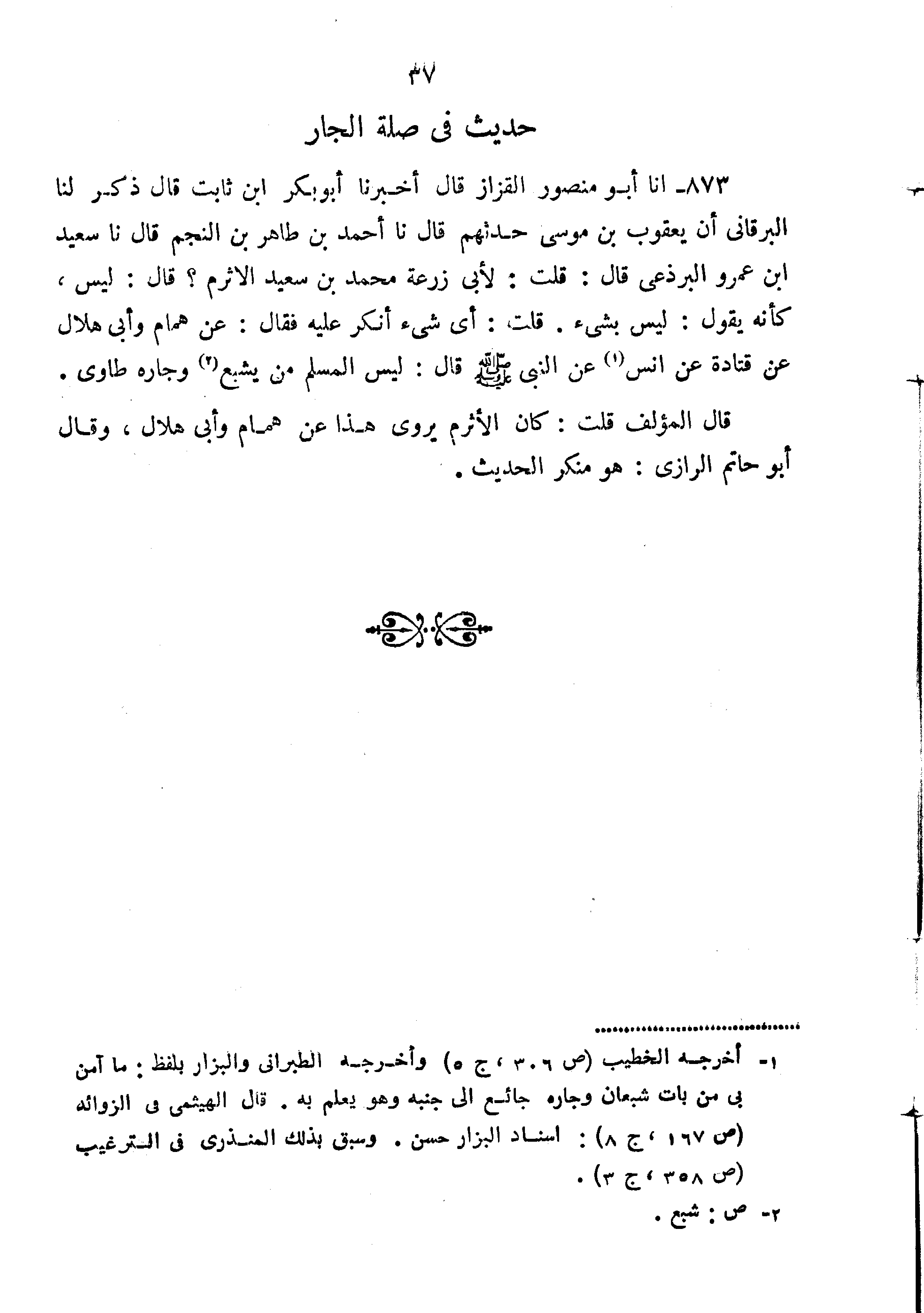 873-أَنَا أَبُو مَنْصُورٍ الْقَزَّازُ قَالَ أَخْبَرَنَا أَبُو بَكْرِ بْنُ ثَابِتٍ قَالَ ذَكَرَ لَنَا الْبَرْقَانِيُّ أَنَّ يَعْقُوبَ بْنَ مُوسَى حَدَّثَهُمْ قَالَ نا أَحْمَدُ بْنُ طَاهِرِ بْنِ النَّجْمِ قَالَ نَا سَعِيدُ بْنُ عَمْرٍو البرذعي قال لأَبِي زُرْعَةَ مُحَمَّدِ بْنِ سَعِيدٍ الأَثْرَمِ قَالَ لَيْسَ كَأَنَّهُ يَقُولُ لَيْسَ بِشَيْءٍ قُلْتُ أَيُّ شَيْءٍ أُنْكِرَ عَلَيْهِ فَقَالَ عَنْ هَمَّامٍ وَأَبِي هِلالٍ عَنْ قَتَادَةَ عَنْ أَنَسٍ عَنِ النَّبِيِّ صَلَّى اللَّهُ عَلَيْهِ وَسَلَّمَ قَالَ لَيْسَ الْمُسْلِمُ مَنْ يَشْبَعُ وَجَارُهُ طَاويٍ".