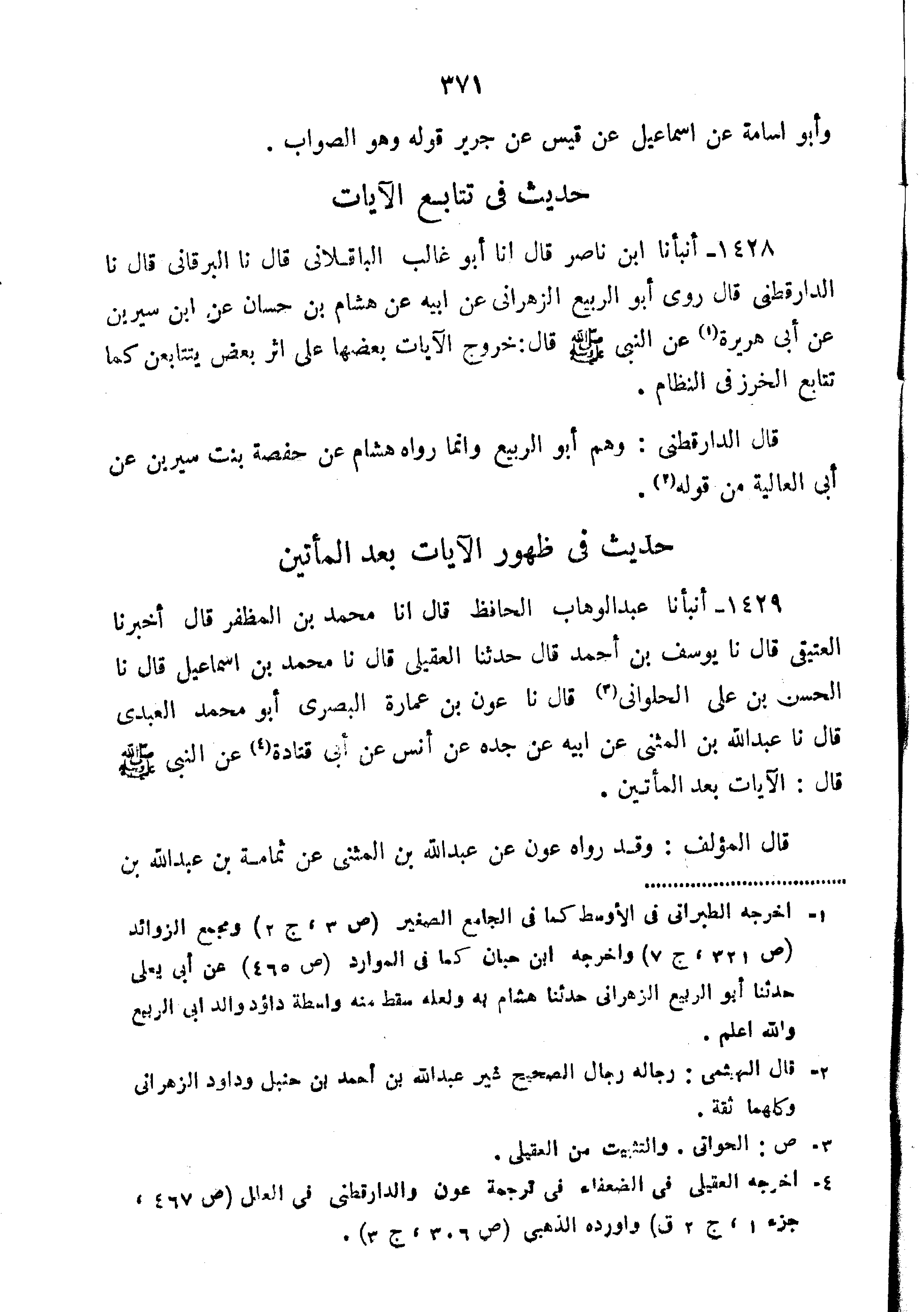 1428-أَنْبَأَنَا ابْنُ نَاصِرٍ قَالَ أَنَا أَبُو غَالِبٍ الْبَاقِلَّانِيُّ قَالَ نا الْبَرْقَانِيُّ قَالَ نا الدَّارَقُطْنِيُّ قَالَ رَوَى أَبُو الرَّبِيعِ الزُّهْرَانِيُّ عَنْ أَبِيهِ عَنْ هِشَامِ بْنِ حَسَّانَ عَنِ ابْنِ سِيرِينَ عَنْ أَبِي هُرَيْرَةَ عَنِ النَّبِيِّ صَلَّى اللَّهُ عَلَيْهِ وَسَلَّمَ قَالَ " خُرُوجُ الآيَاتِ بَعْضُهَا عَلَى أَثَرِ بَعْضٍ يَتَتَابَعْنَ كَمَا تَتَابَعُ الْخَرَزُ فِي النِّظَامِ".