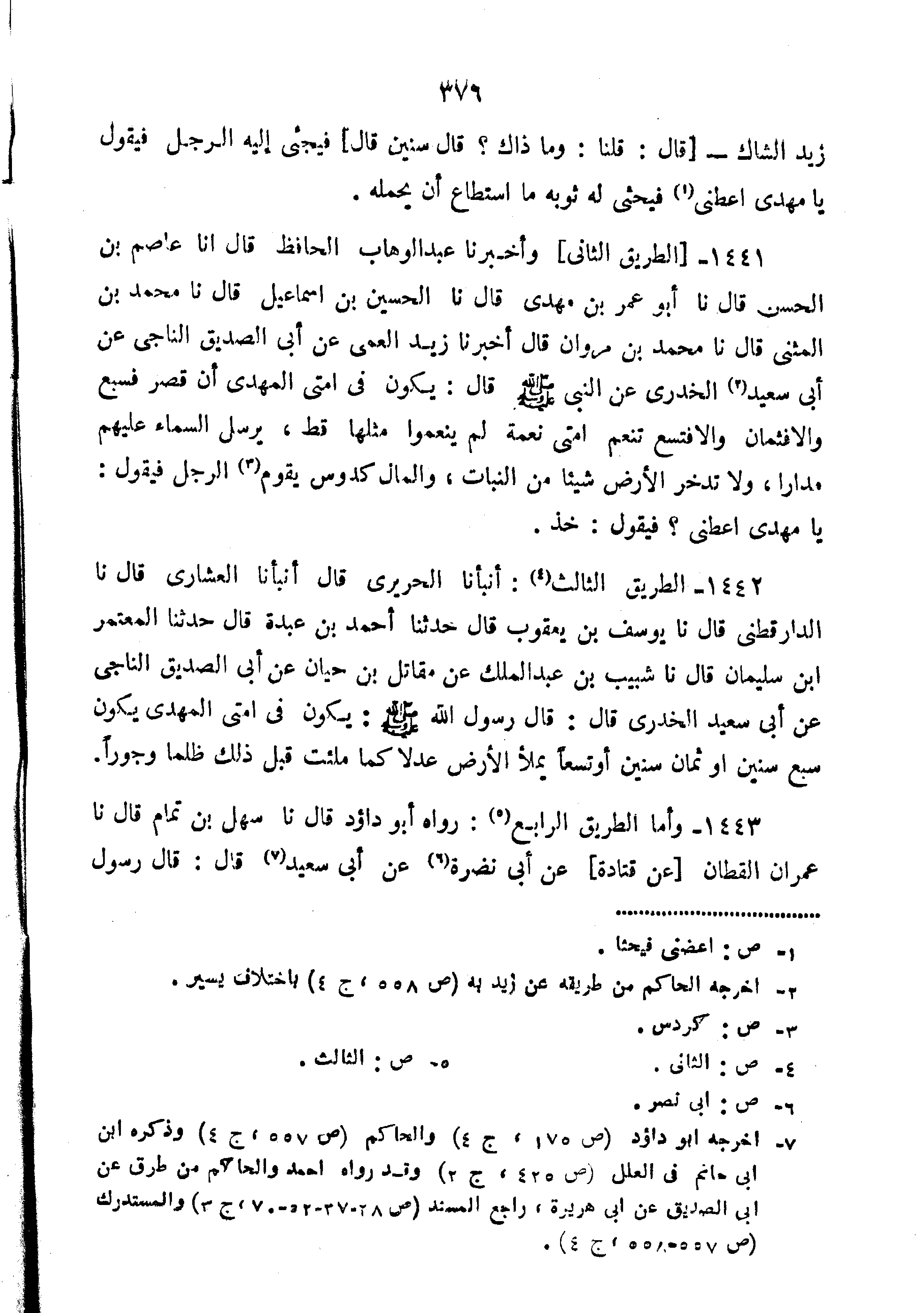 1442-الطَّرِيقُ الثَّالِثُ أَنْبَأَنَا الْحَرِيرِيُّ قَالَ أَنْبَأَنَا الْعُشَارِيُّ قَالَ نا الدَّارَقُطْنِيُّ قَالَ نا يُوسُفُ بْنُ يَعْقُوبَ قَالَ حَدَّثَنَا أَحْمَدُ بْنُ عبدة قال حدثنا المعتر ابن سُلَيْمَانَ قَالَ نا شَبِيبُ بْنُ عَبْدِ الْمَلِكِ عَنْ مُقَاتِلِ بْنِ حَيَّانَ عَنْ أَبِي الصِّدِّيقِ النَّاجِيِّ عَنْ أَبِي سَعِيدٍ الْخُدْرِيِّ قَالَ: قَالَ رَسُولُ اللَّهِ صَلَّى اللَّهُ عَلَيْهِ وَسَلَّمَ: "يَكُونُ فِي أُمَّتِي الْمَهْدِيُّ يَكُونُ سَبْعَ سِنِينَ أَوْ ثَمَانَ سِنِينَ أَوْ تِسْعًا يَمْلأُ الأَرْضَ عَدْلا كَمَا مُلِئَتْ قَبْلَ ذَلِكَ ظُلْمًا وَجَوْرًا".