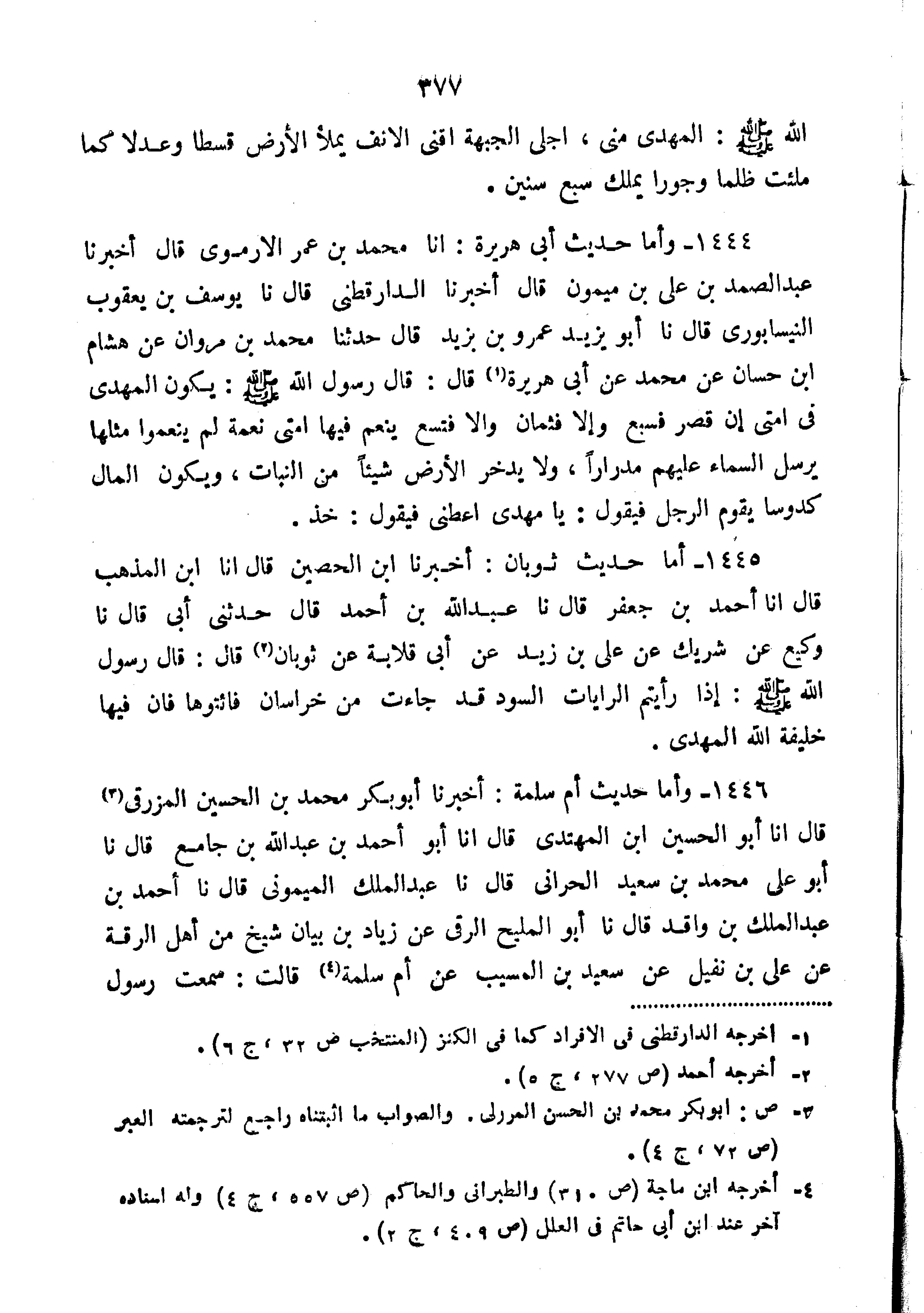 1444-وَأَمَّا حَدِيثُ أَبِي هُرَيْرَةَ أَنَا مُحَمَّدُ بْنُ عُمَرَ الأَرْمَوِيُّ قَالَ أَخْبَرَنَا عَبْدُ الصَّمَدِ بْنُ عَلِيِّ بْنِ مَيْمُونٍ قَالَ أَخْبَرَنَا الدَّارَقُطْنِيُّ قَالَ نا يُوسُفُ بْنُ يَعْقُوبَ النَّيْسَابُورِيُّ قَالَ نا أَبُو يَزِيدَ عَمْرُو بْنُ يَزِيدَ قَالَ حَدَّثَنَا مُحَمَّدُ بْنُ مَرْوَانَ عن هشام ابن حَسَّانَ عَنْ مُحَمَّدٍ عَنْ أَبِي هُرَيْرَةَ قَالَ: قَالَ رَسُولُ اللَّهِ صَلَّى اللَّهُ عَلَيْهِ وَسَلَّمَ: "يَكُونُ الْمَهْدِيُّ فِي أُمَّتِي إِنْ قَصَرَ فَسَبْعٌ وَإِلا فَثَمَانٌ وَإِلا فَتِسْعٌ يُنْعِمُ فِيهَا أُمَّتِي نِعْمَةً لَمْ يَنْعَمُوا مِثْلَهَا يُرْسِلُ السَّمَاءَ عَلَيْهِمْ مدرارا ولا يدخر الأَرْضُ شَيْئًا مِنَ النَّبَاتِ وَيَكُونُ الْمَالُ كُدُوسًا يَقُومُ الرَّجُلُ فَيَقُولُ يَا مَهْدِيُّ أَعْطِنِي فَيَقُولُ خُذْ".