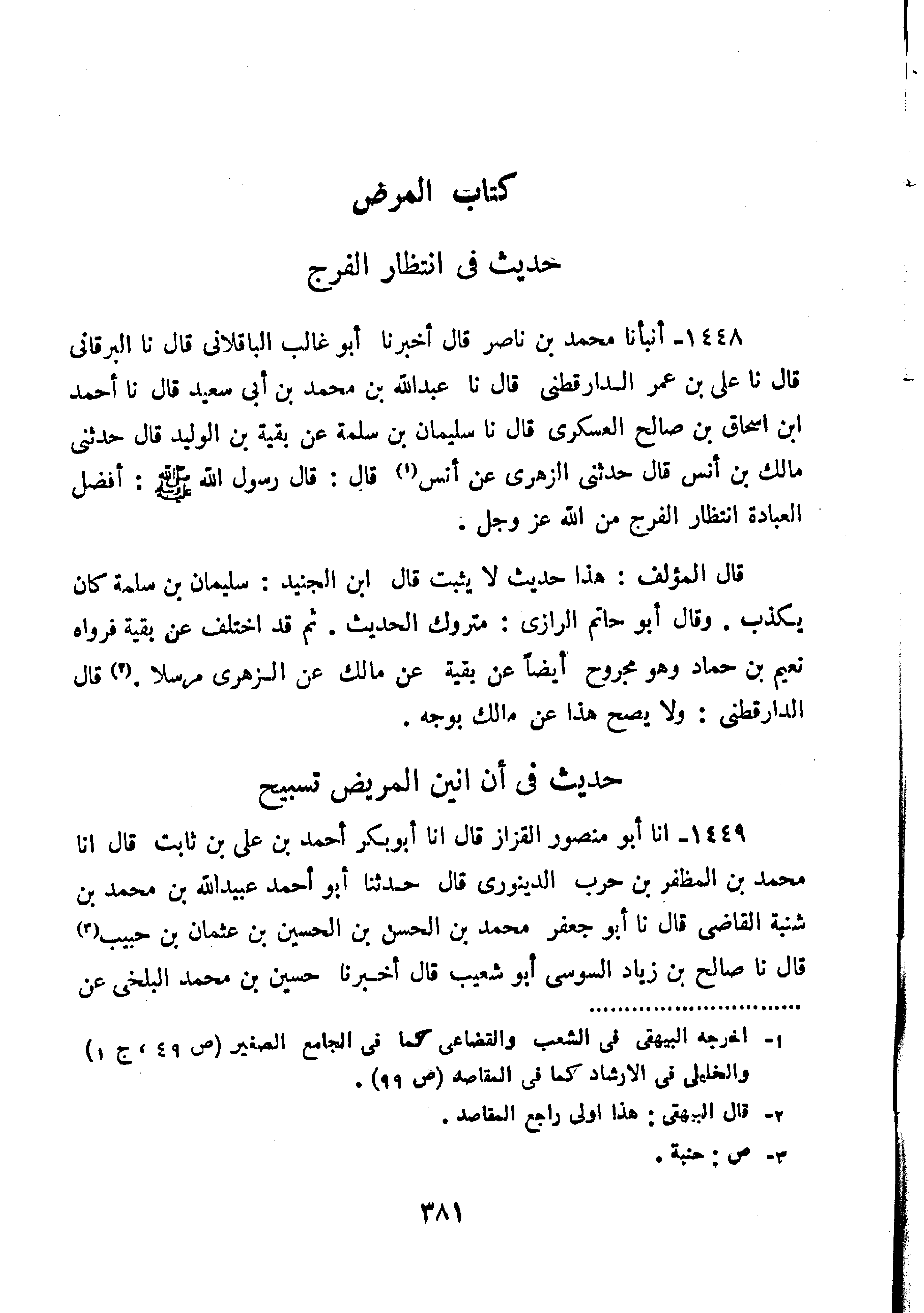 1448-أَنْبَأَنَا مُحَمَّدُ بْنُ نَاصِرٍ قَالَ أَخْبَرَنَا أَبُو غَالِبٍ الْبَاقِلَّانِيُّ قَالَ نا الْبَرْقَانِيُّ قَالَ نا عَلِيُّ بْنُ عُمَرَ الدَّارَقُطْنِيُّ قَالَ نا عَبْدُ اللَّهِ بْنُ مُحَمَّدِ بْنِ أَبِي سَعِيدٍ قَالَ نا أَحْمَدُ بْنُ إِسْحَاقَ بْنِ صَالِحٍ الْعَسْكَرِيُّ قَالَ نا سُلَيْمَانُ بْنُ سَلَمَةَ عَنْ بَقِيَّةَ بْنِ الْوَلِيدِ قال حدثني مالك بن يروي قَالَ حَدَّثَنِي الزُّهْرِيُّ عَنْ أَنَسٍ قَالَ: قَالَ رَسُولُ اللَّهِ صَلَّى اللَّهُ عَلَيْهِ وَسَلَّمَ: "أَفْضَلُ الْعِبَادَةِ انْتِظَارُ الْفَرَجِ مِنَ اللَّهِ عَزَّ وَجَلَّ".