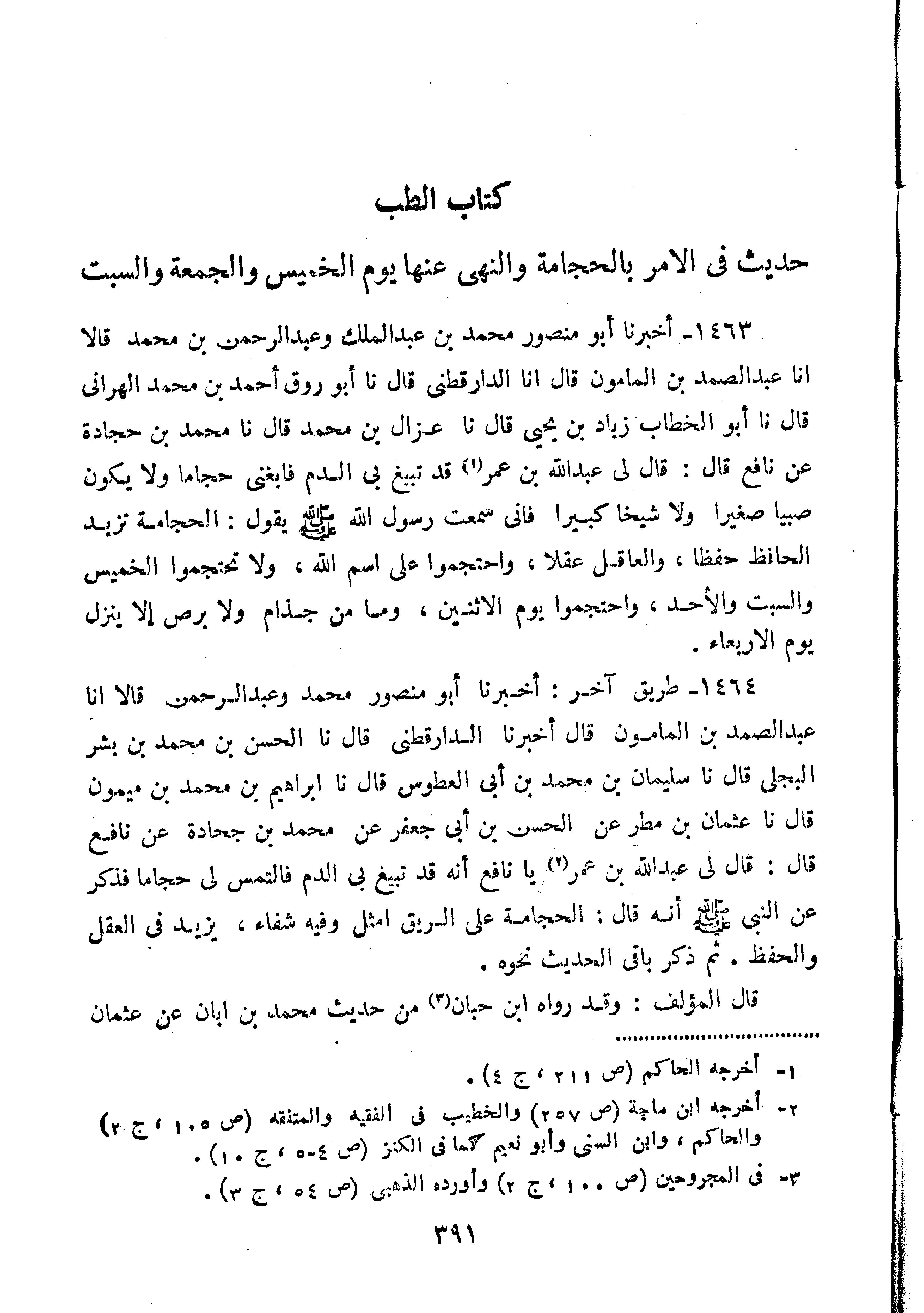 1463-أَخْبَرَنَا أَبُو مَنْصُورٍ مُحَمَّدُ بْنُ عَبْدِ الْمَلِكِ وَعَبْدُ الرَّحْمَنِ بْنُ مُحَمَّدٍ قَالا نا عَبْدُ الصَّمَدِ بْنُ الْمَأْمُونِ قَالَ أَنَا الدَّارَقُطْنِيُّ قَالَ نا أَبُو رَوْقٍ أَحْمَدُ بْنُ مُحَمَّدٍ الْهَرَّانِيُّ قَالَ نا أَبُو الْخَطَّابِ زِيَادُ بْنُ يَحْيَى قَالَ نا عَزَالُ بْنُ مُحَمَّدٍ قَالَ نا مُحَمَّدُ بْنُ حُجَادَةَ عَنْ نَافِعٍ قَالَ: قَالَ لِي عَبْدُ اللَّهِ بْنُ عُمَرَ قد تبيع بي الدَّمِّ فَأَبْغِنِي حَجَّامًا وَلا يَكُونُ صَبِيًّا صَغِيرًا وَلا شَيْخًا كَبِيرًا فإنس سَمِعْتُ رَسُولَ اللَّهِ صَلَّى اللَّهُ عَلَيْهِ وَسَلَّمَ يَقُولُ "الْحِجَامَةُ تَزِيدُ الْحَافِظَ حِفْظًا وَالْعَاقِلَ عَقْلا وَاحْتَجِمُوا عَلَى اسْمِ اللَّهِ وَلا تَحْتَجِمُوا الْخَمِيسَ وَالسَّبْتَ وَالأَحَدَ وَاحْتَجِمُوا يَوْمَ الاثْنَيْنِ وَمَا مِنْ جُذَامٍ وَلا بَرَصٍ إِلا يَنْزِلُ يَوْمَ الأَرْبِعَاءِ".