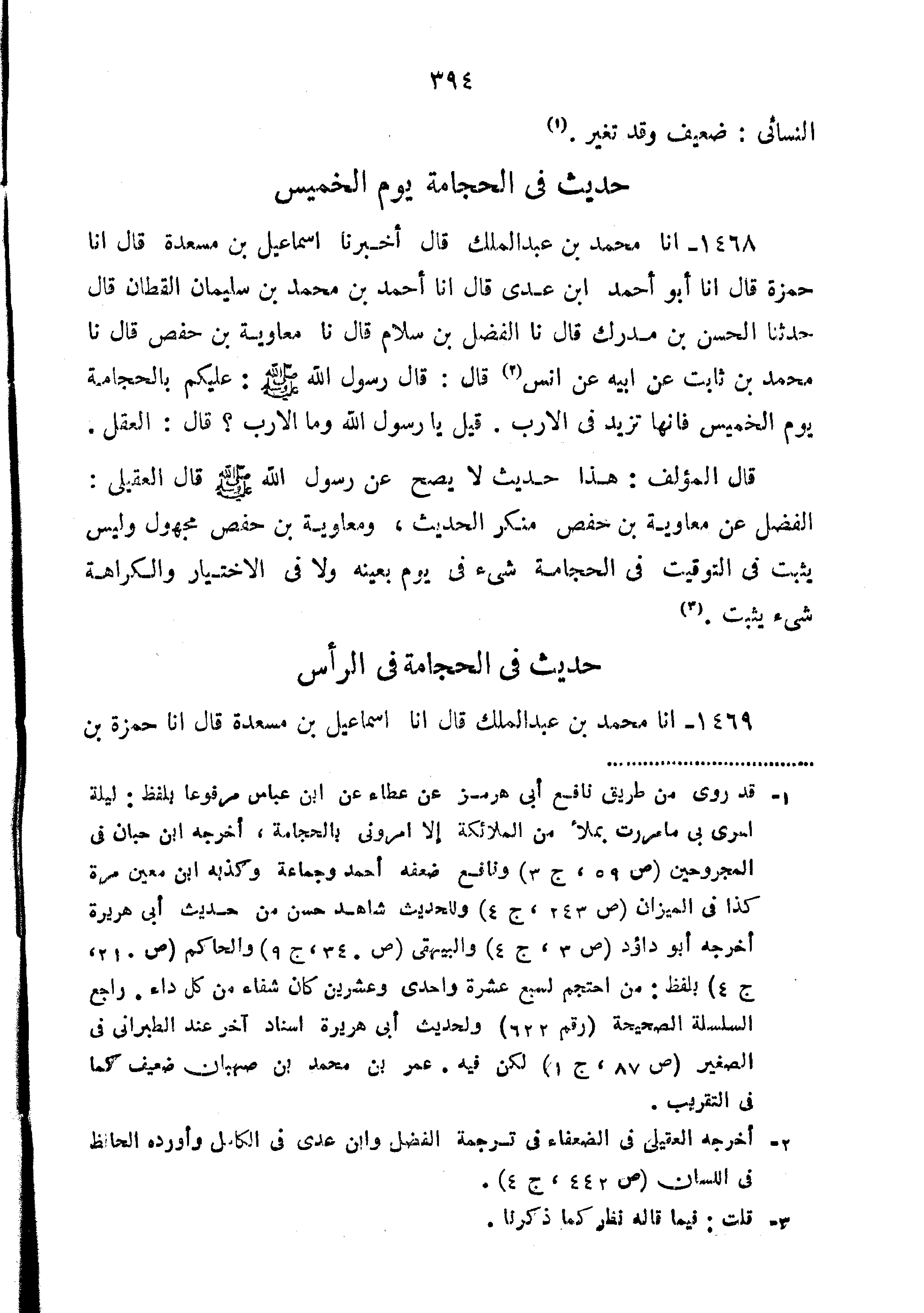 قال العقيلي: "الفضل عن مُعَاوِيَة بْن حَفْص منكر الحديث ومعاوية بْن حَفْص مجهول وليس يثبت فِي التوقيت فِي الحجامة شيء فِي يوم بعينه ولا فِي الاختيار والكراهة شيء يثبت".