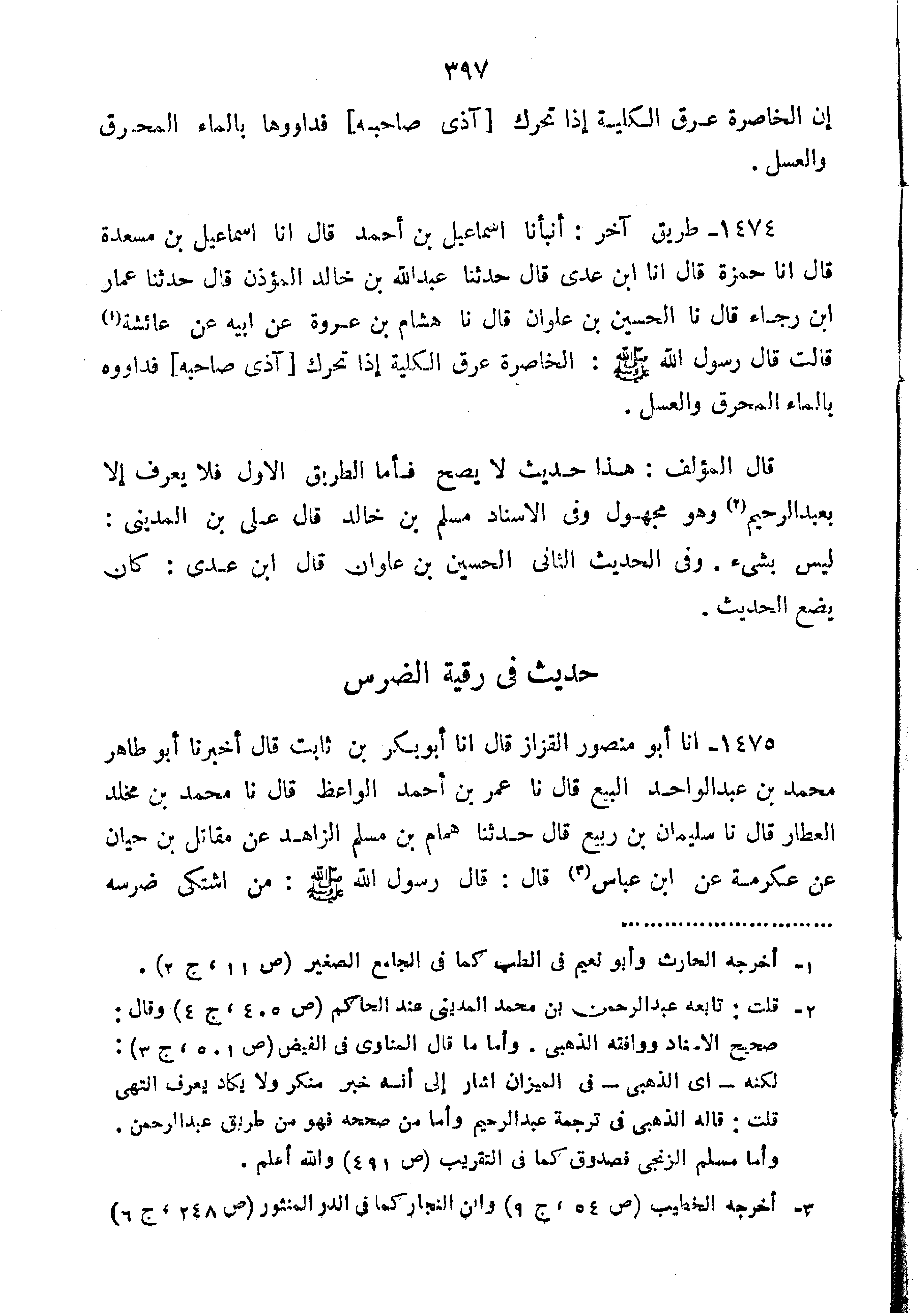 1474-طَرِيقٌ آخَرُ أَنْبَأَنَا إِسْمَاعِيلُ بْنُ أَحْمَدَ قَالَ أَنَا إِسْمَاعِيلُ بْنُ مَسْعَدَةَ قَالَ أَنَا حَمْزَةُ قَالَ أَنَا ابْنُ عَدِيٍّ قَالَ حَدَّثَنَا عَبْدُ اللَّهِ بْنُ خَالِدٍ الْمُؤَذِّنُ قَالَ حَدَّثَنَا عَمَّارُ بْنُ رَجَاءَ قَالَ نا الْحُسَيْنُ بْنُ عُلْوَانَ قَالَ نا هِشَامُ بْنِ عُرْوَةَ عَنْ أَبِيهِ عَنْ عَائِشَةَ قَالَتْ قَالَ رَسُولُ اللَّهِ صَلَّى اللَّهُ عَلَيْهِ وَسَلَّمَ: "الْخَاصِرَةُ عِرْقُ الْكِلْيَةِ إِذَا تَحَرَّكَ آذَى صَاحِبَهُ فَدَاوُوهُ بِالْمَاءِ الْمُحَرَّقِ وَالْعَسَلِ".