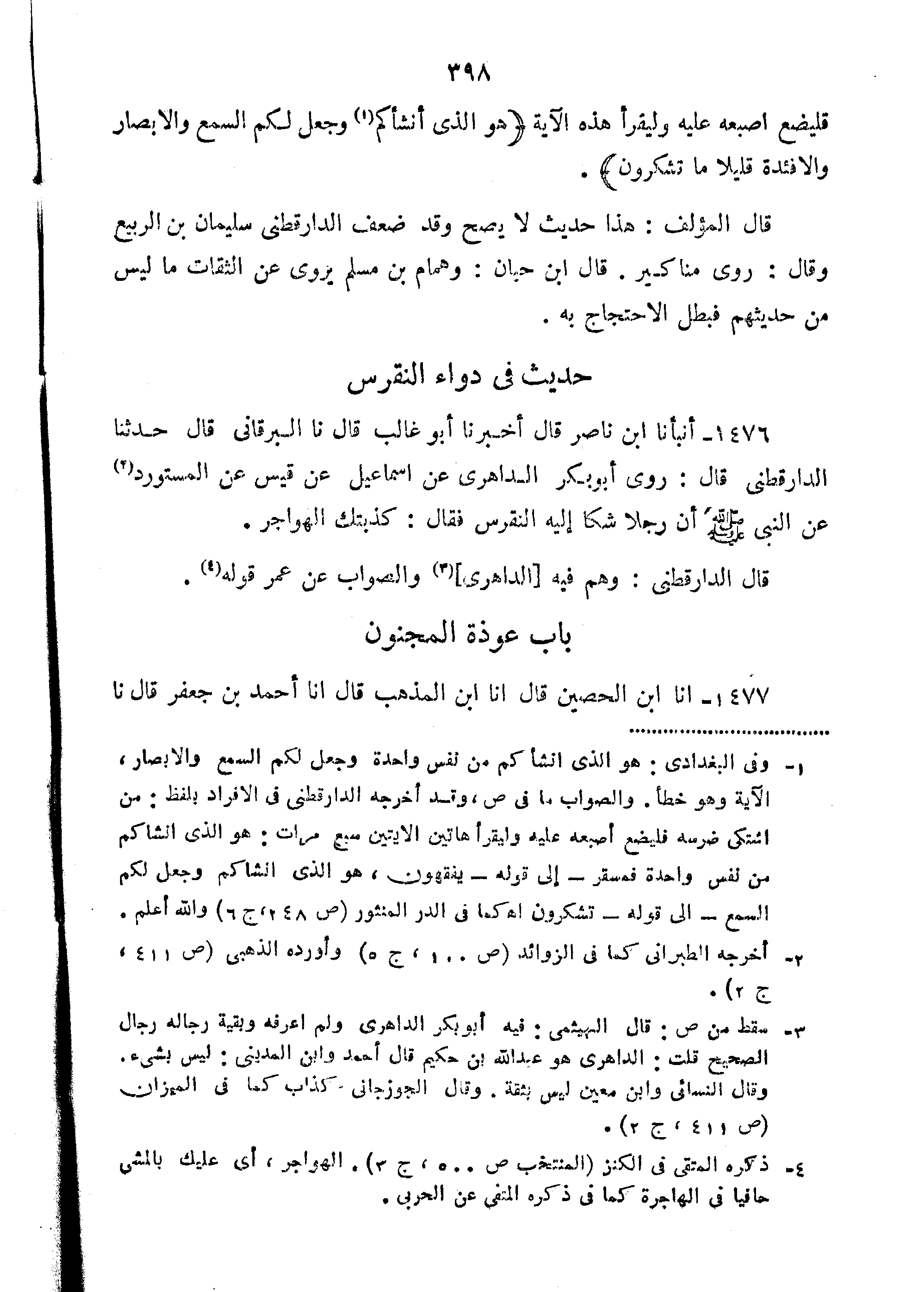 1476-أَنْبَأَنَا ابْنُ نَاصِرٍ قَالَ أَخْبَرَنَا أَبُو غَالِبٍ قَالَ نا الْبَرْقَانِيُّ قَالَ حَدَّثَنَا الدَّارَقُطْنِيُّ قَالَ رَوَى أَبُو بَكْرٍ الدَّاهِرِيُّ عَنْ إِسْمَاعِيلَ عَنْ قَيْسٍ عَنِ الْمُسْتَوْرِدِ عَنِ النَّبِيِّ صَلَّى اللَّهُ عَلَيْهِ وَسَلَّمَ إِنَّ رَجُلا شَكَا إِلَيْهِ النَّقْرَسَ فَقَالَ "كذبتك الهوا جر"